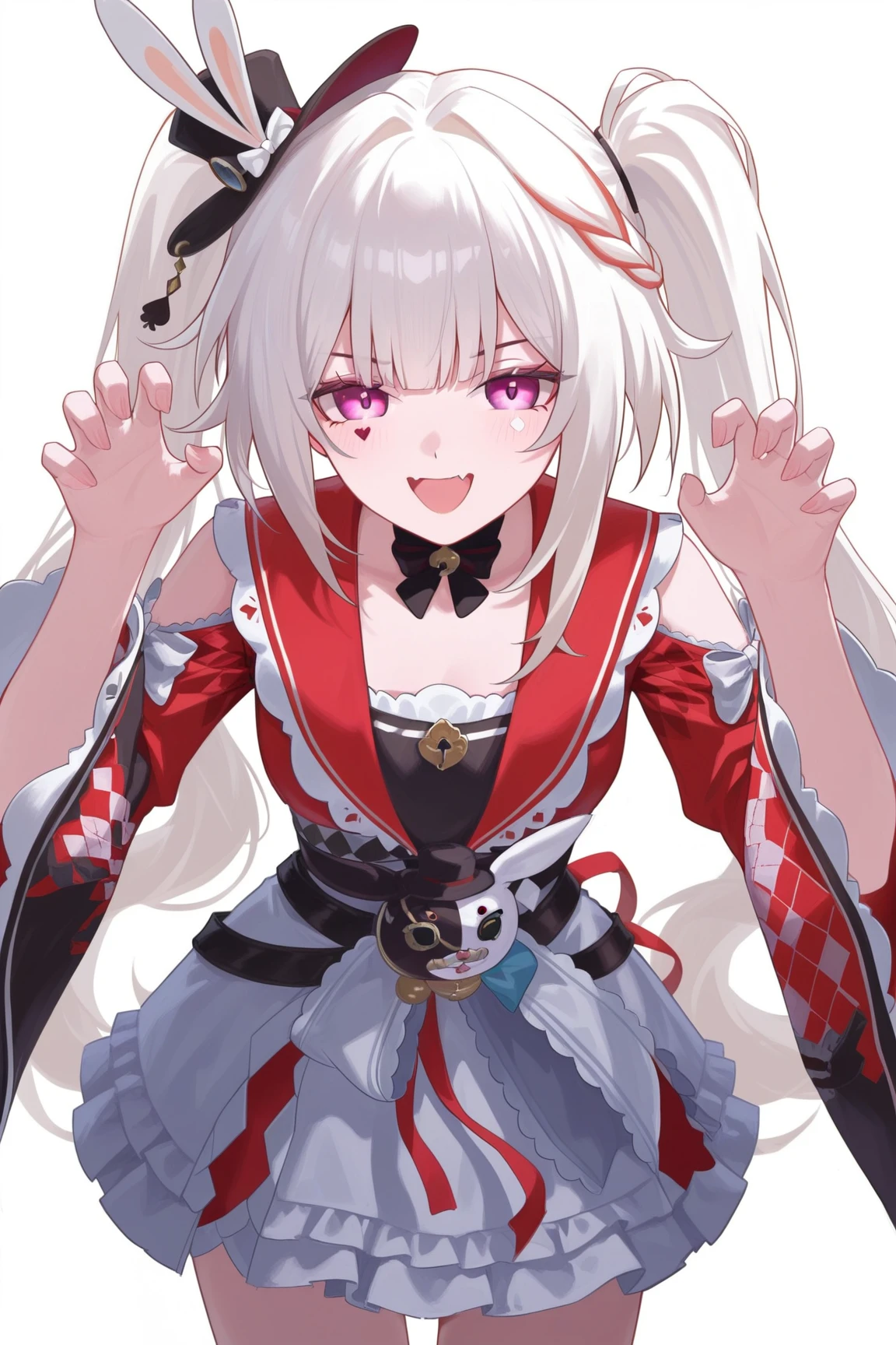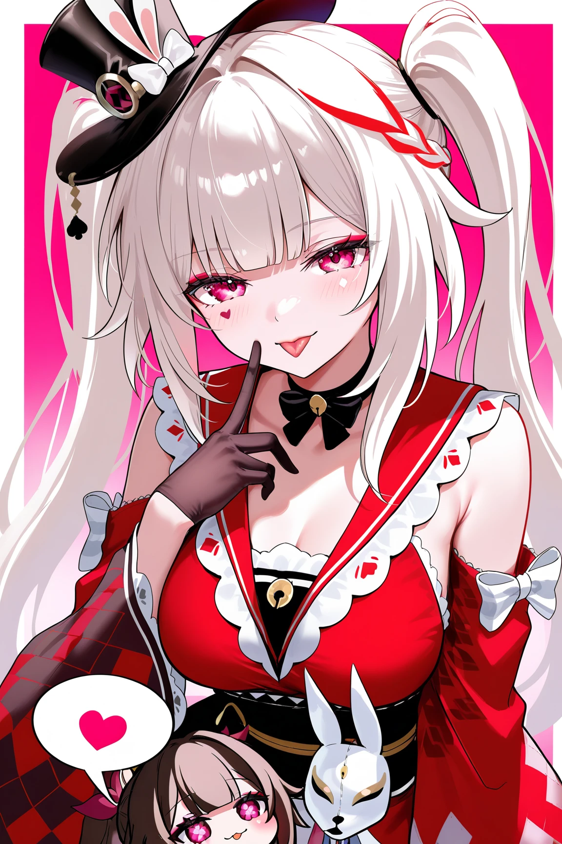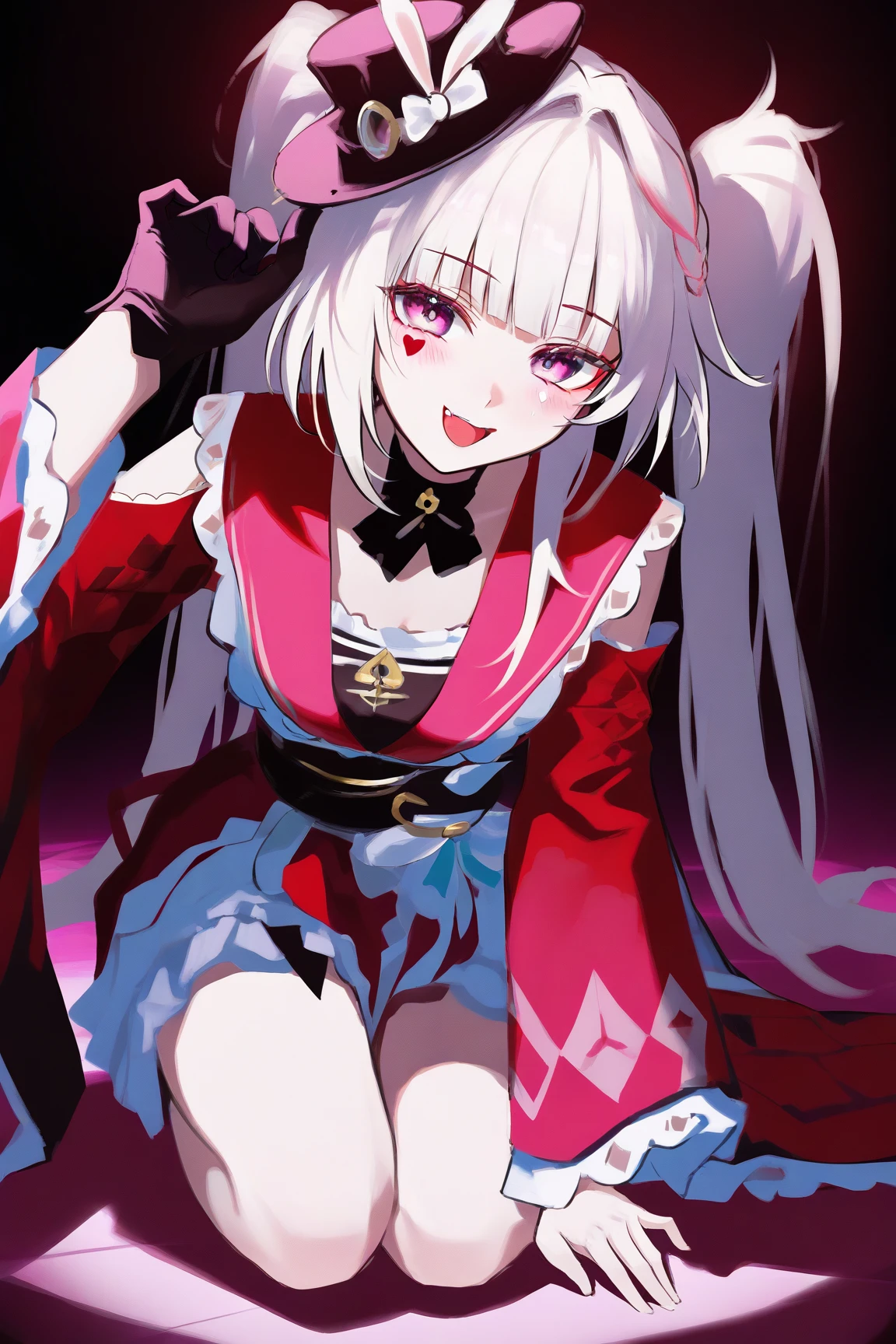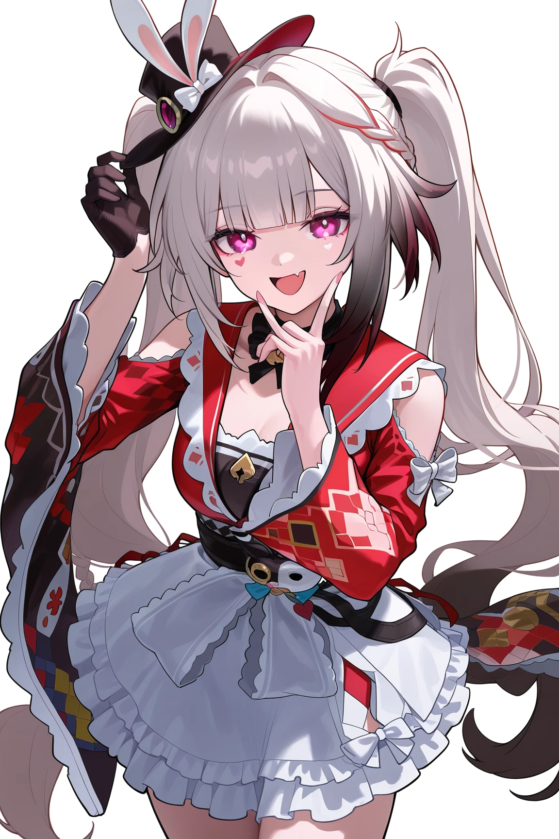 sparxie \(honkai star rail\), 1girl, twintails, hat, gloves, black gloves, long hair, top hat, multicolored hair, facial mark, pink eyes, braid, wide sleeves, black headwear, single glove, white hair, bow, sailor collar, multicolored hair, red shirt, grey hair, long sleeves, japanese clothes, rabbit ears, virtual youtuber