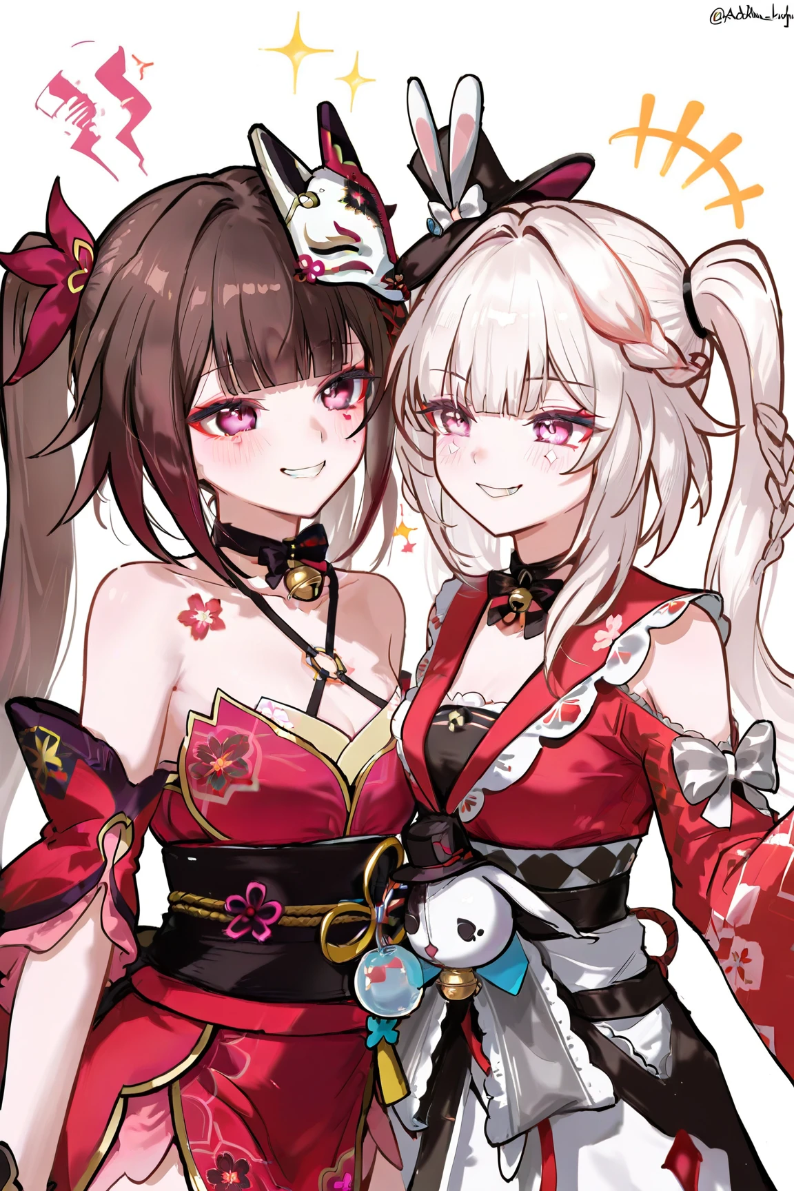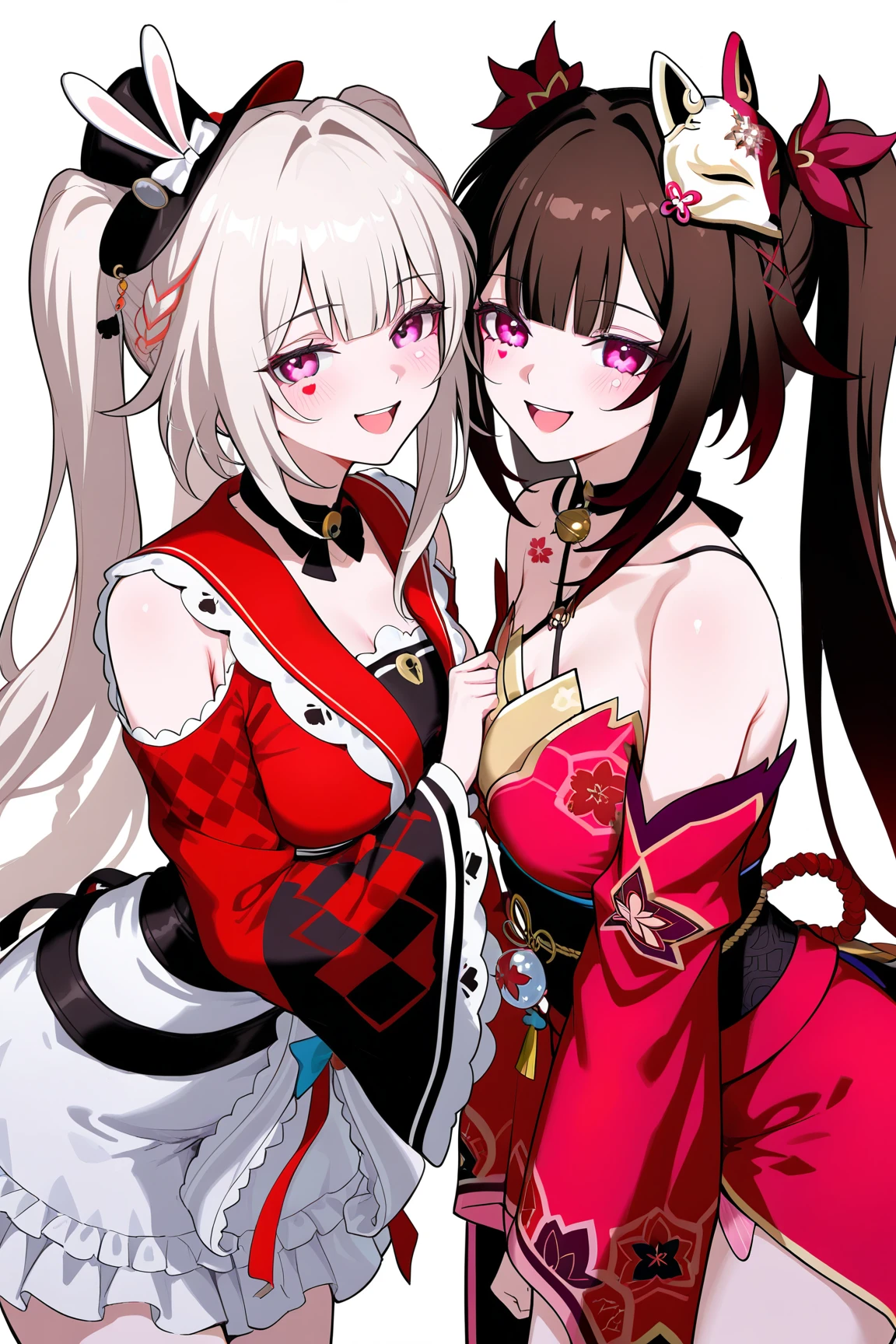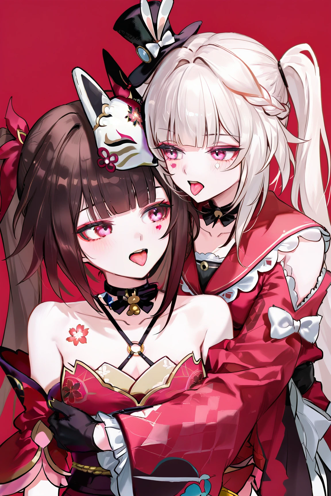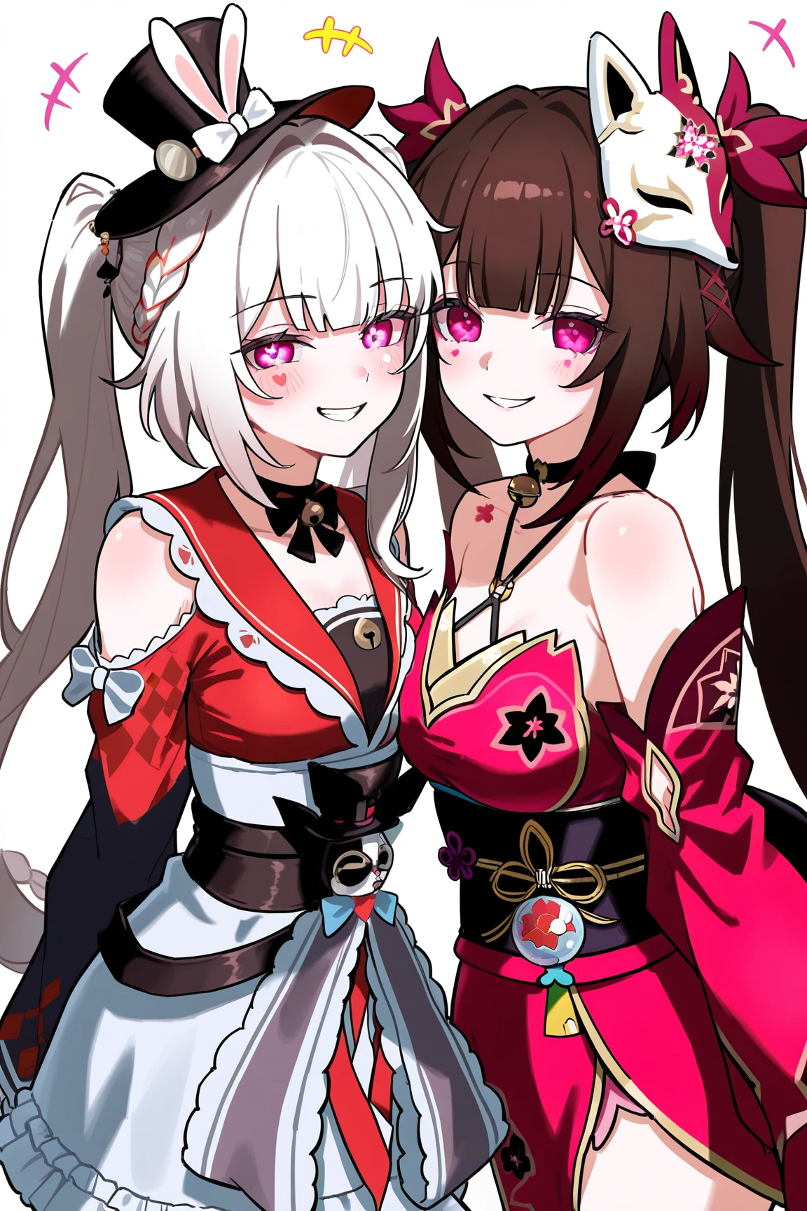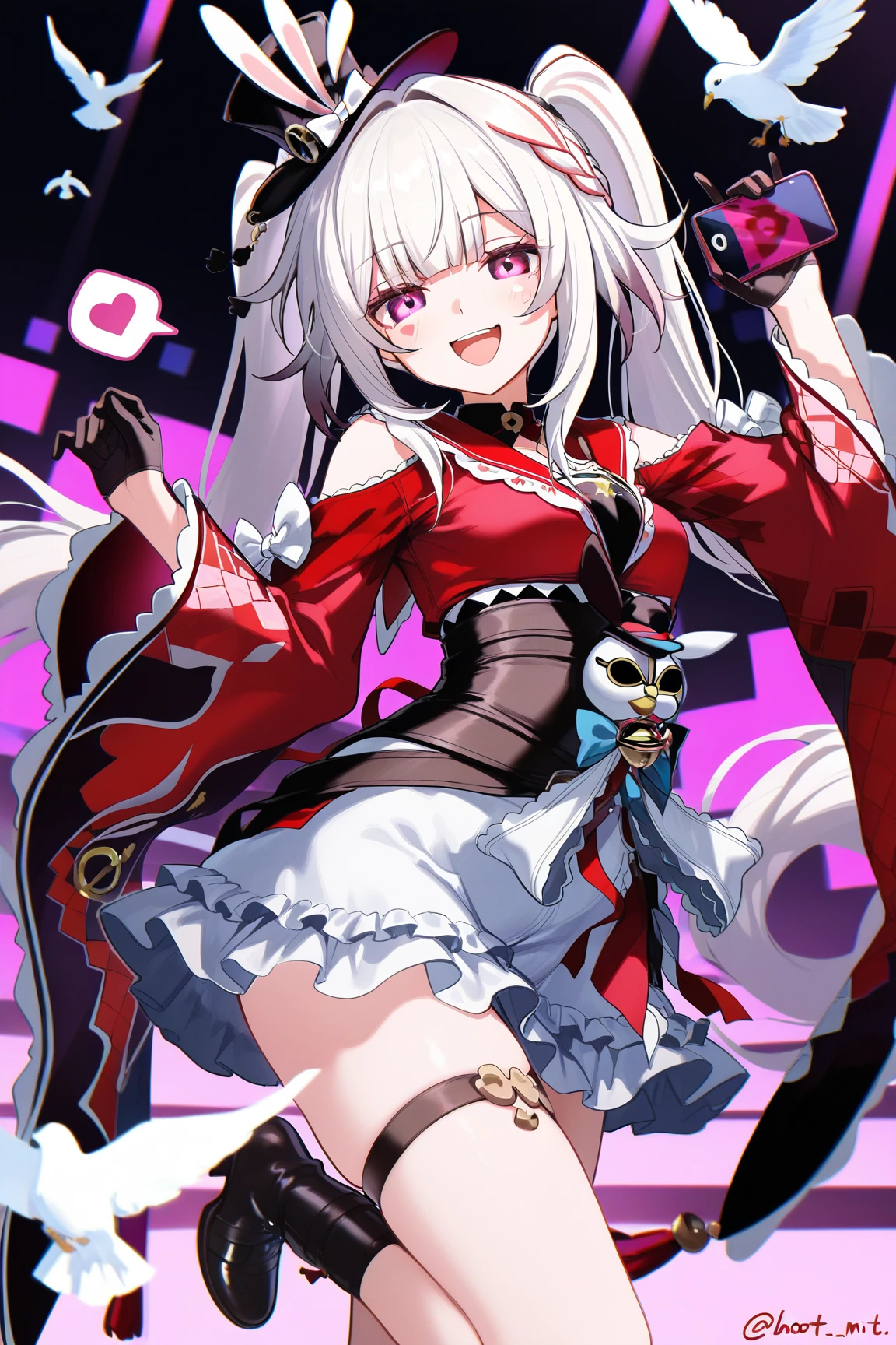 sparxie \(honkai star rail\), 1girl, twintails, hat, gloves, black gloves, long hair, top hat, multicolored hair, facial mark, pink eyes, braid, wide sleeves, black headwear, single glove, white hair, bow, sailor collar, multicolored hair, red shirt, grey hair, long sleeves, japanese clothes, rabbit ears, virtual youtuber