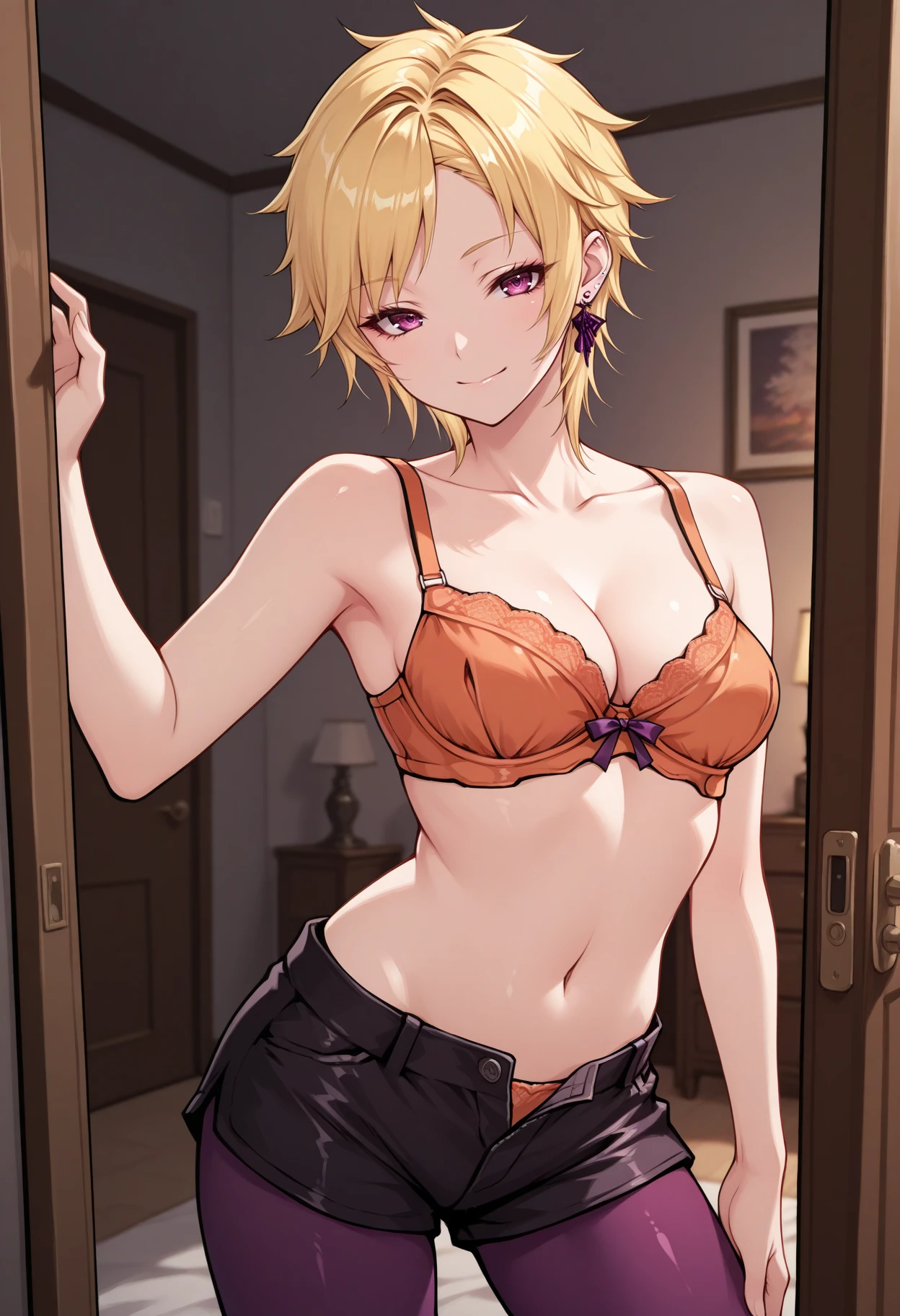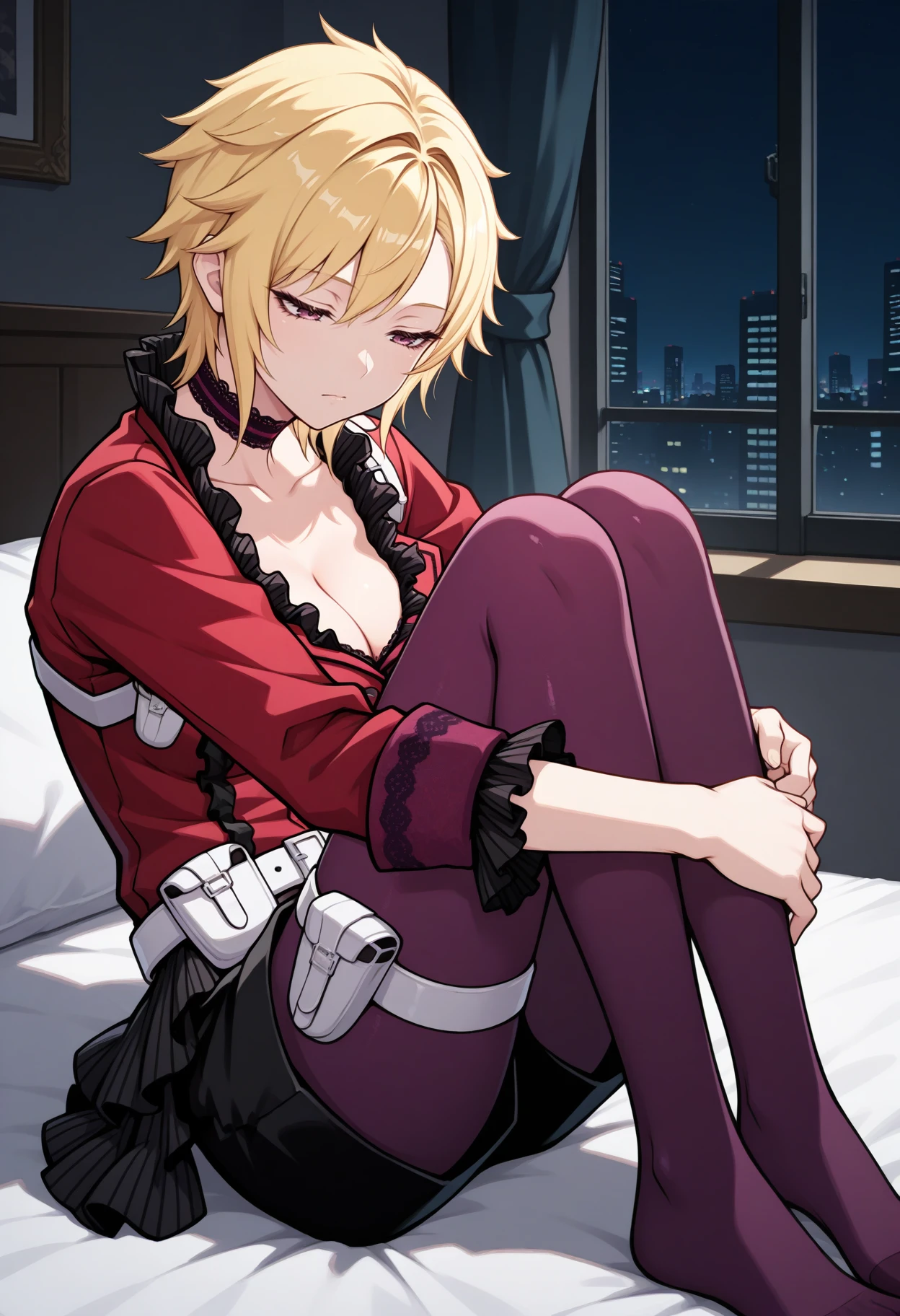 Default appearance: defMilady, blonde hair, short hair, purple eyes, earrings, choker, red jacket, medium breasts, frills, frilled sleeves, orange gloves, half gloves, white belt, belt pouch, black skirt, black shorts, purple pantyhose, thigh strap, thigh pouch