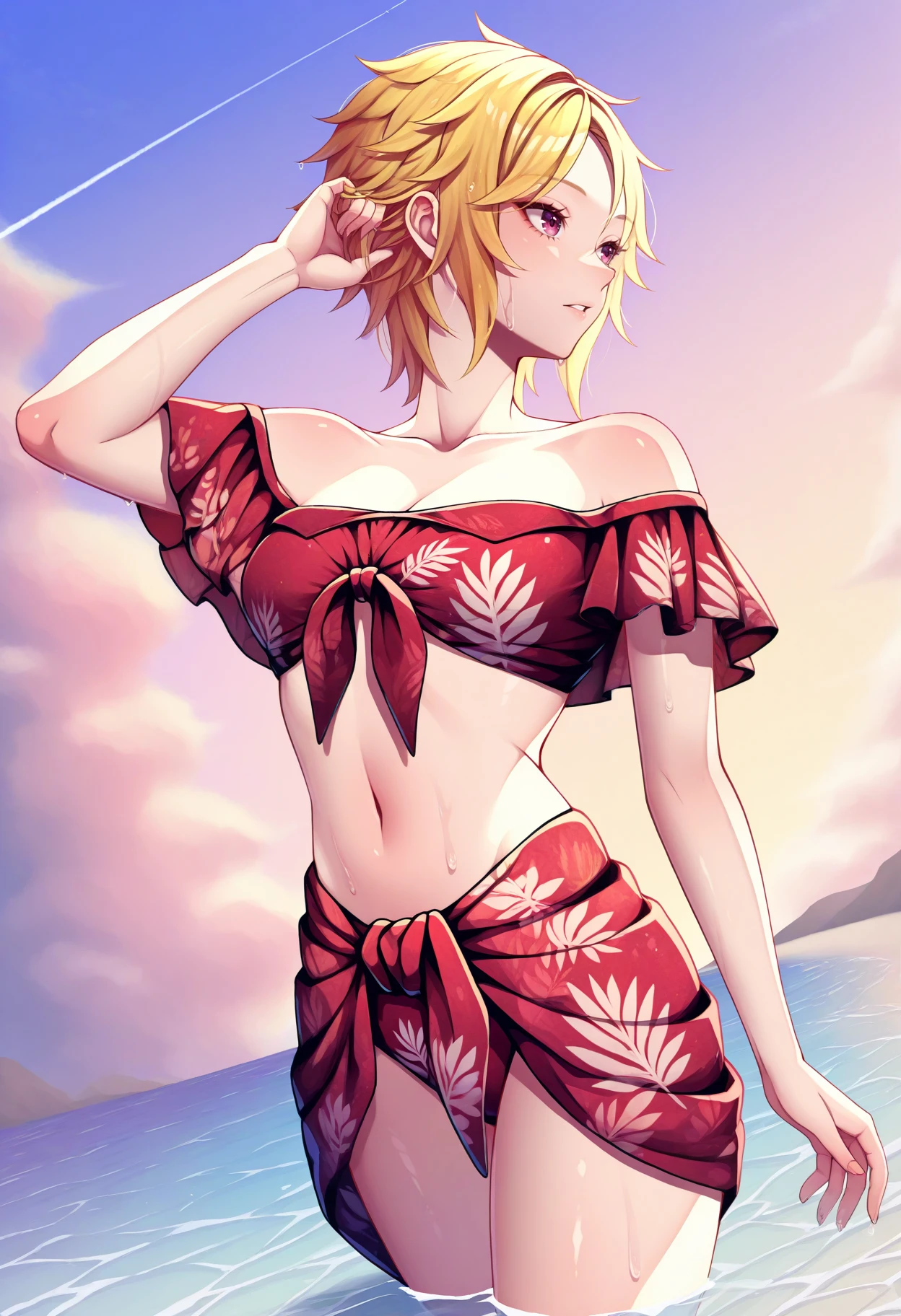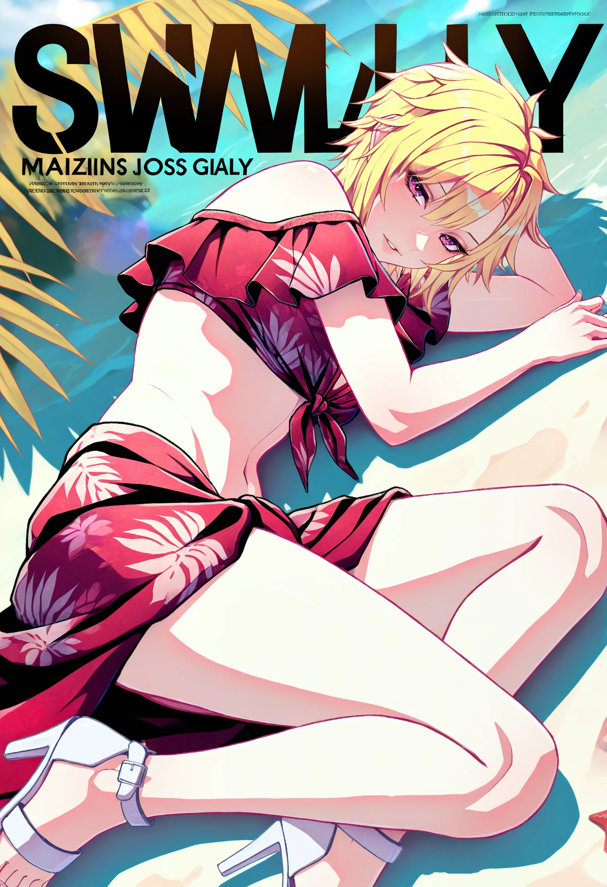 swmMilady, blonde hair, short hair, purple eyes, red bikini, off-shoulder bikini, print bikini, front-tie top, midriff, red sarong, sandals, high heels, white footwear