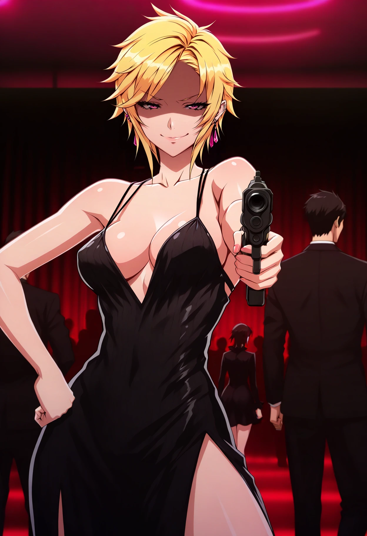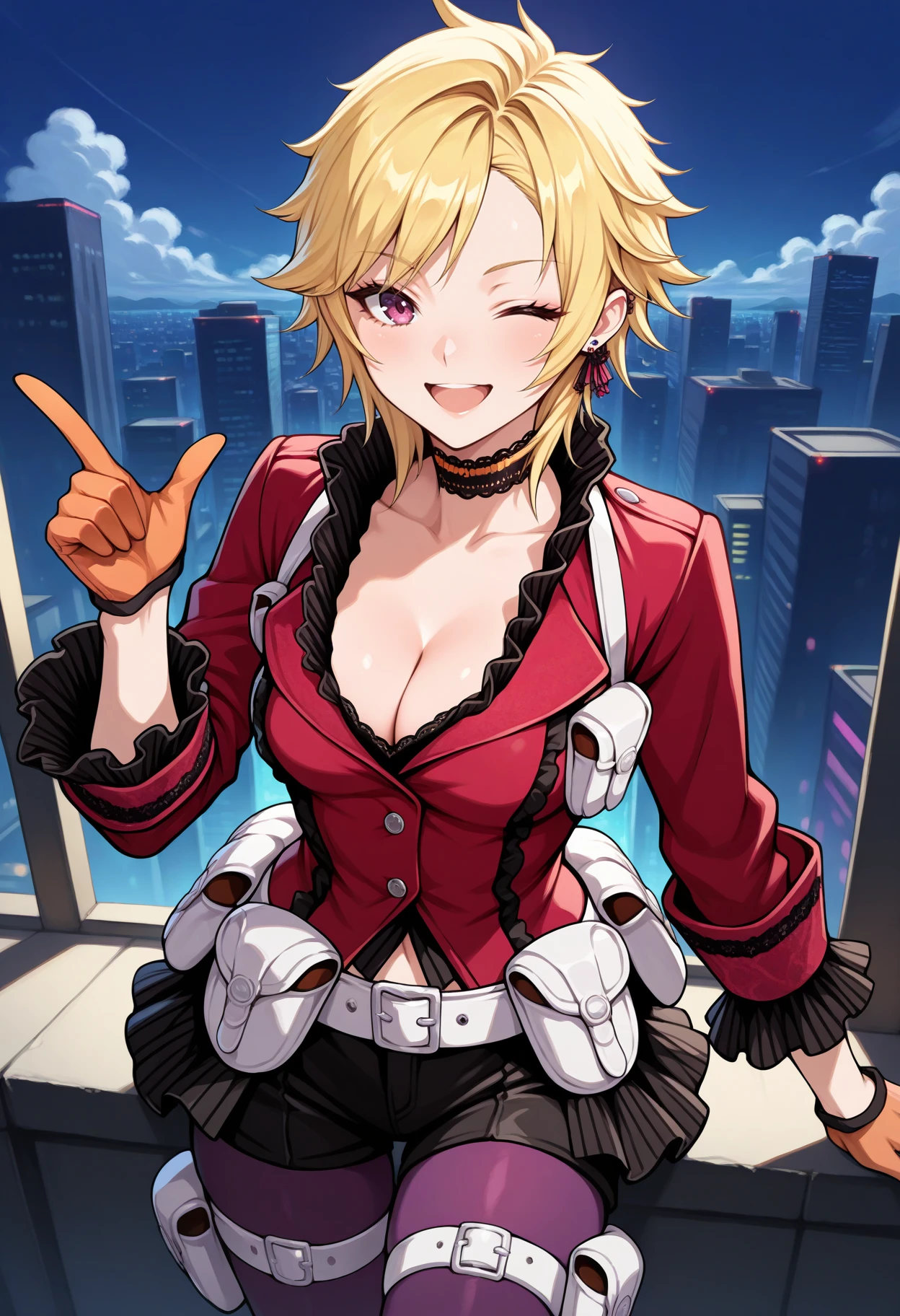 defMilady, blonde hair, short hair, purple eyes, earrings, choker, red jacket, medium breasts, frills, frilled sleeves, orange gloves, half gloves, white belt, belt pouch, black skirt, black shorts, purple pantyhose, thigh strap, thigh pouch