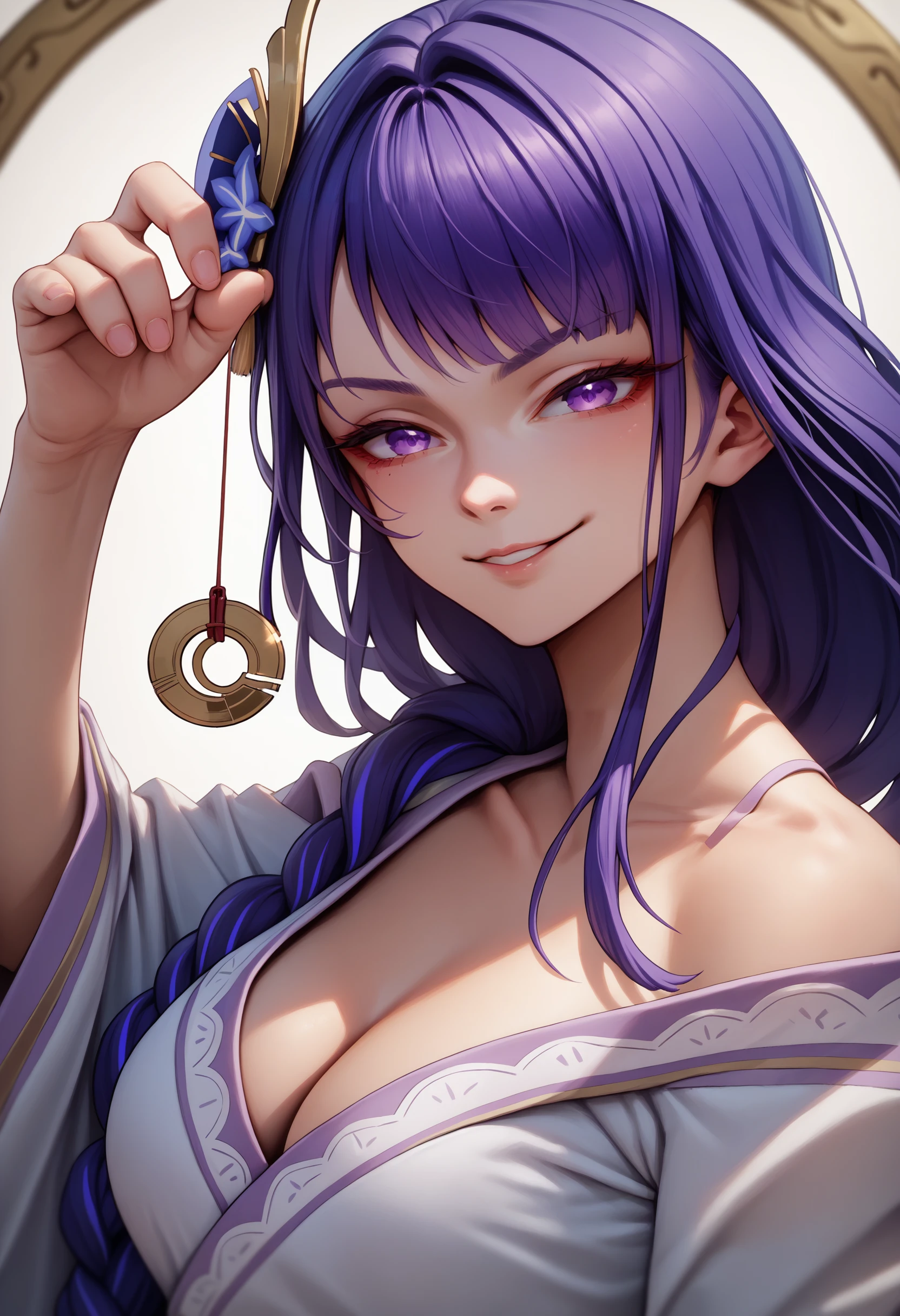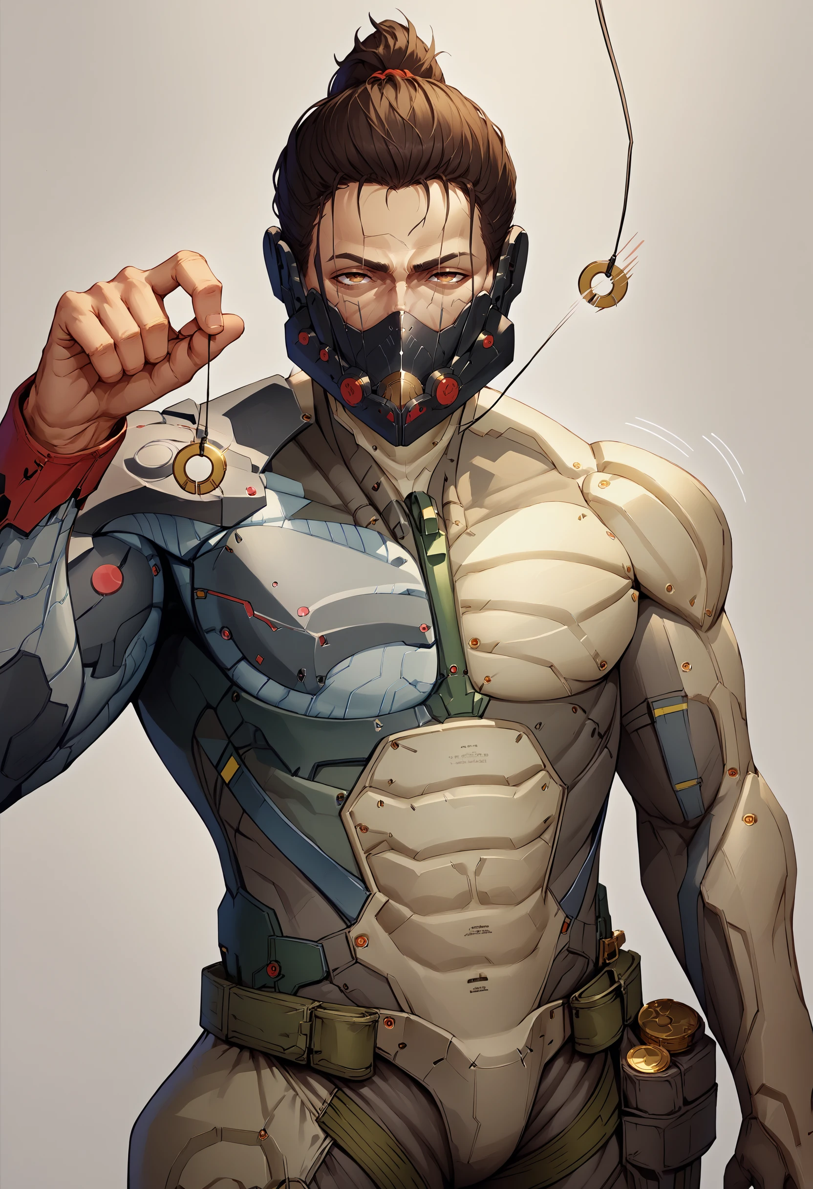 pendulum, coin on string, holding string, hand up, looking at viewer