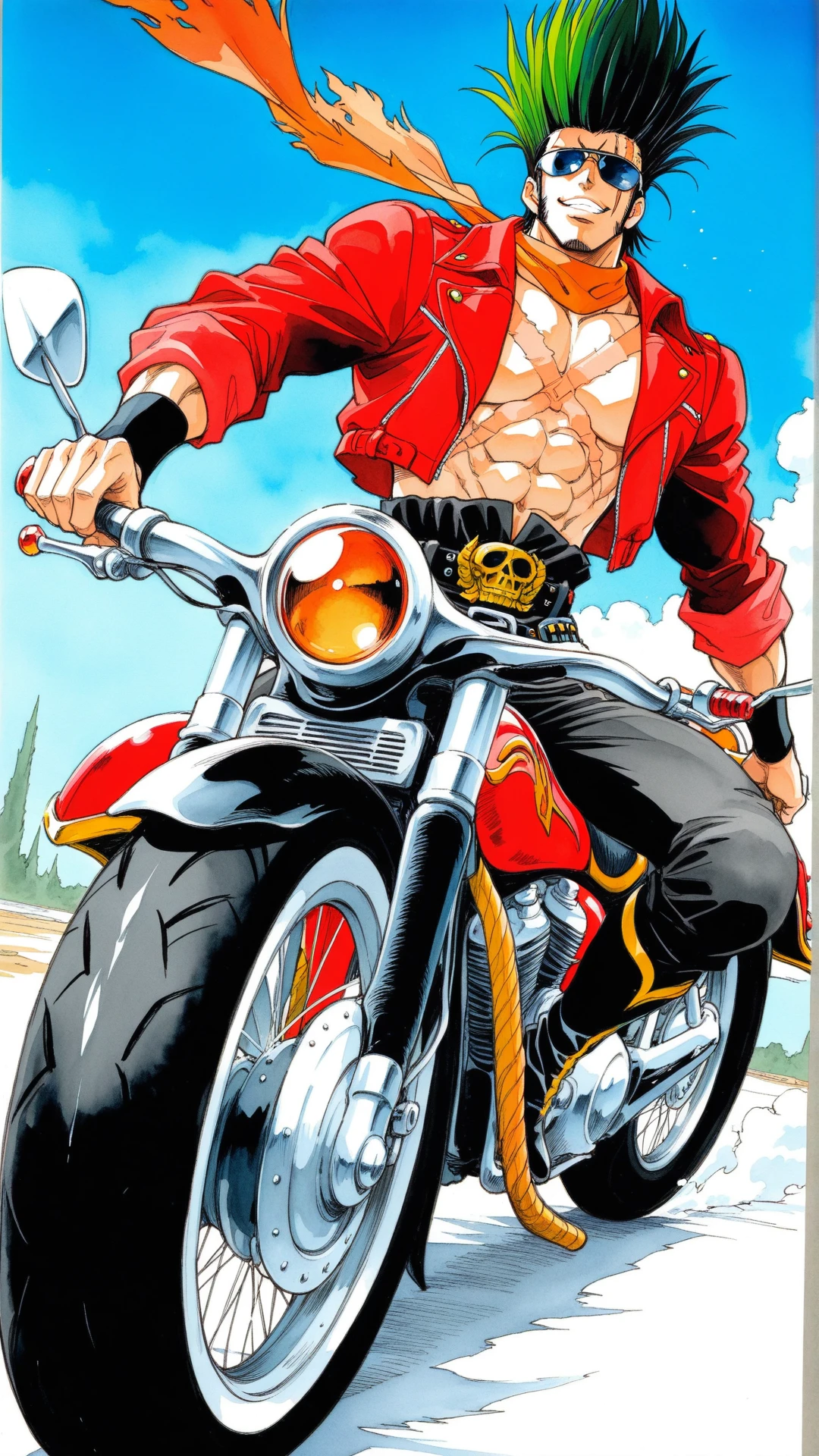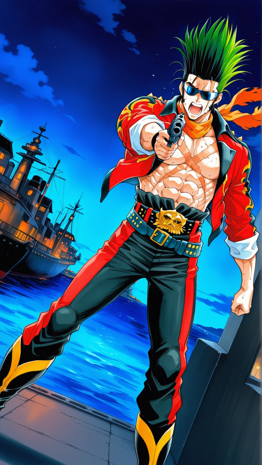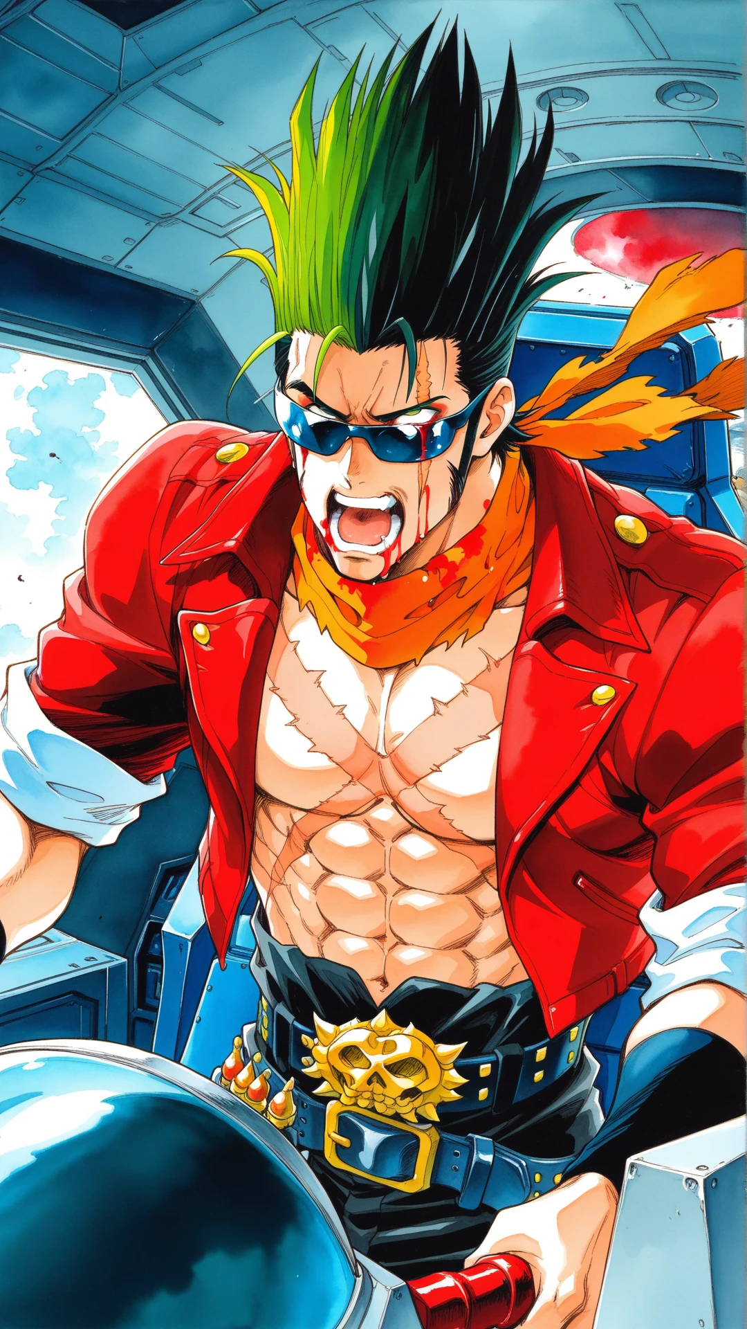 sunglasses,belt, jacket, boots, red jacket, scar on chest, orange scarf,