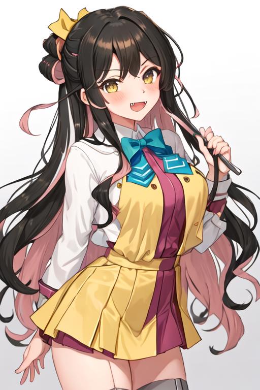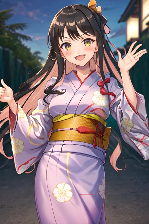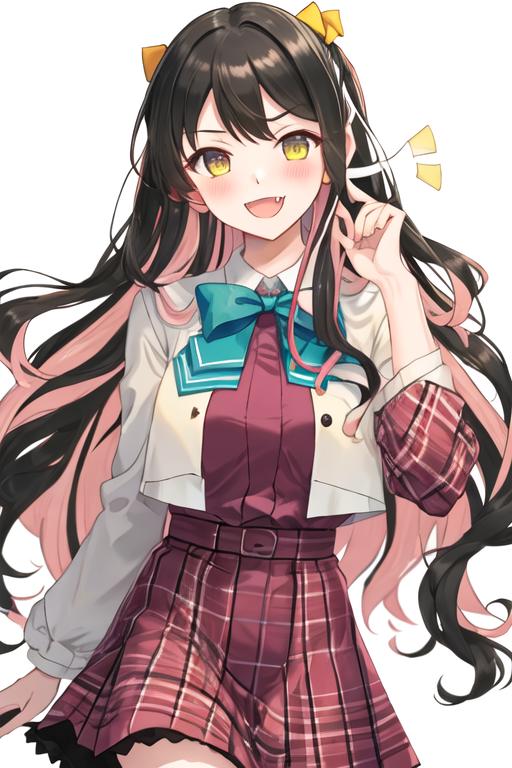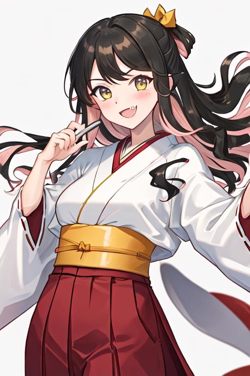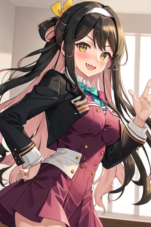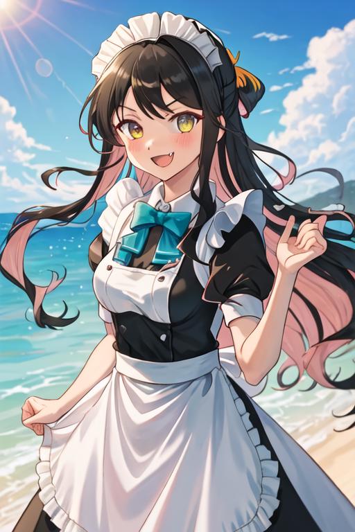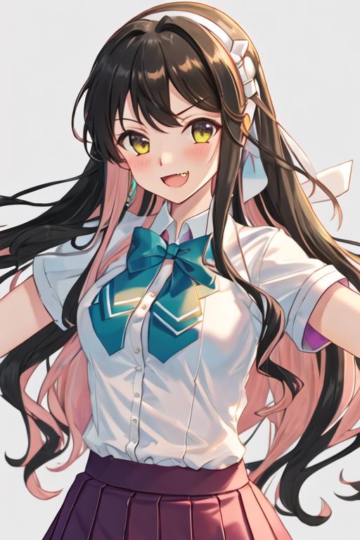 The trigger word is naganami_kantaicollection, and the recommended tags are best quality, masterpiece, highres, solo, {naganami_kantaicollection:1.15}, multicolored_hair, pink_hair, black_hair, long_hair, two-tone_hair, yellow_eyes, smile, fang, wavy_hair, ribbon, open_mouth, bow, blush, breasts, hair_ribbon.