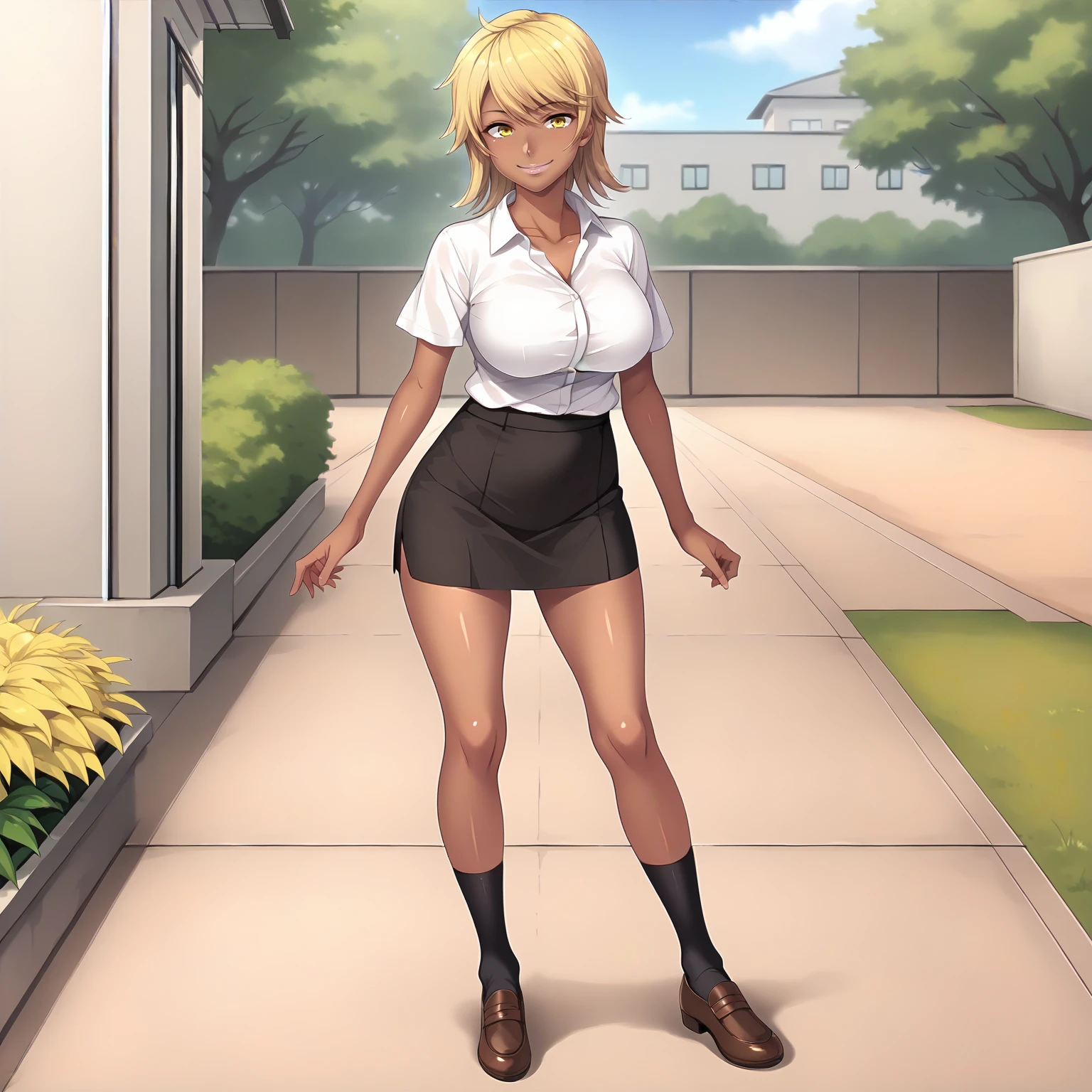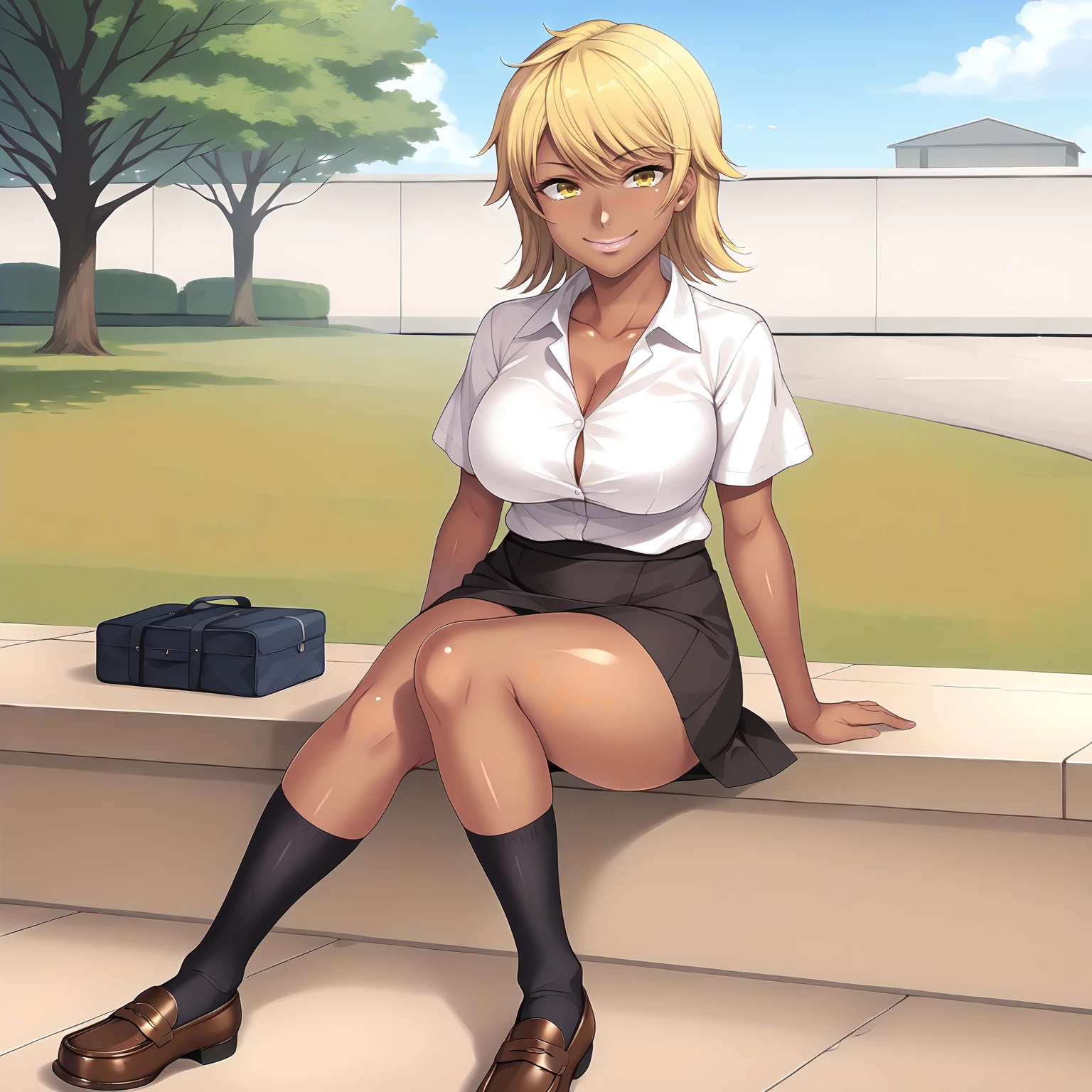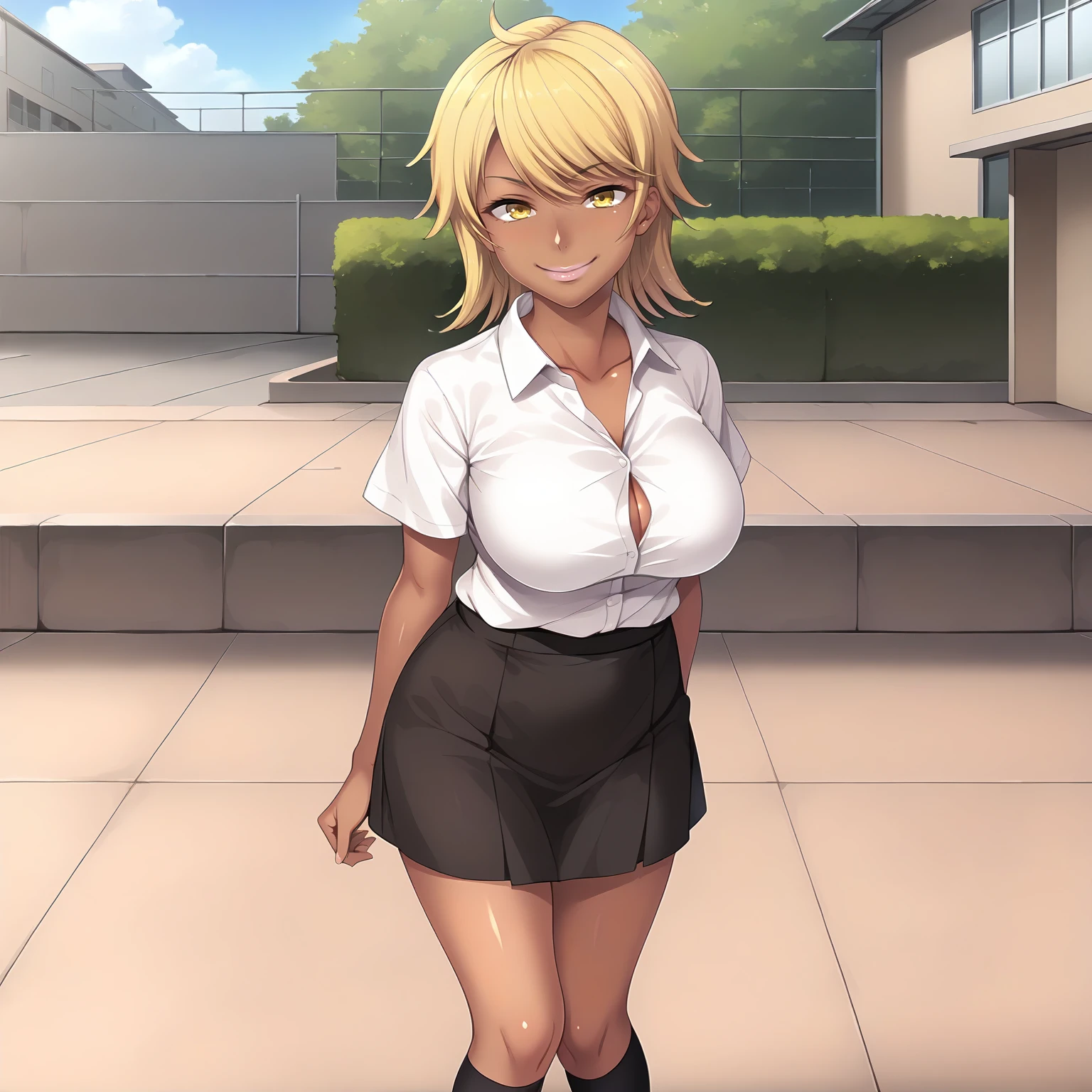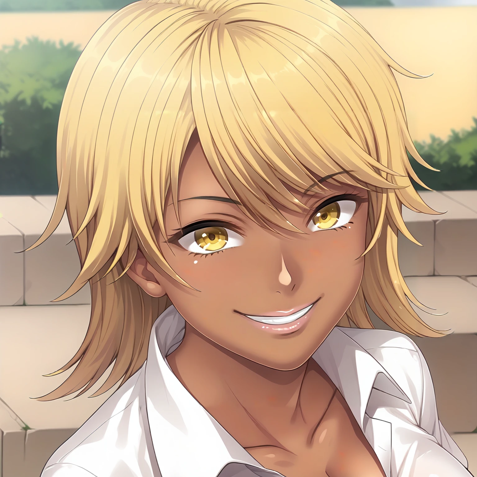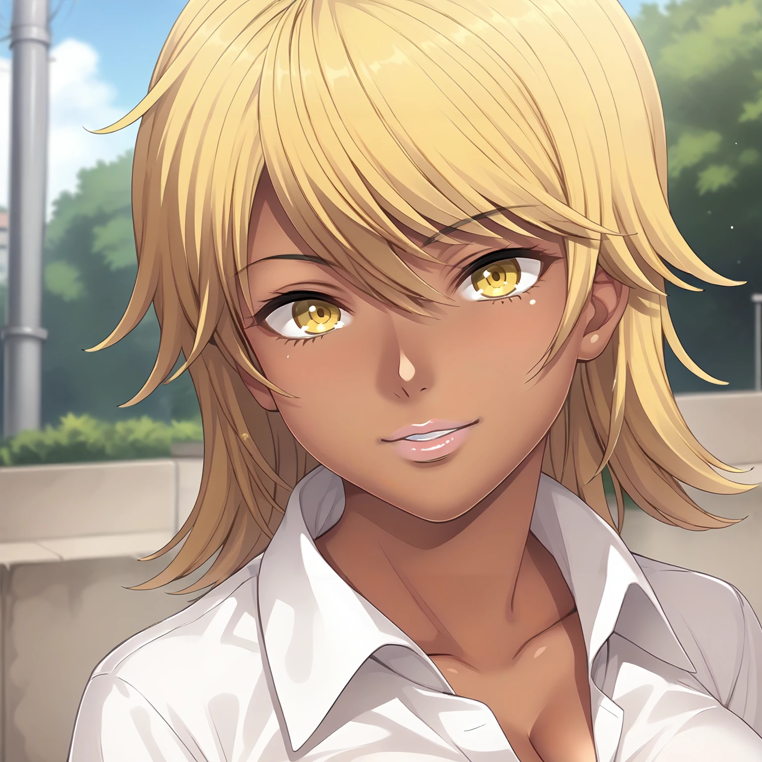 SakiNagase,1girl,blonde hair,medium hair,yellow eyes,dark skin,large breasts,