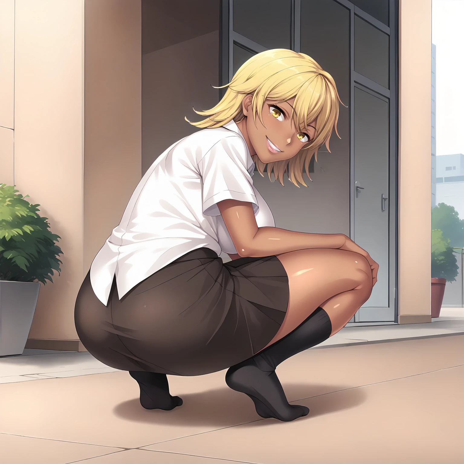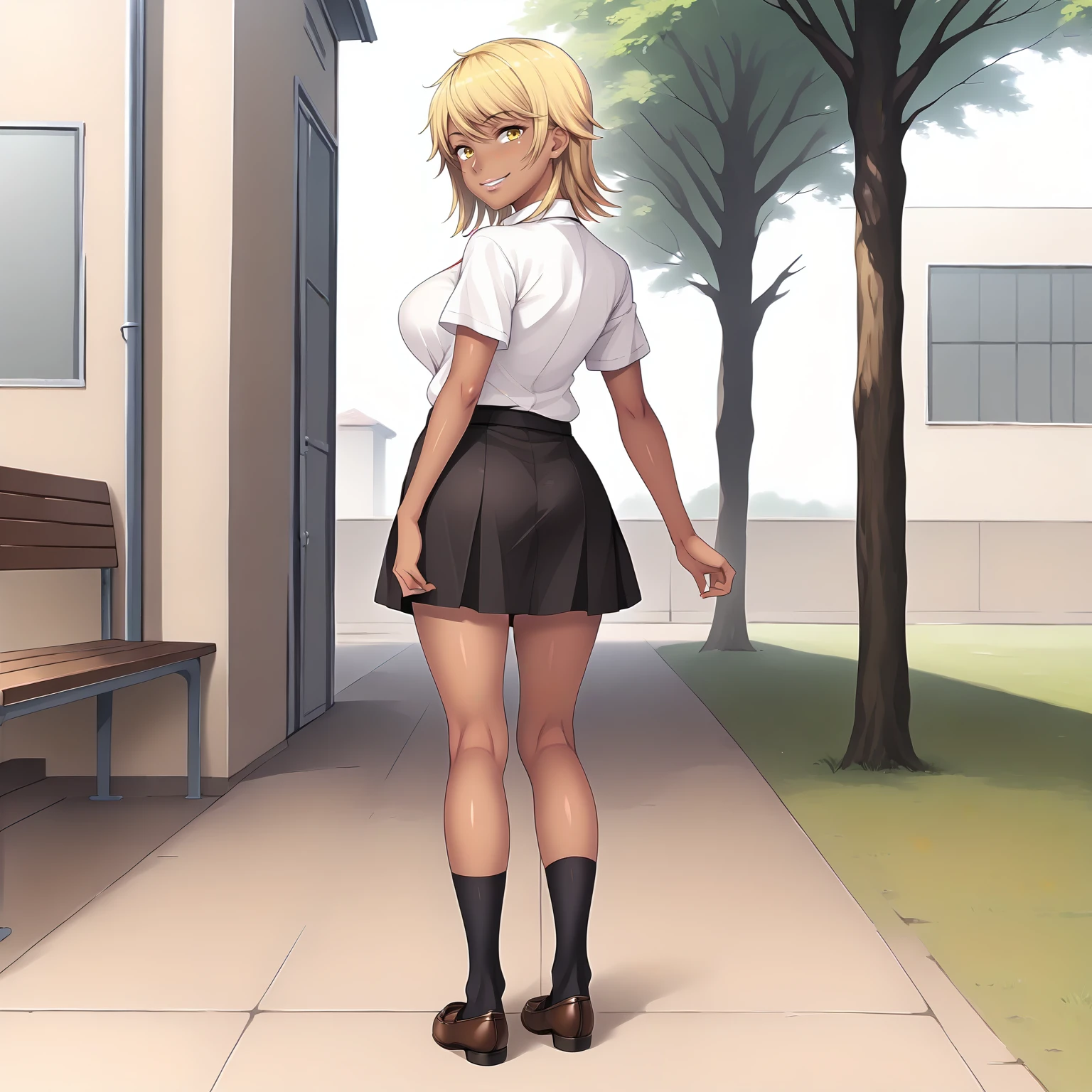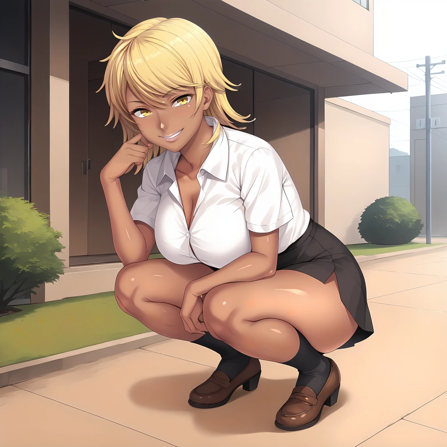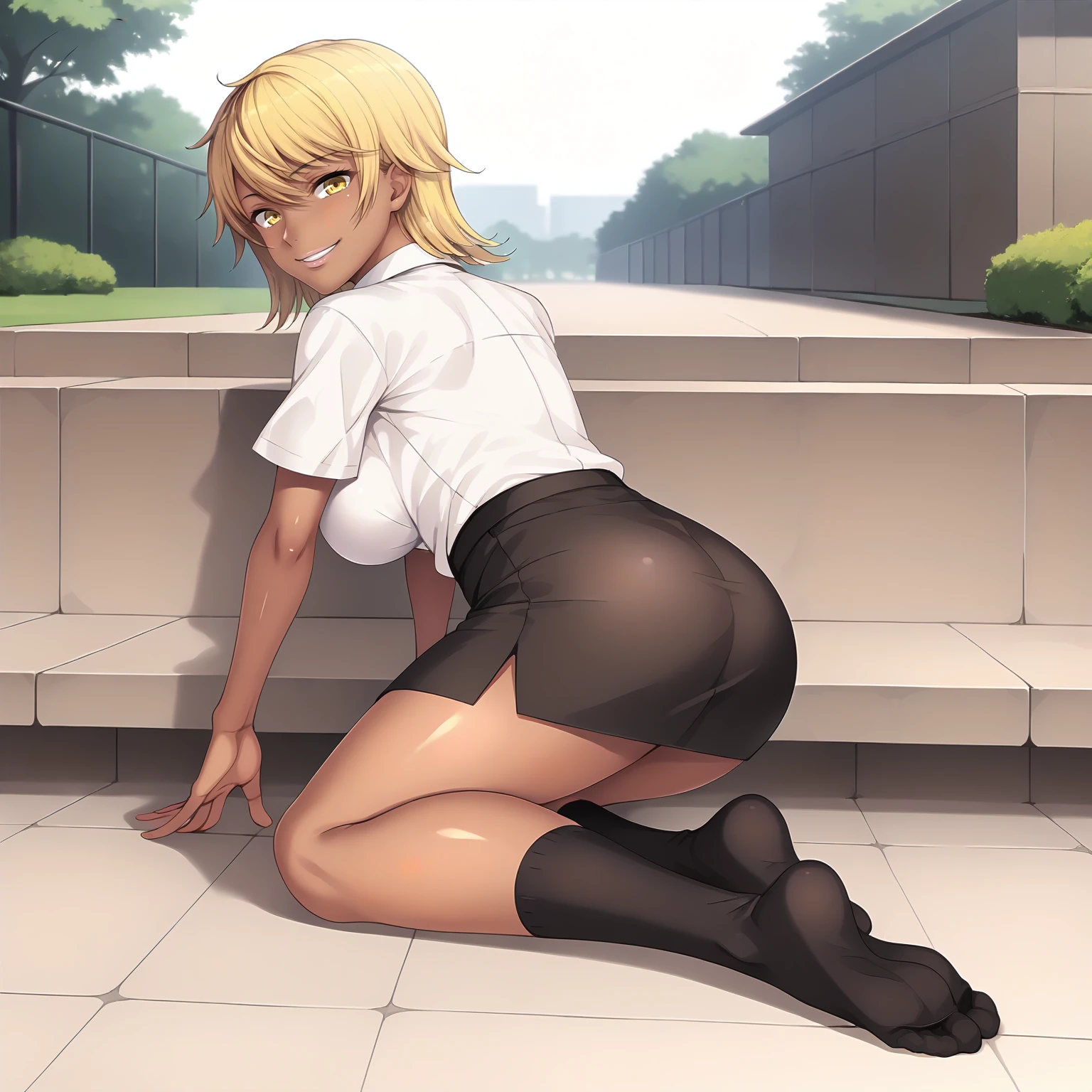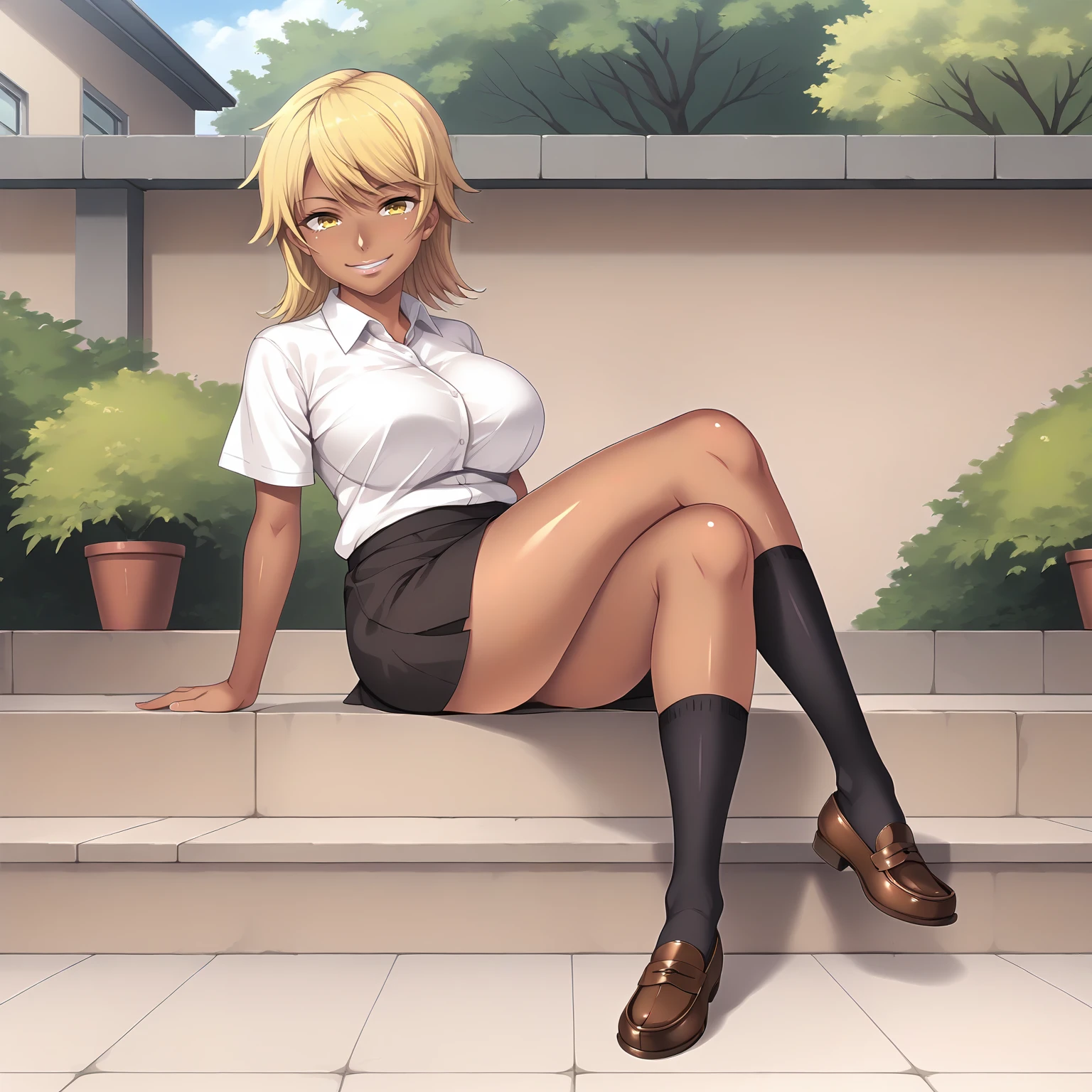 SakiNagase,1girl,blonde hair,medium hair,yellow eyes,dark skin,large breasts,