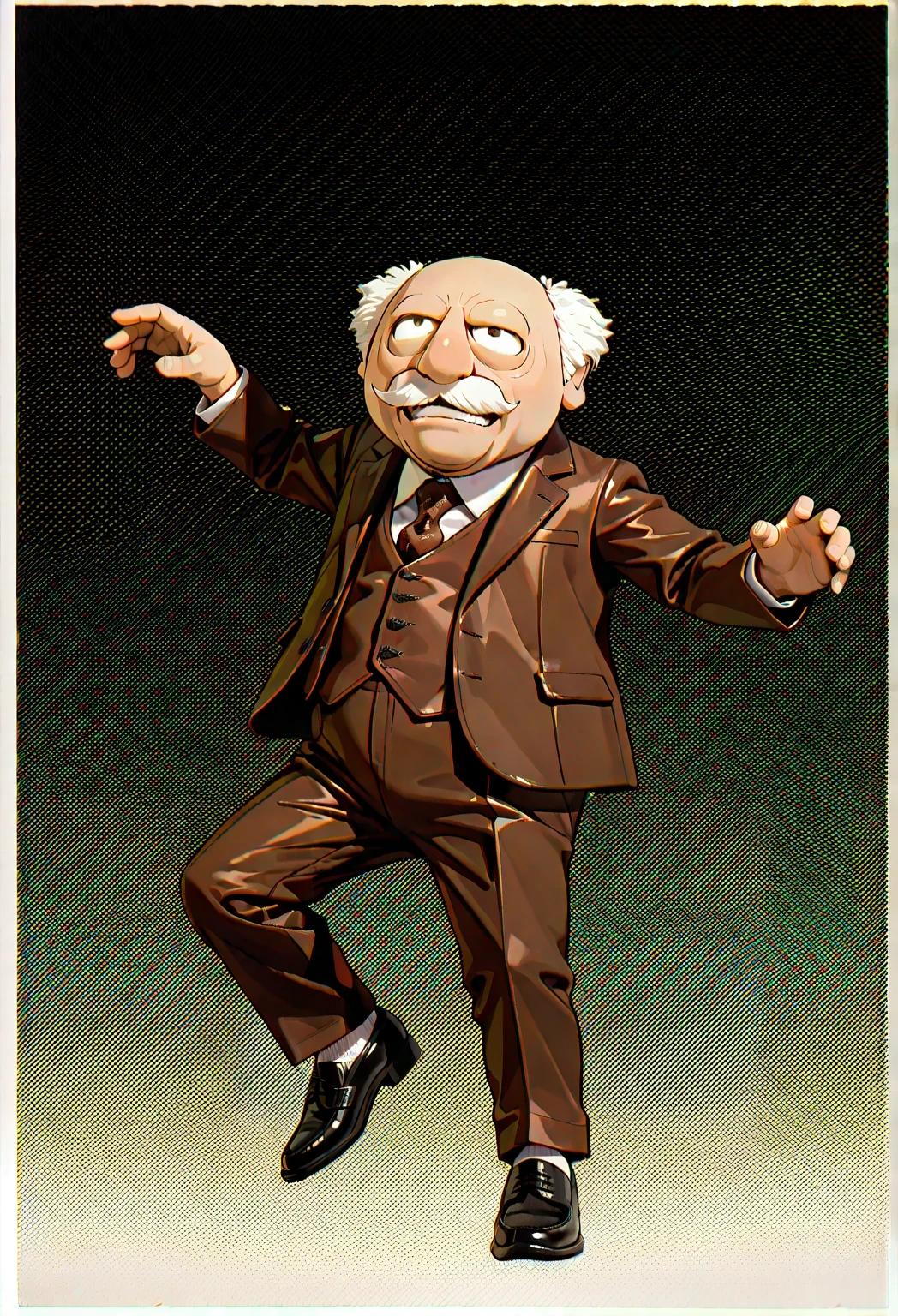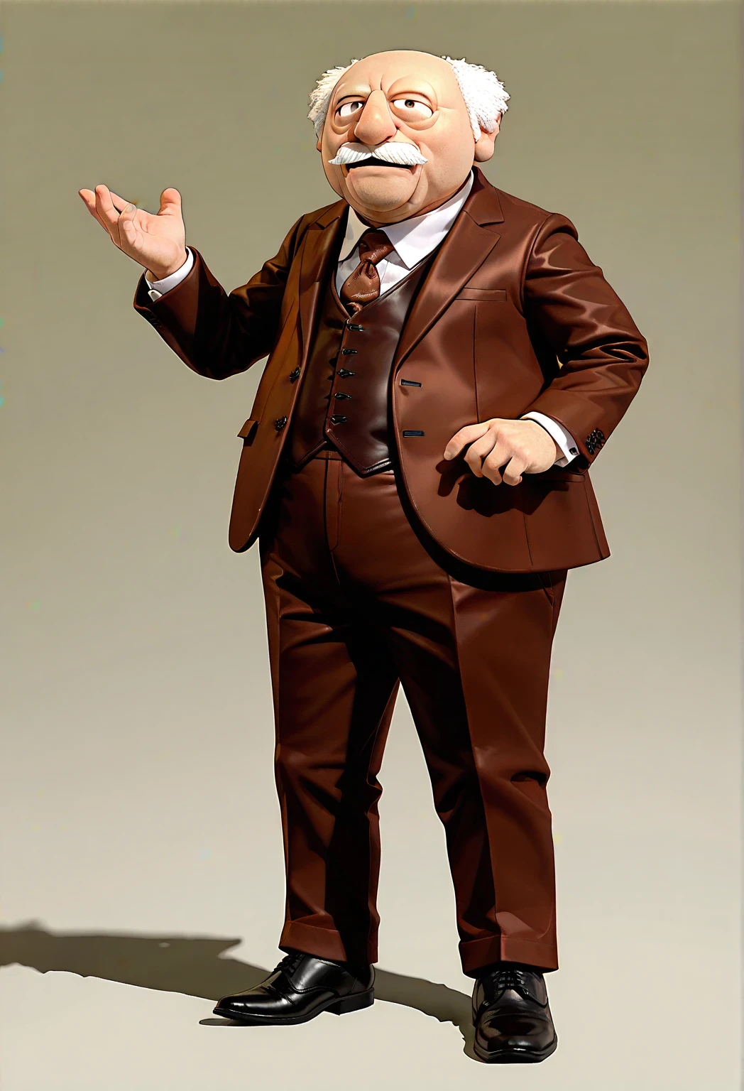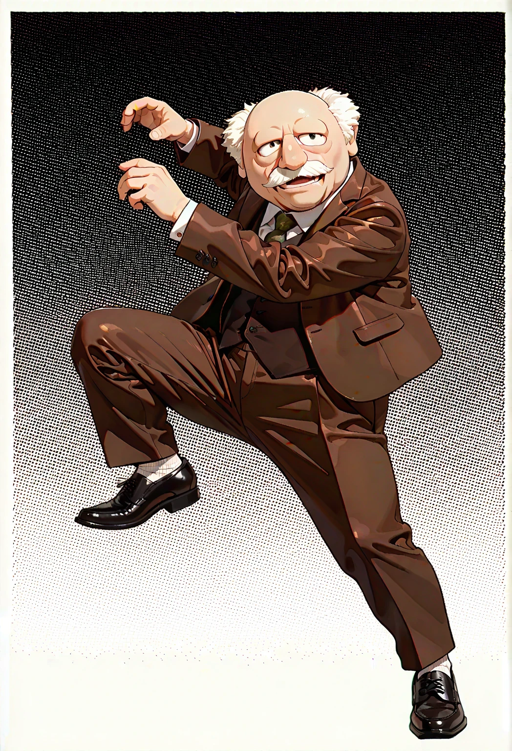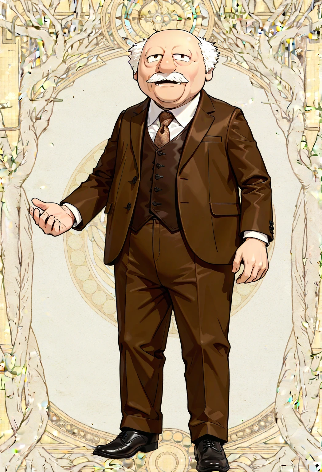 WardolfTM, 1boy, white mustache tufted white hair, balding hair, dark brown suit, dark brown vest, patterned brown necktie, white collared shirt, dark brown pants, black shoes