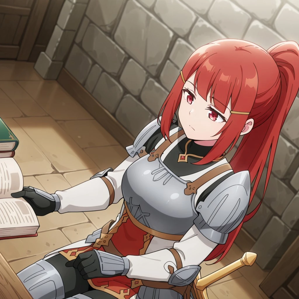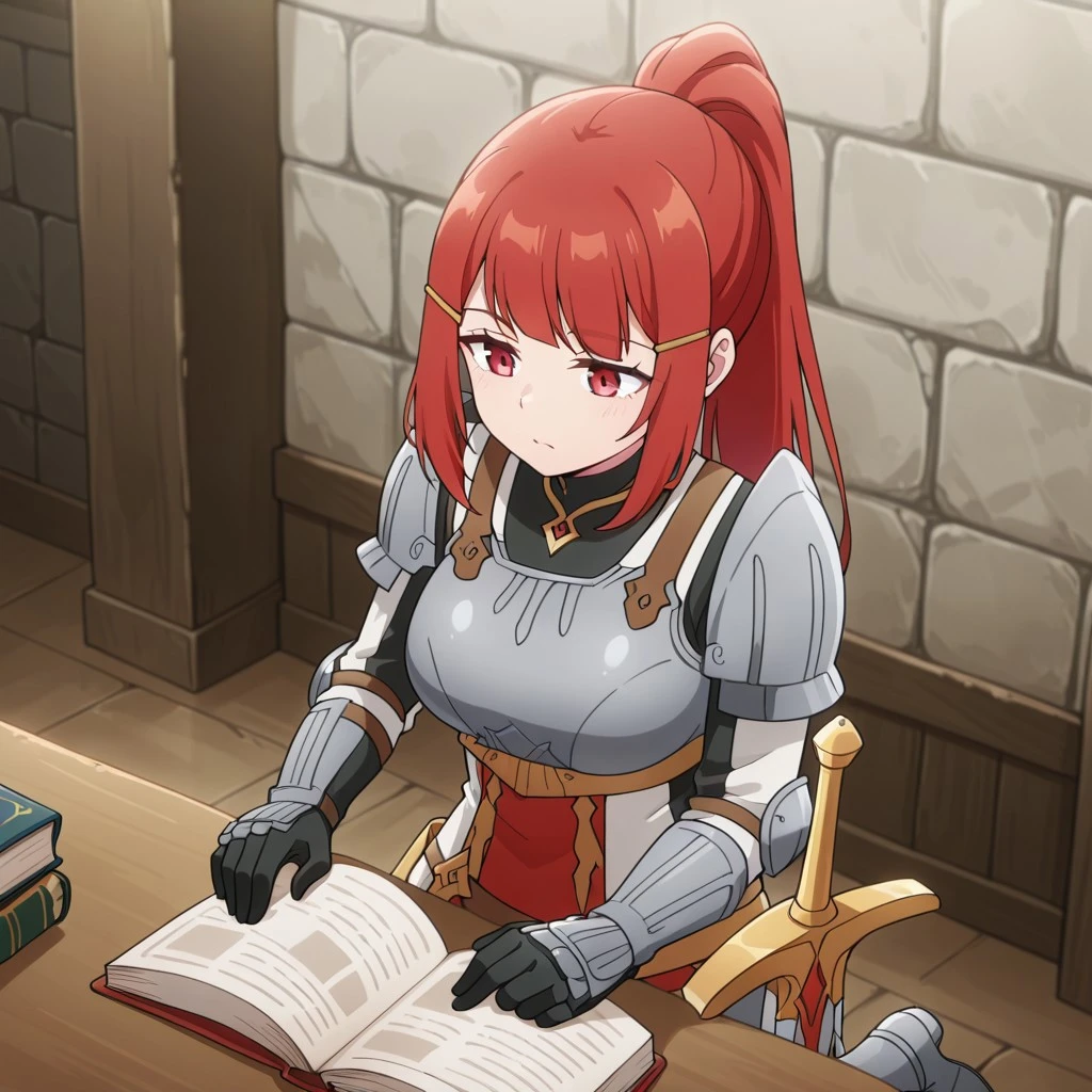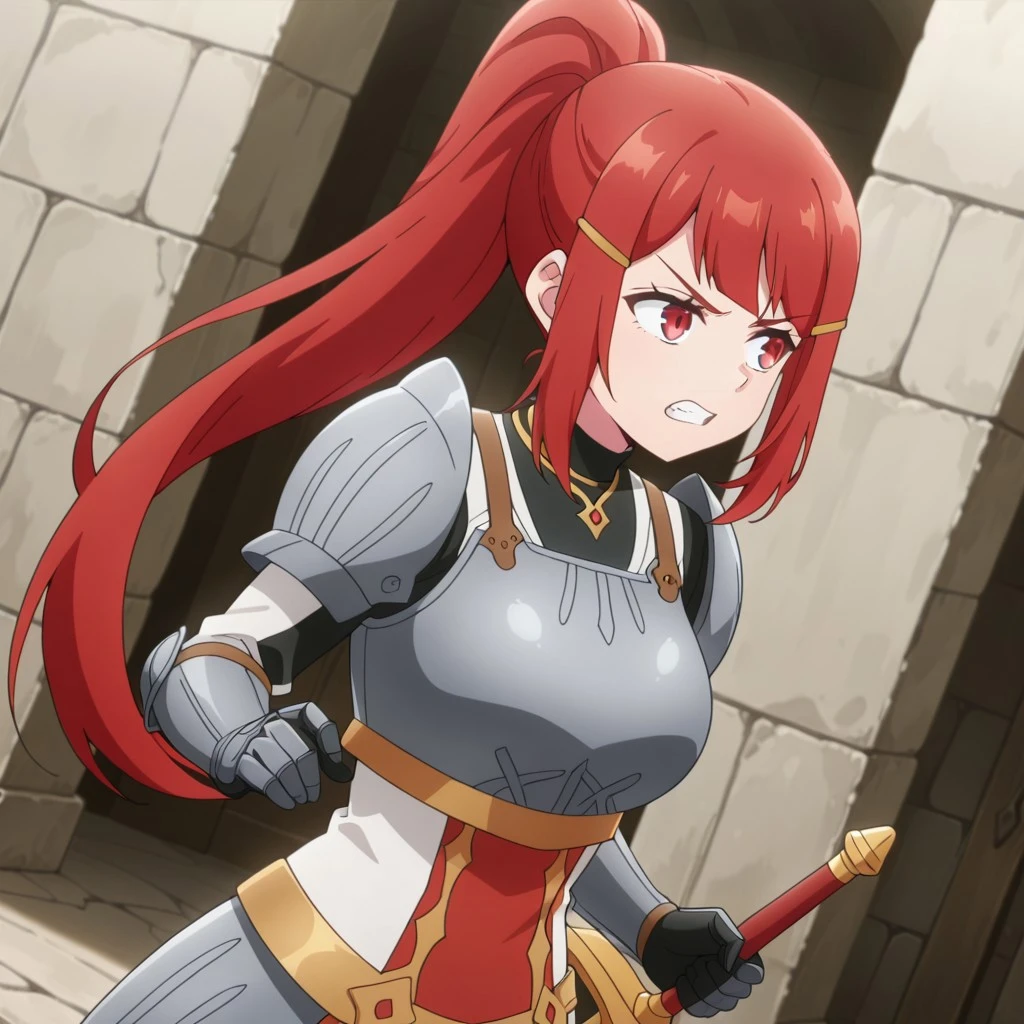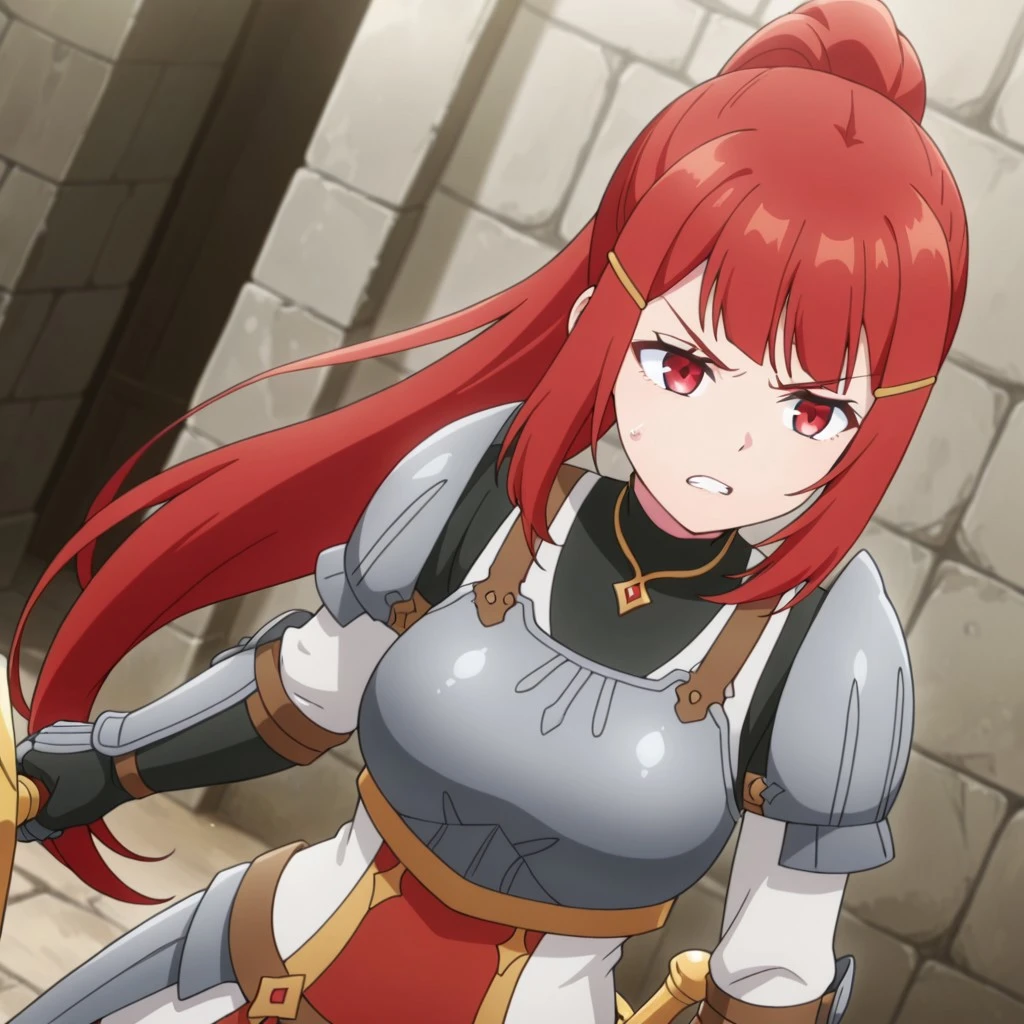 1girl, red hair, high ponytail, red eyes, long hair,sidelocks, double yellow hairclip, grey ????? armor with red and gold accents, grey gauntlets with red accents and golden edges, thigh armor with red accents, black gloves, medieval stone walls, aged stonework, gold necklace, ???????????,