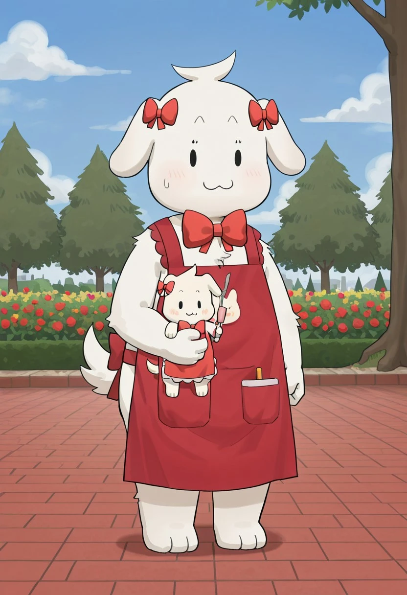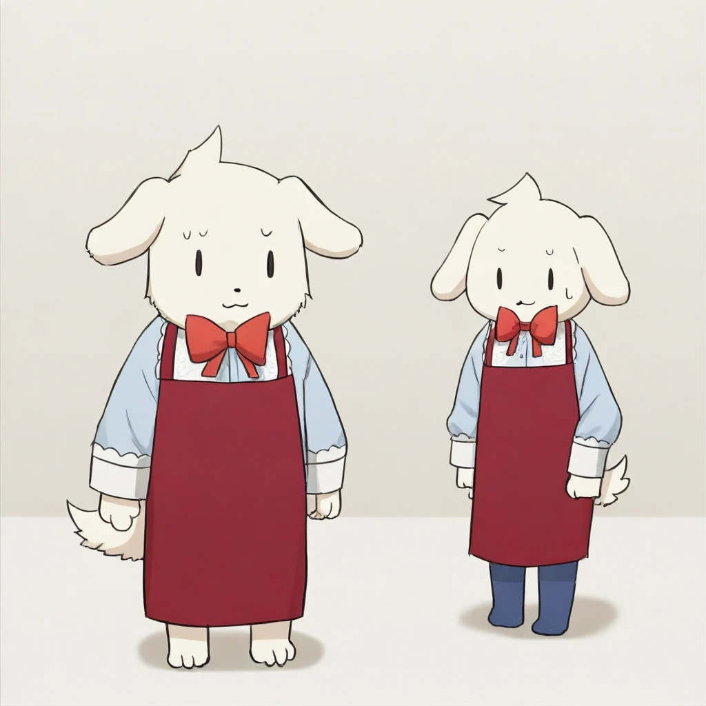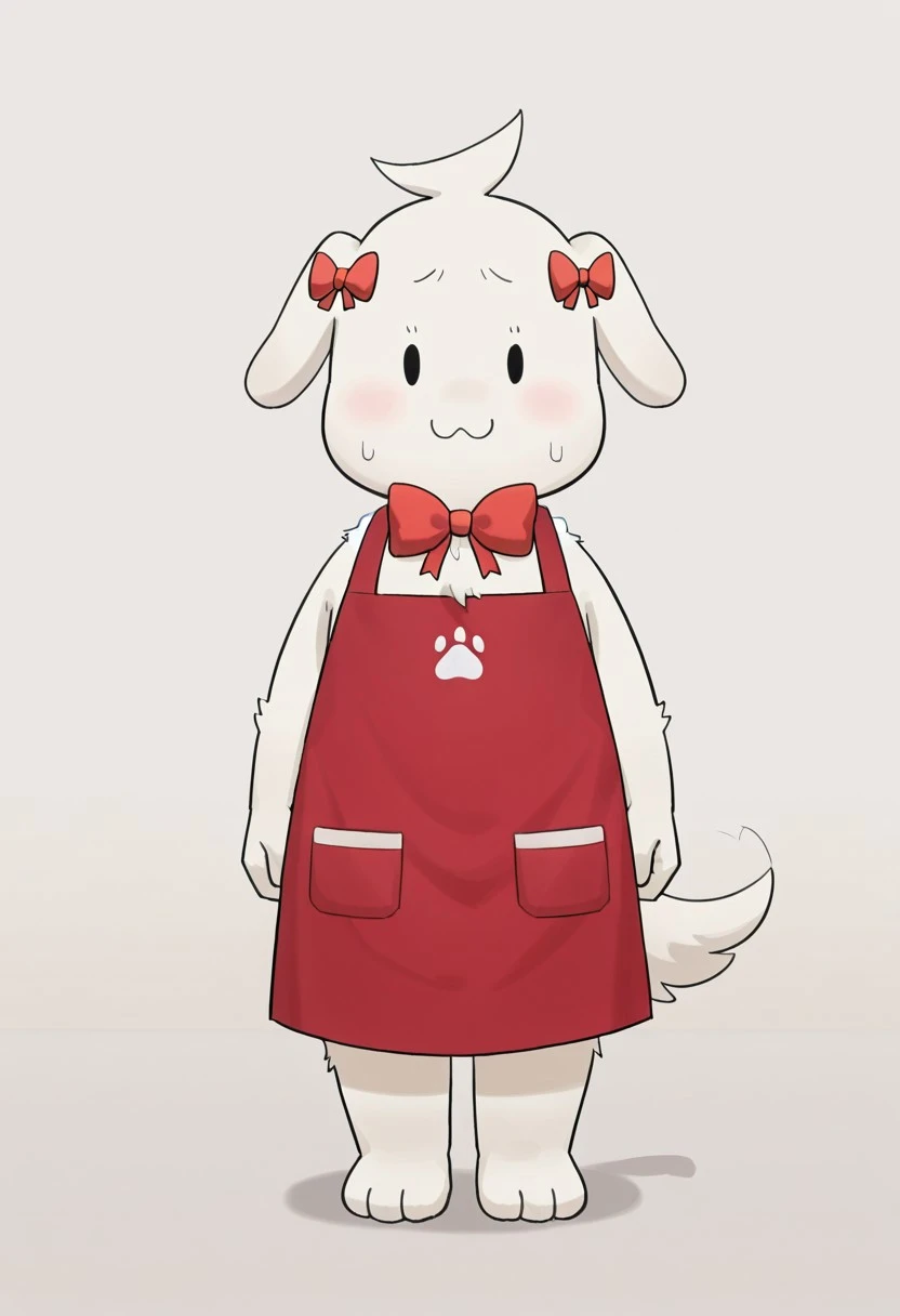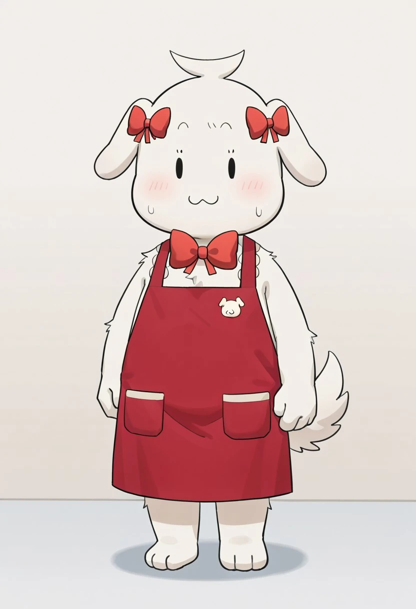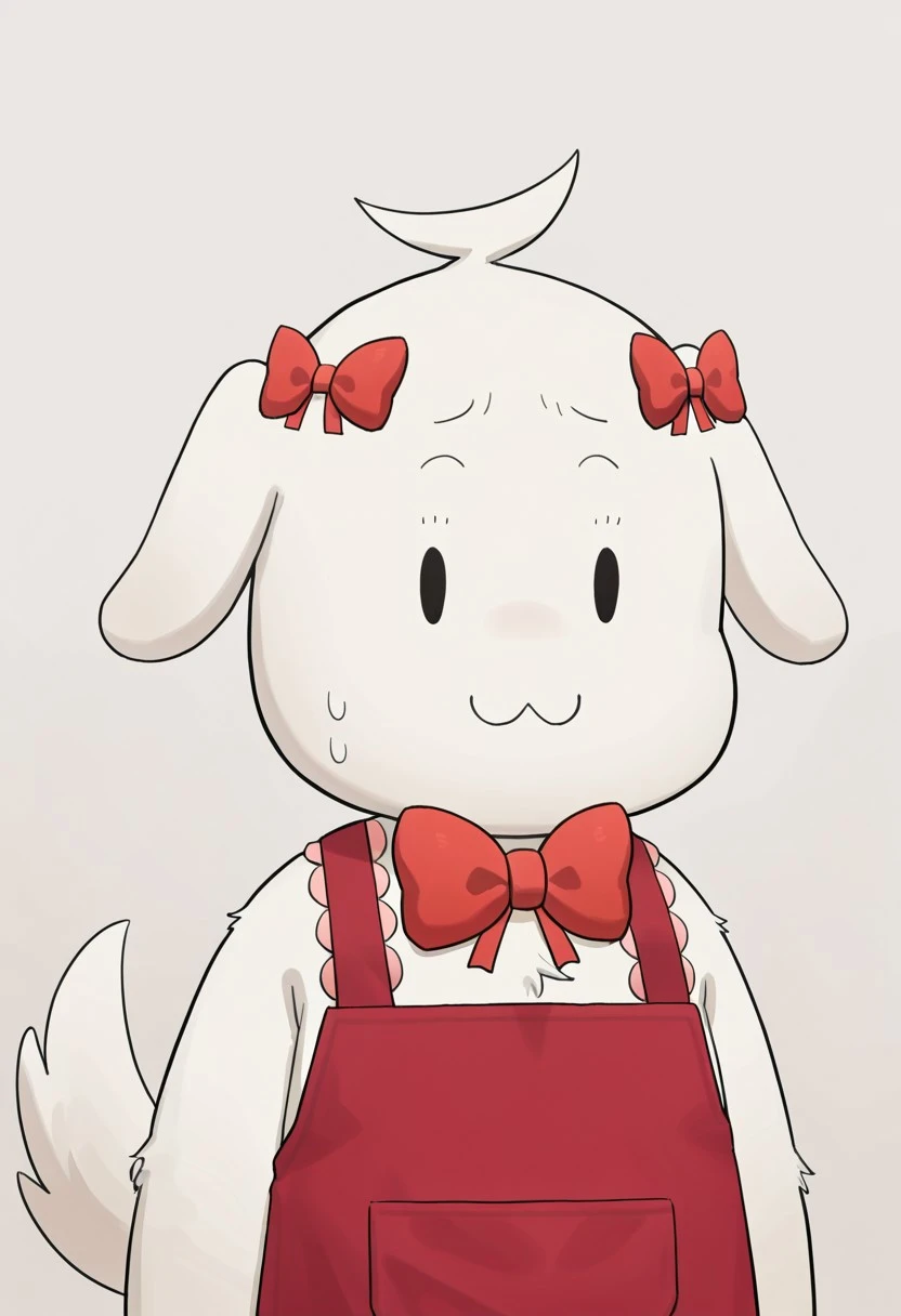 <lora:hanako BWBGD-V1>, hanakoBWBGD,without a nose, , semi-anthro, male, dog, white skin, black eyes, bow, furry, solo, bowtie, red_bow, hair_bow, no_human, :3