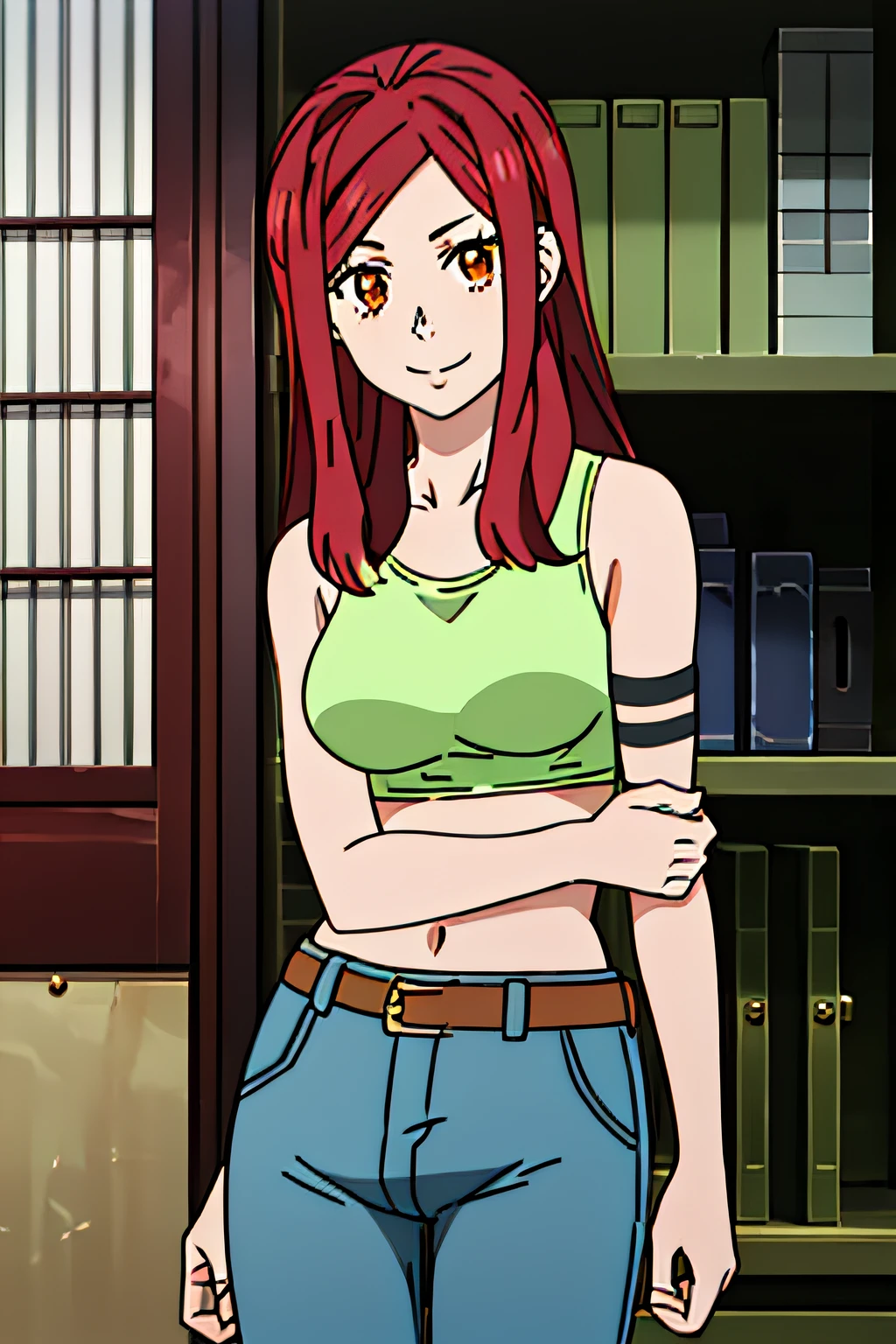 denim, asymmetrical clothes, single pantsleg, belt, pants, jeans, thigh strap,tank top, bare shoulders, armband, shirt, asymmetrical legwear