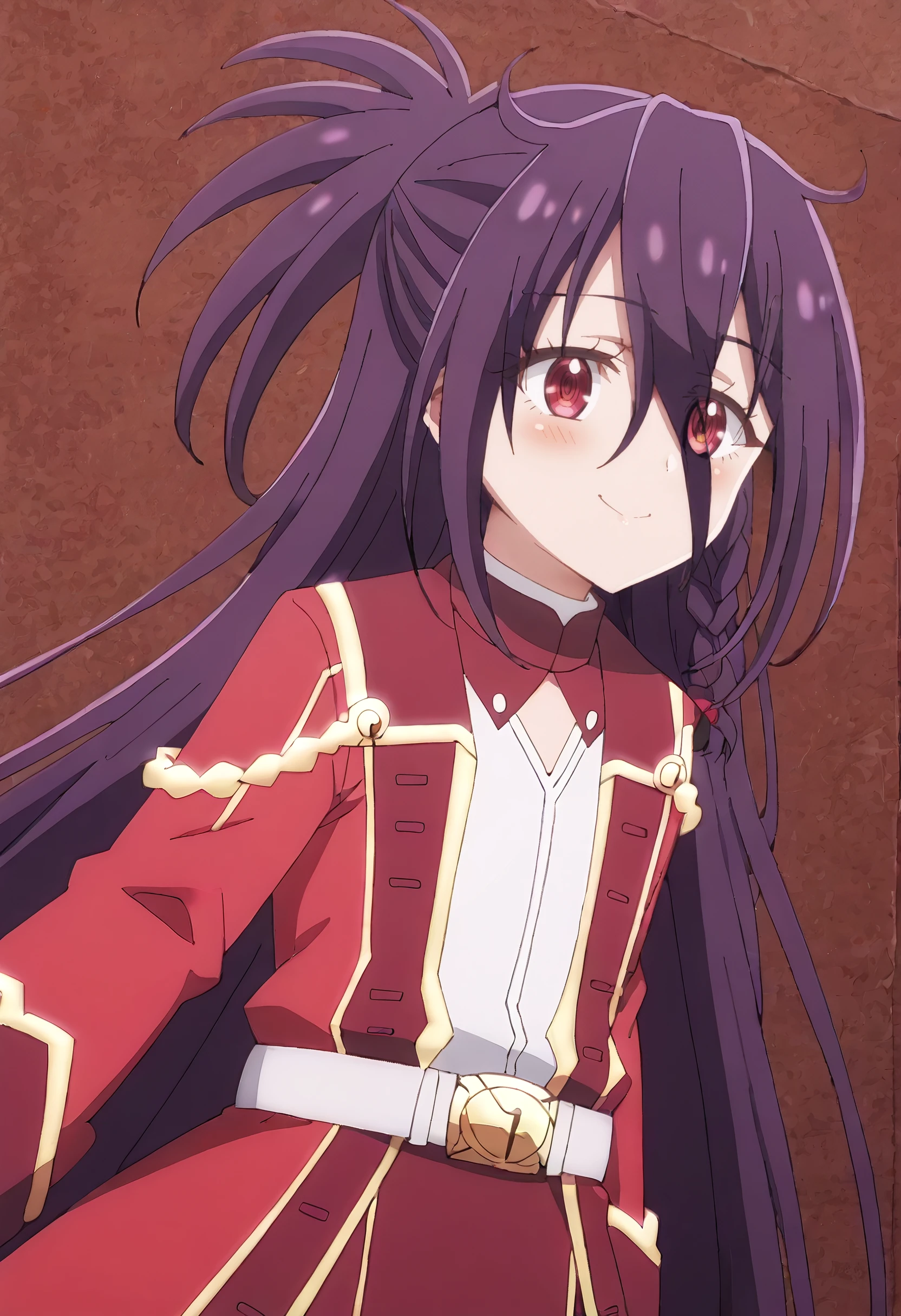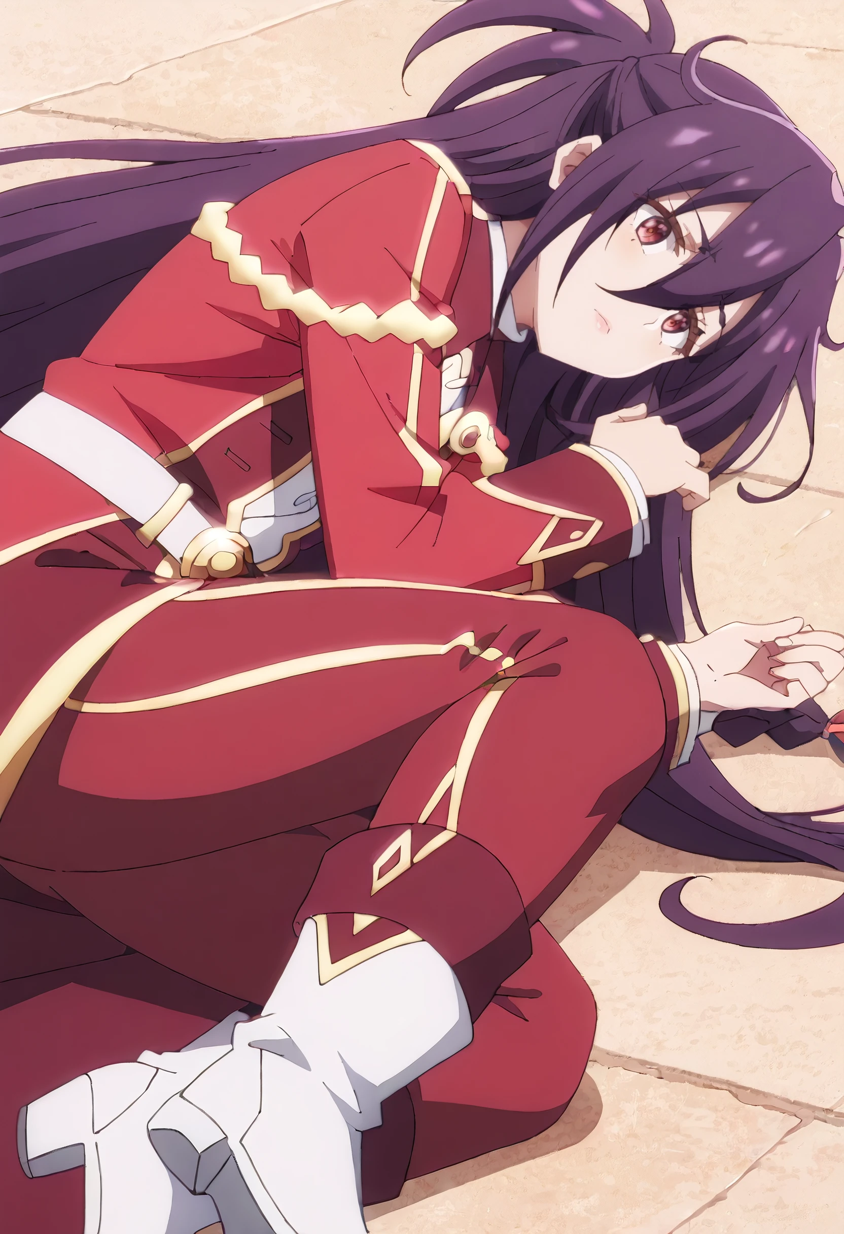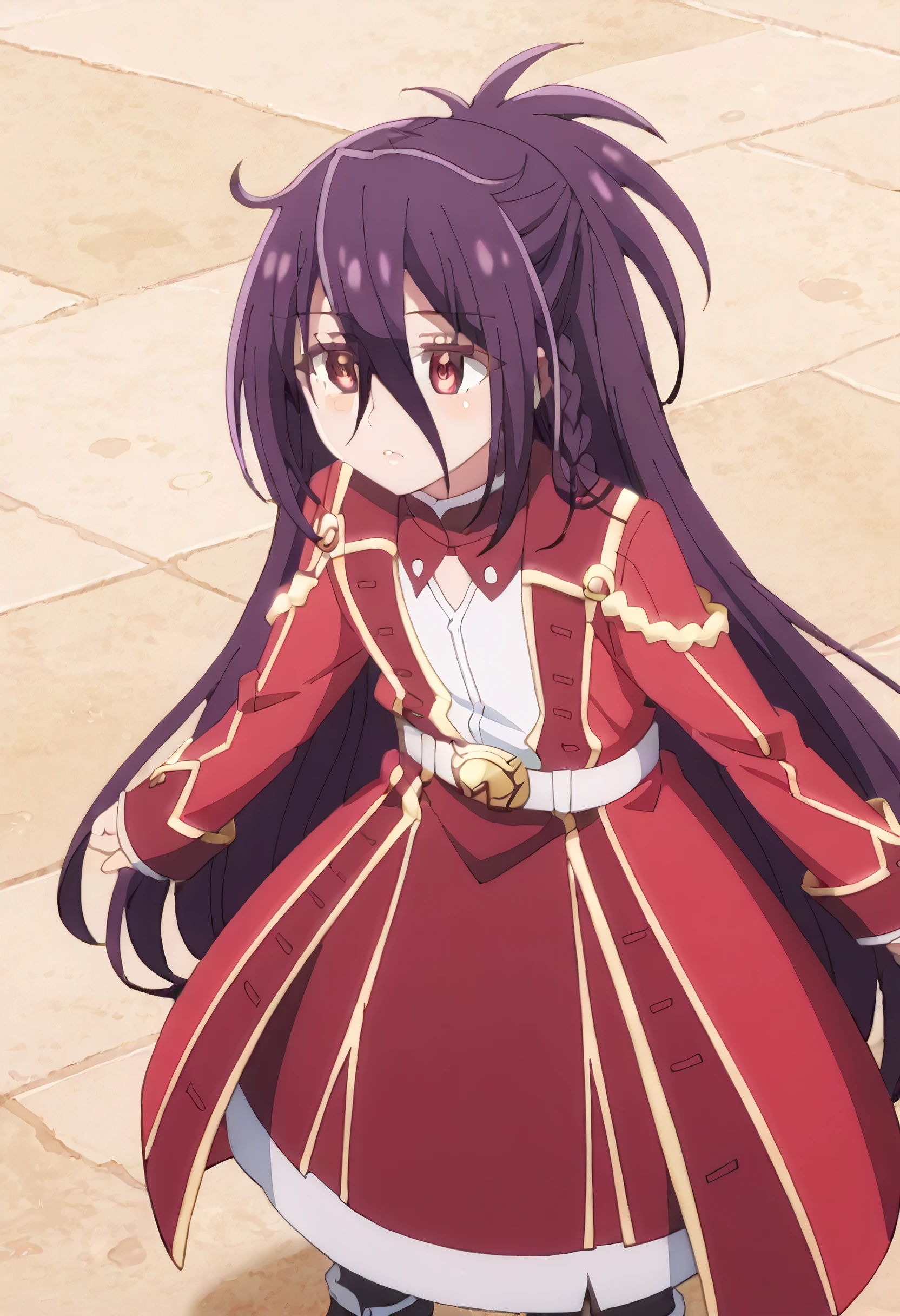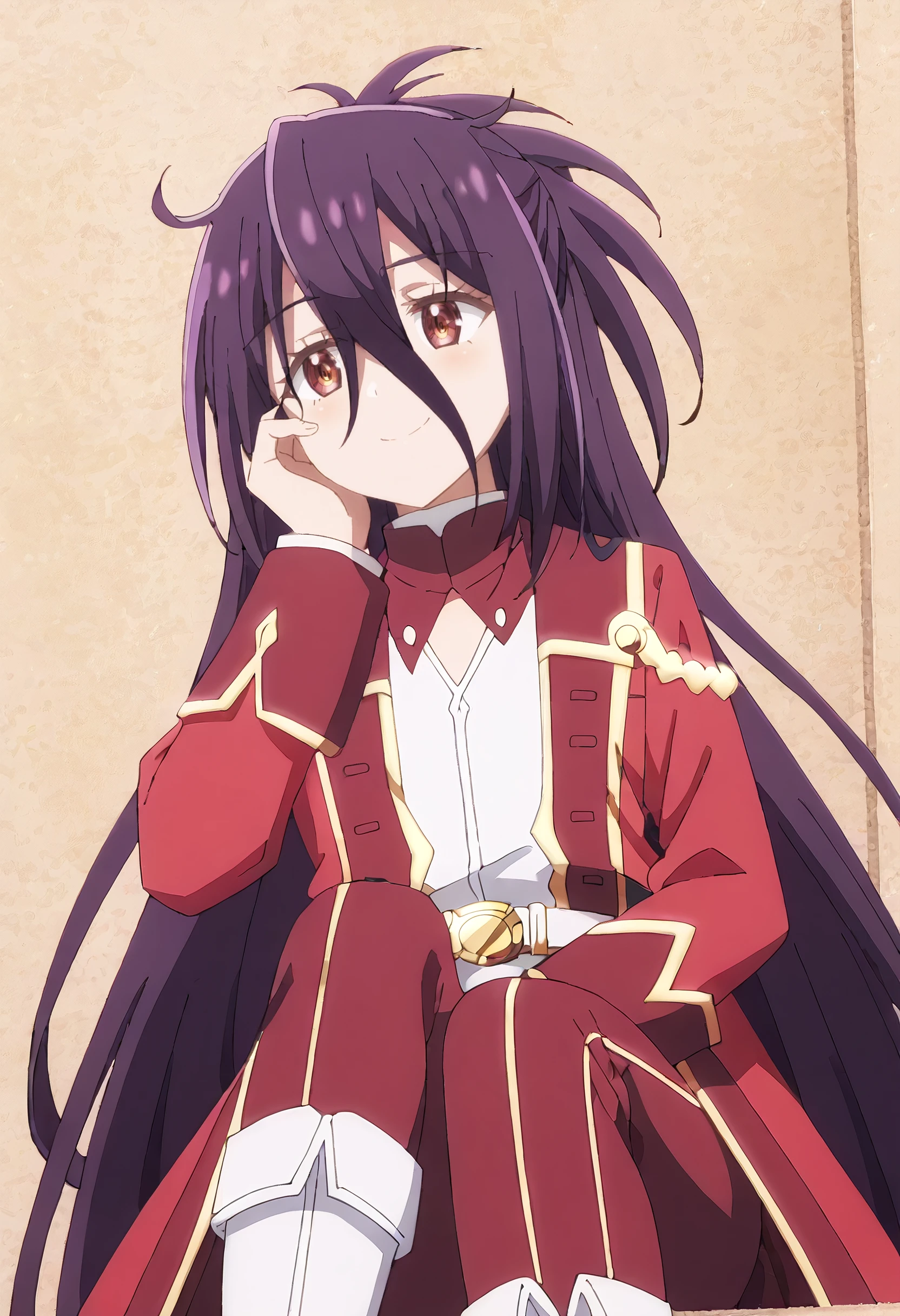 ZeshiaSchool, red jacket, long sleeves, red coat, belt, red dress, white shirt, hair over one eye, boots, school uniform, long coat, high collar, white footwear, white belt,
