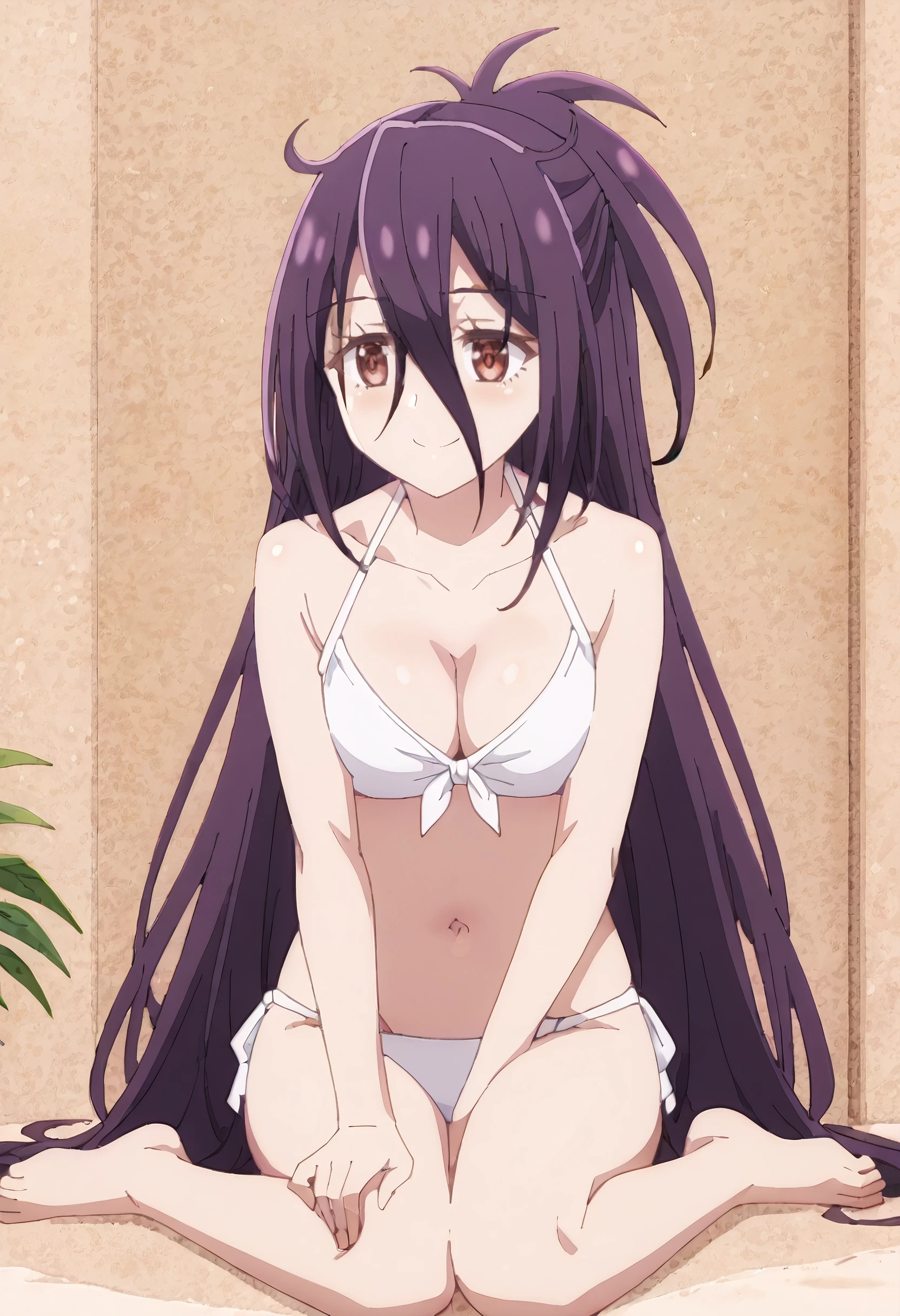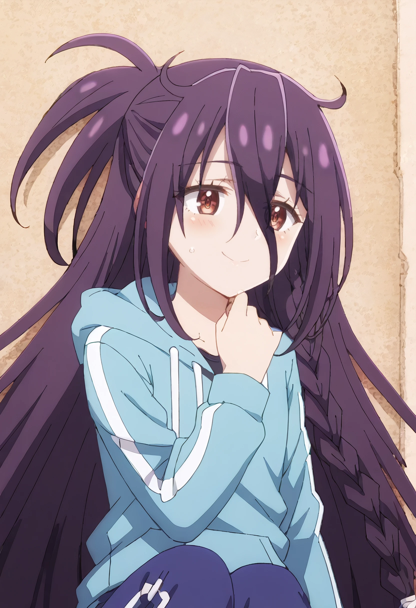 MGNZeshia, long hair, hair between eyes, purple hair, brown eyes, very long hair, half updo, messy hair, ponytail, braid,