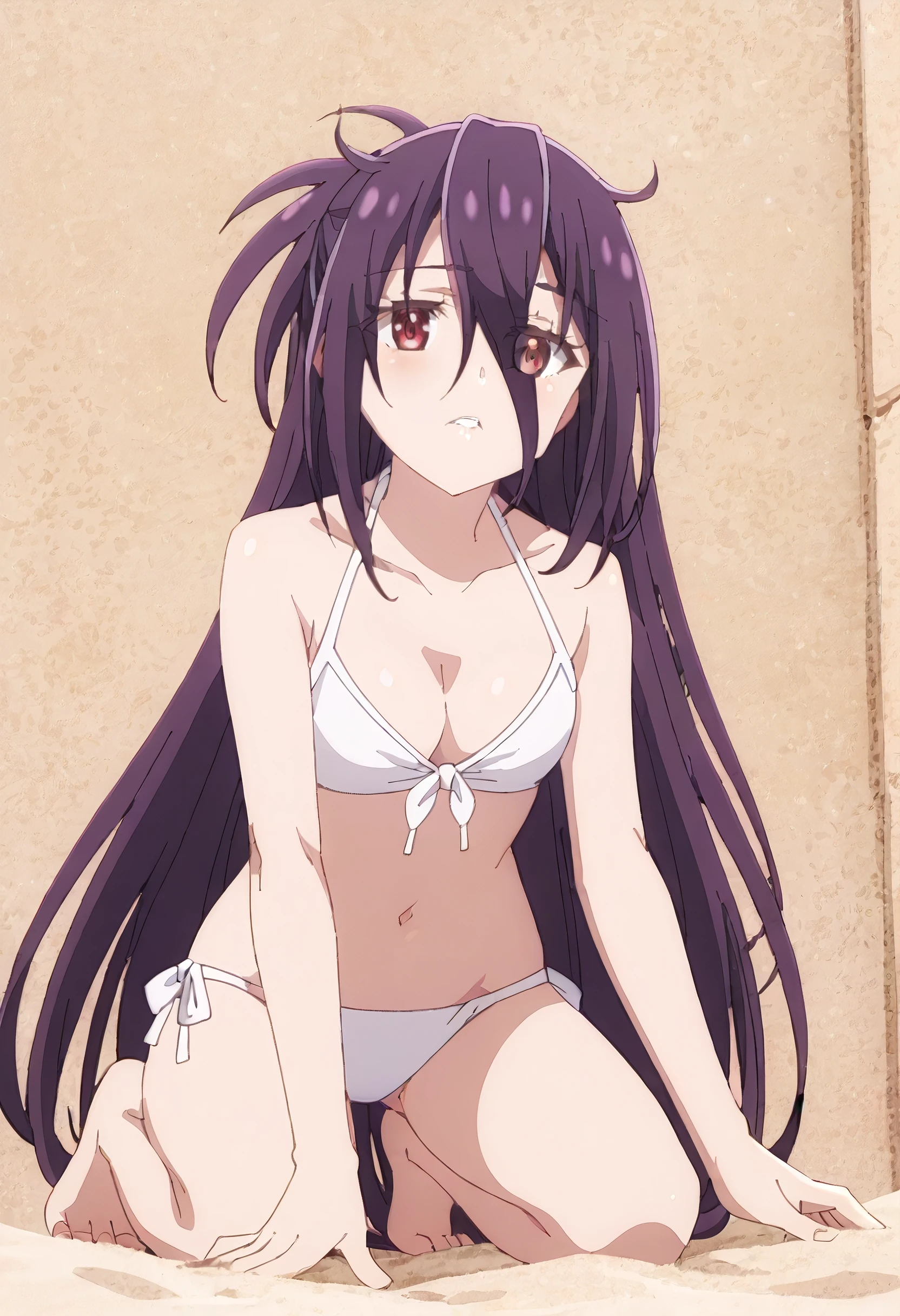 ZeshiaSwimwear, white bikini, swimsuit, navel, bare shoulders, barefoot, bare legs, halterneck, spaghetti strap, cleavage, groin,
