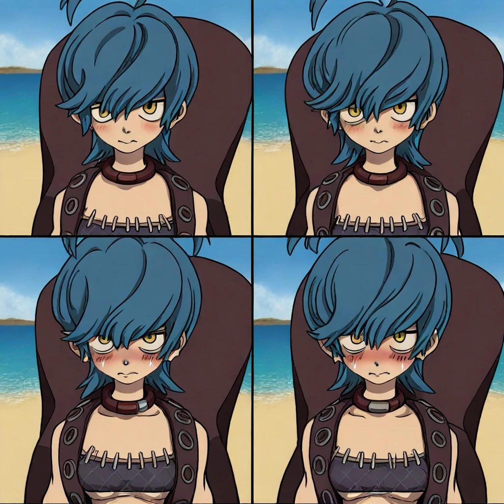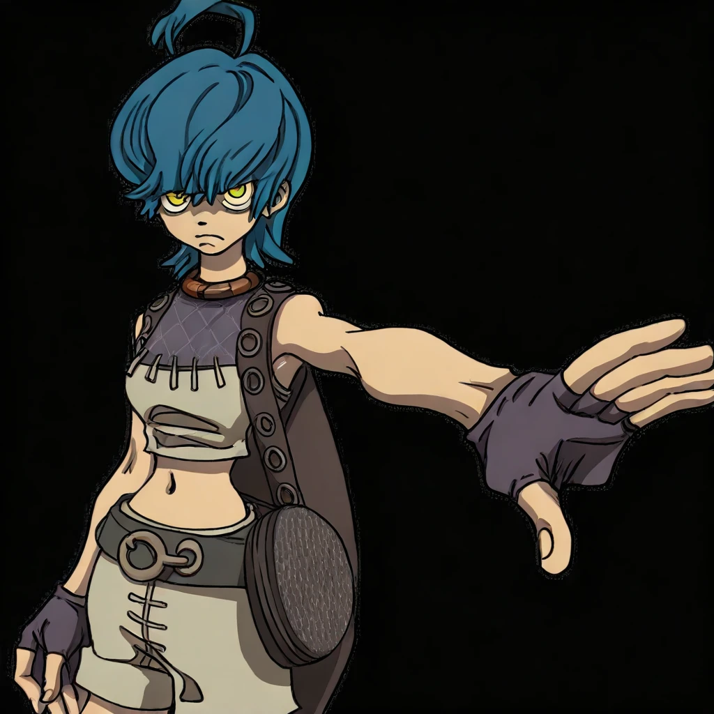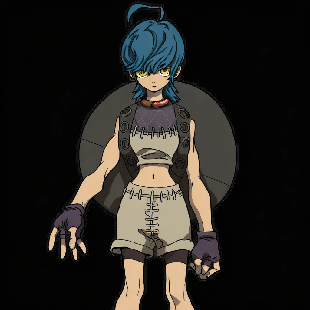 sleeveless, necklace, navel, purple fingerless gloves, two toned shorts