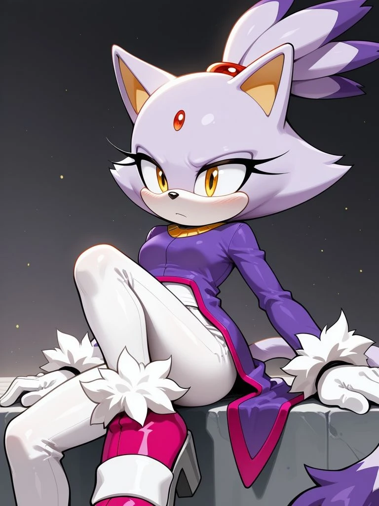Blaze the cat, lavender purple fur, forehead jewel, topknot, ponytail, regal purple coat, white pants, white gloves with fur trim, high heel pink shoes with fur trim, cat ears, cat tail, two-toned fur,