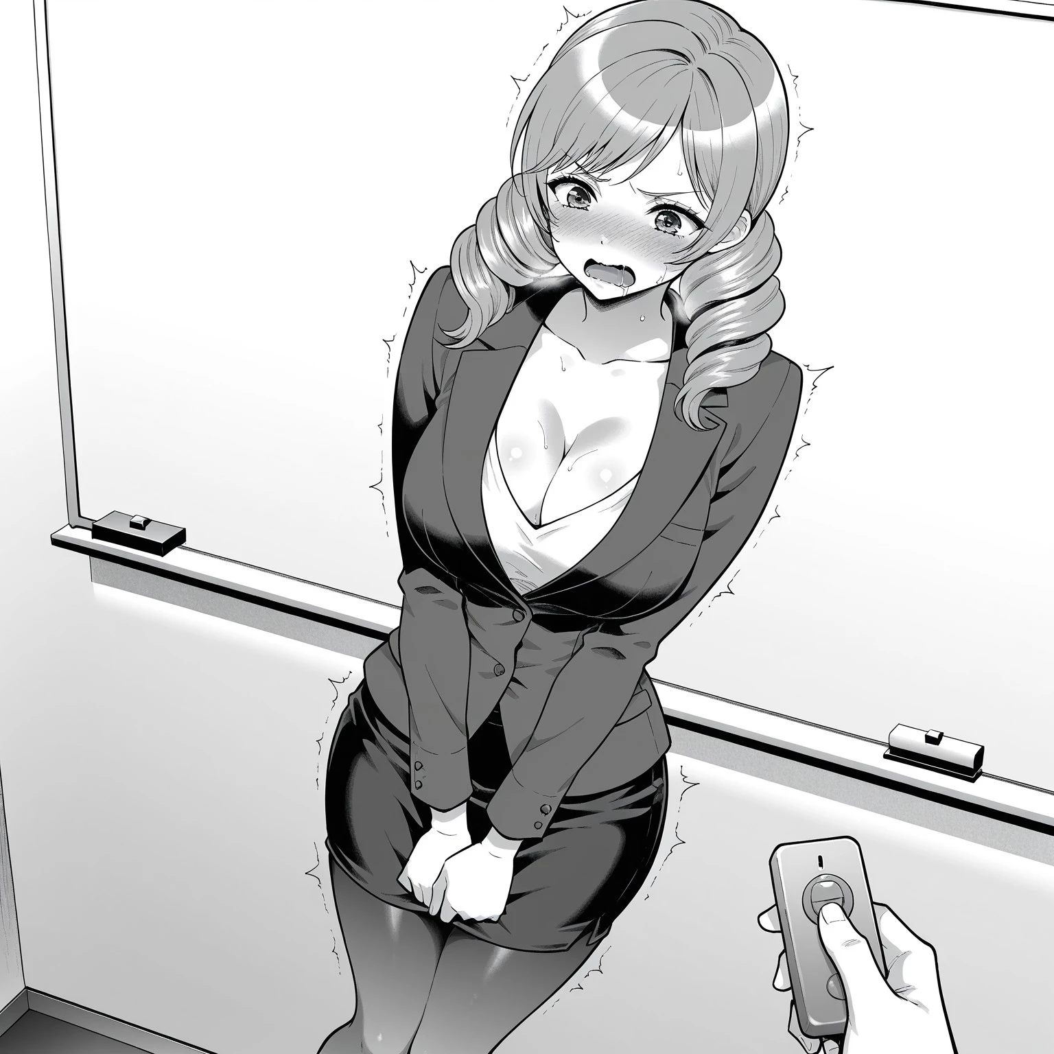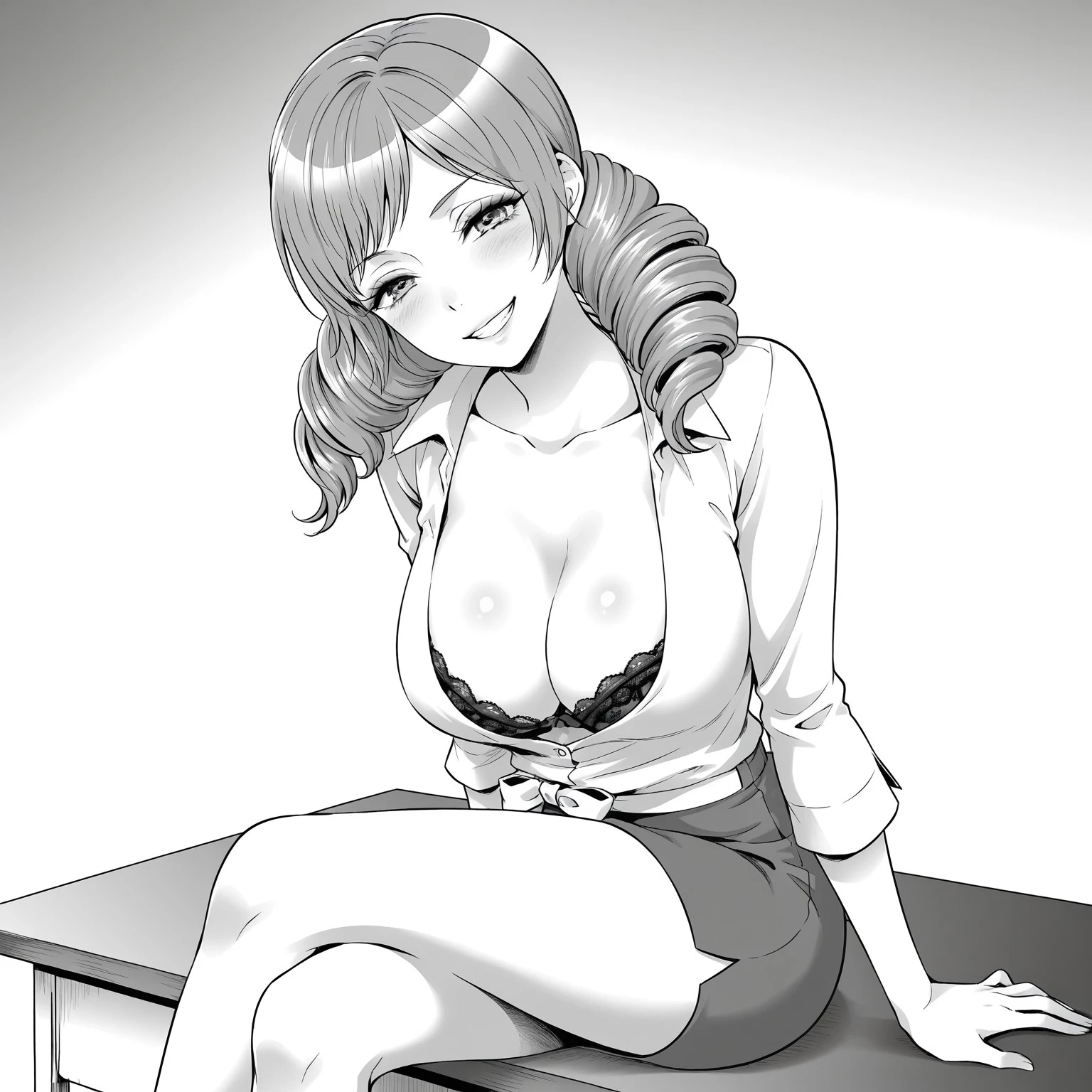 Basic features: 1girl, m1tsuk0, center part medium hair, pigtails hairstyle, double curled pigtails, side pigtails, soft waves, oval face, long eyelashes, subtle makeup, hourglass figure, narrow waist, wide hips, curvy silhouette,