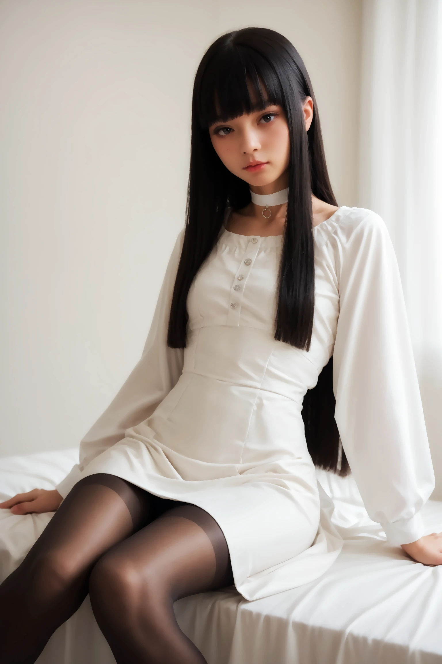 Outfit Trigger : dress, white dress, white choker, pantyhose, long sleeves