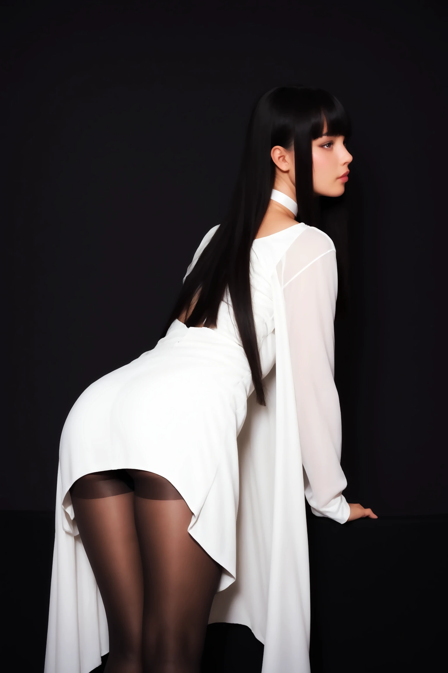 imtdtsukuyomi, 1girl, black hair, long hair, blunt bangs, mole under eye, dress, white dress, white choker, pantyhose, long sleeves