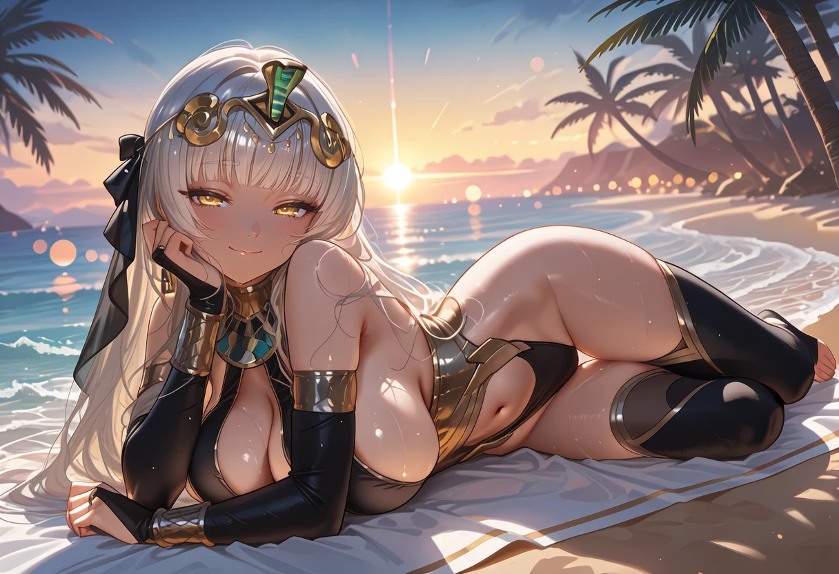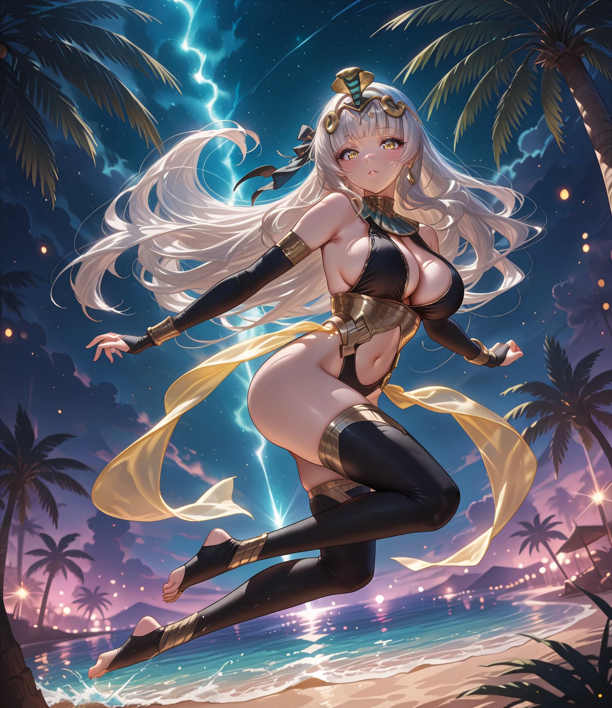 Bartdance, blunt bangs, yellow eyes, very long hair, silver hair, bangs, wavy hair, black hair bow, large breasts, earrings, sideboob, cleavage, usekh collar, bare shoulders, circlet, snake ornament, armlet, snake armband, black elbow gloves, bridal gauntlets, harem outfit, gold sash, sash, underbust, navel, gold trim, revealing clothes, black leotard, highleg, black thighhighs, toeless legwear, stirrup legwear,