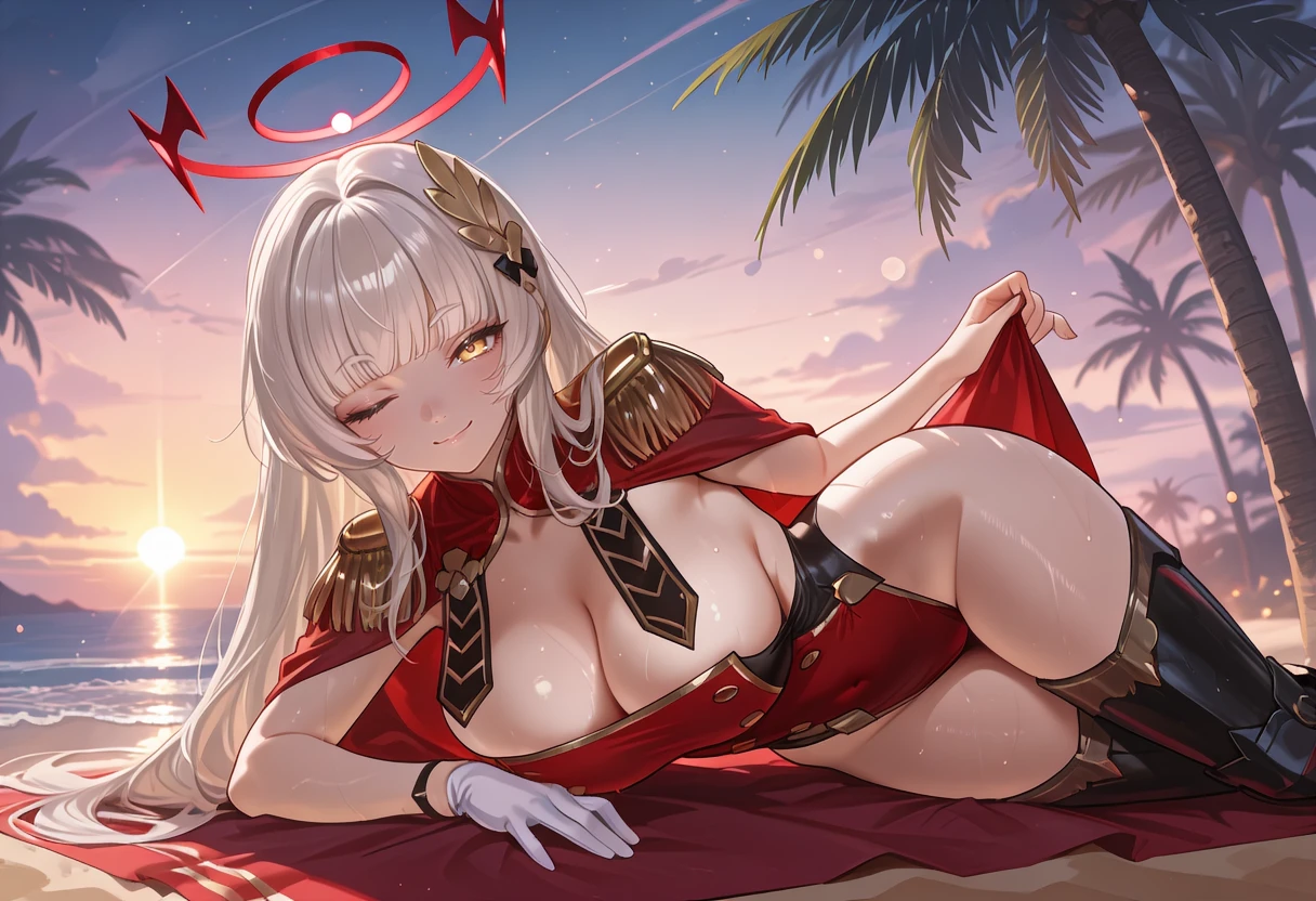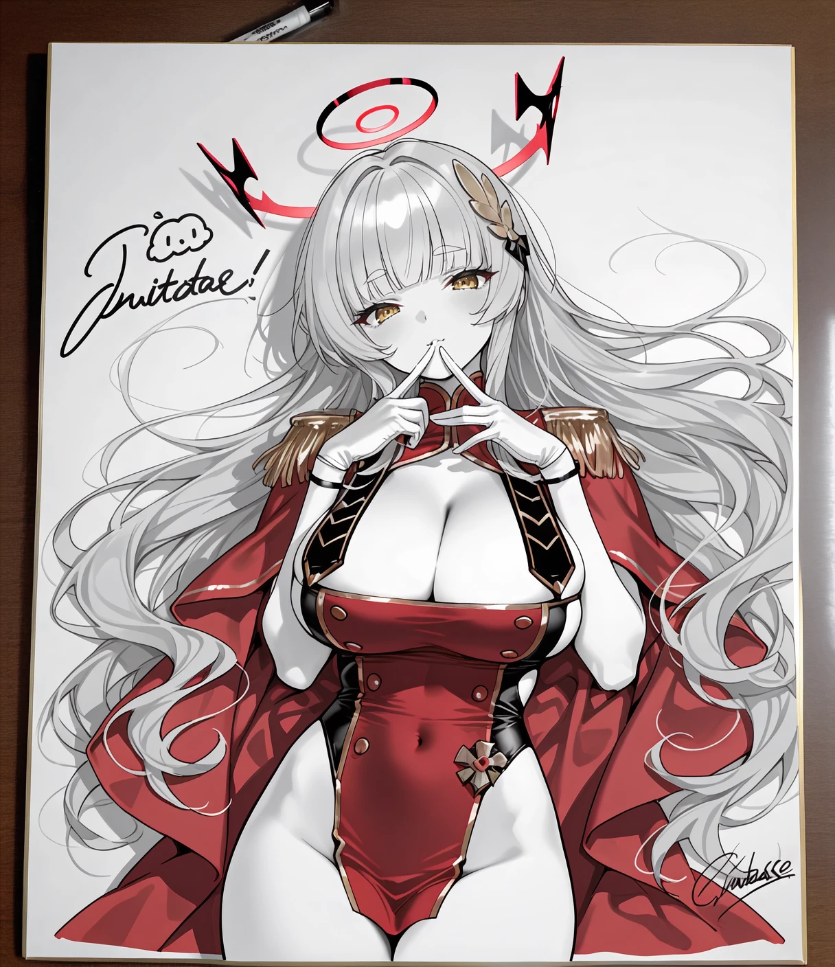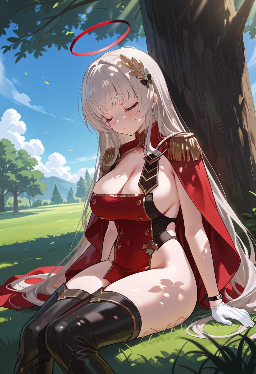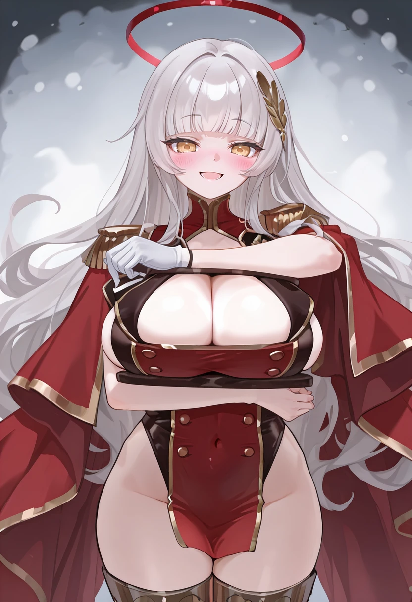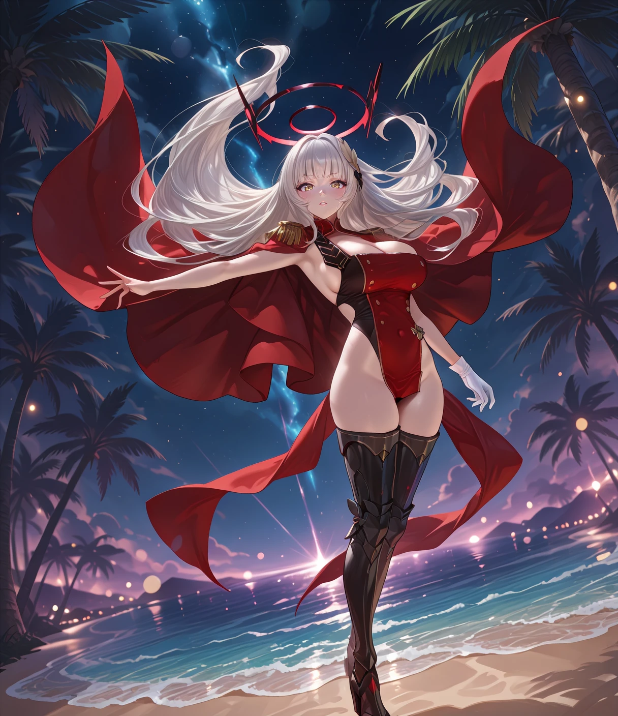Bartbase, blunt bangs, yellow eyes, very long hair, silver hair, bangs, wavy hair, hair ornament, large breasts, cleavage, sideboob, mechanical halo, red halo, epaulettes, high collar, red leotard, high-cut leotard, sleeveless, double-breasted, pelvic curtain, covered navel, asymmetrical gloves, white gloves, red cape, long cape, gold trim, black thigh boots, armored boots, single glove,