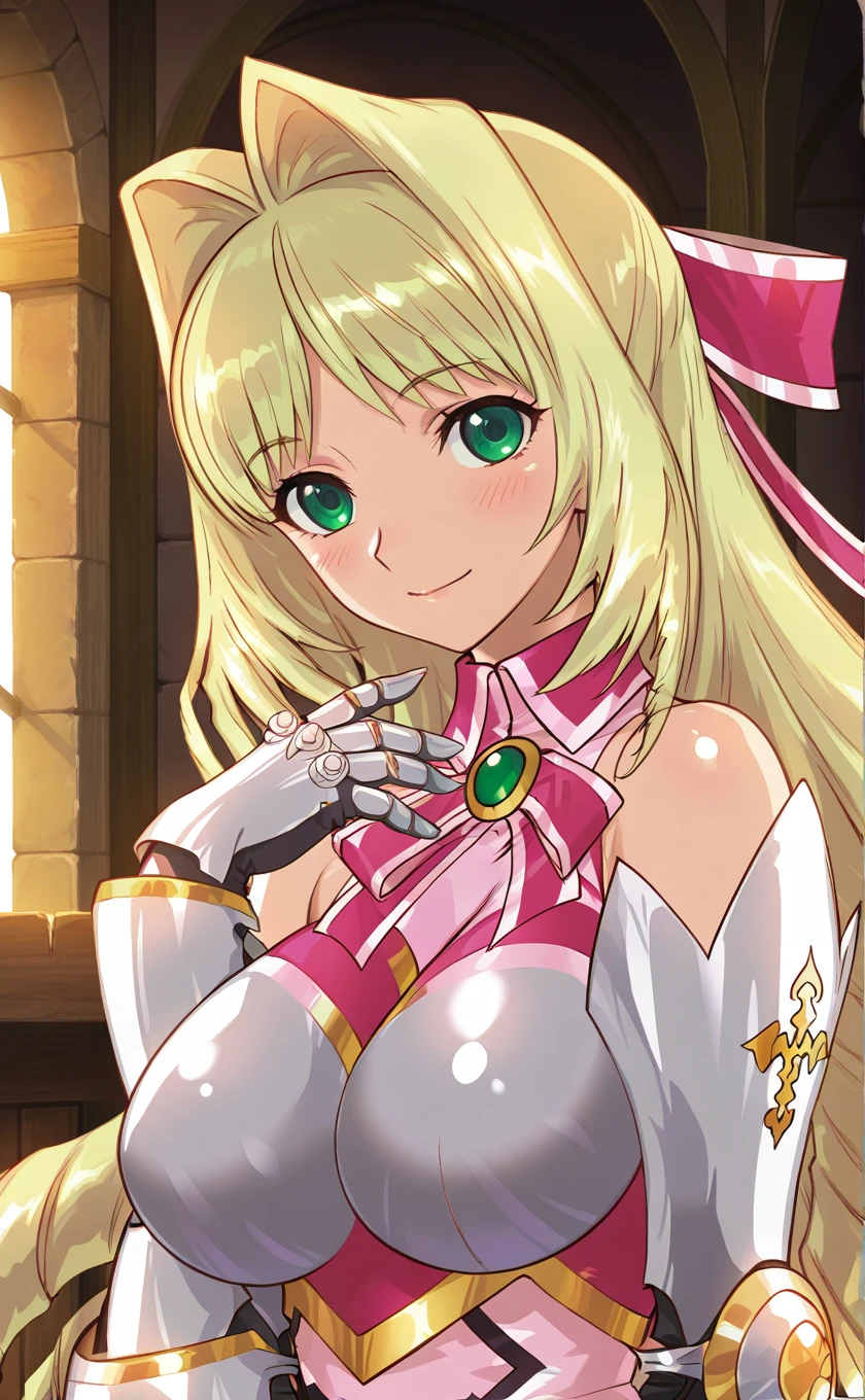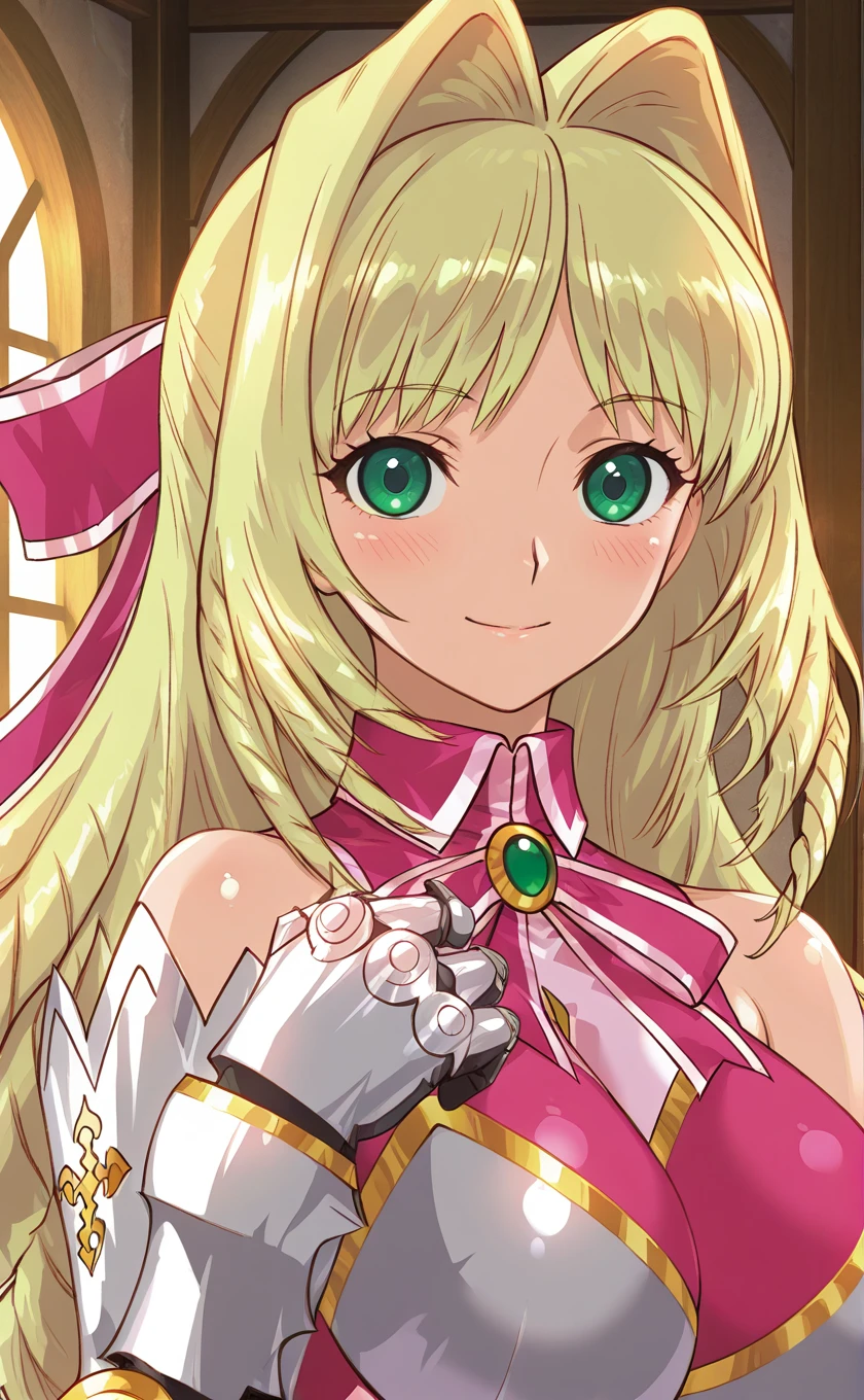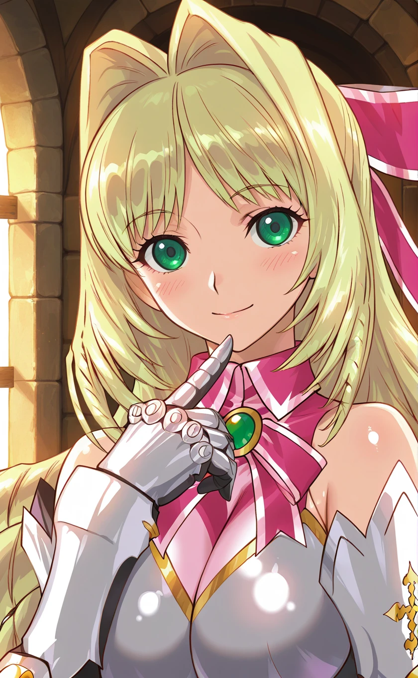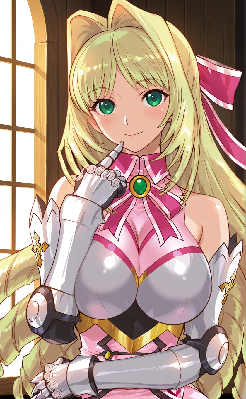 long hair,blonde hair,hair intakes,hair bow,drill hair,green eyes