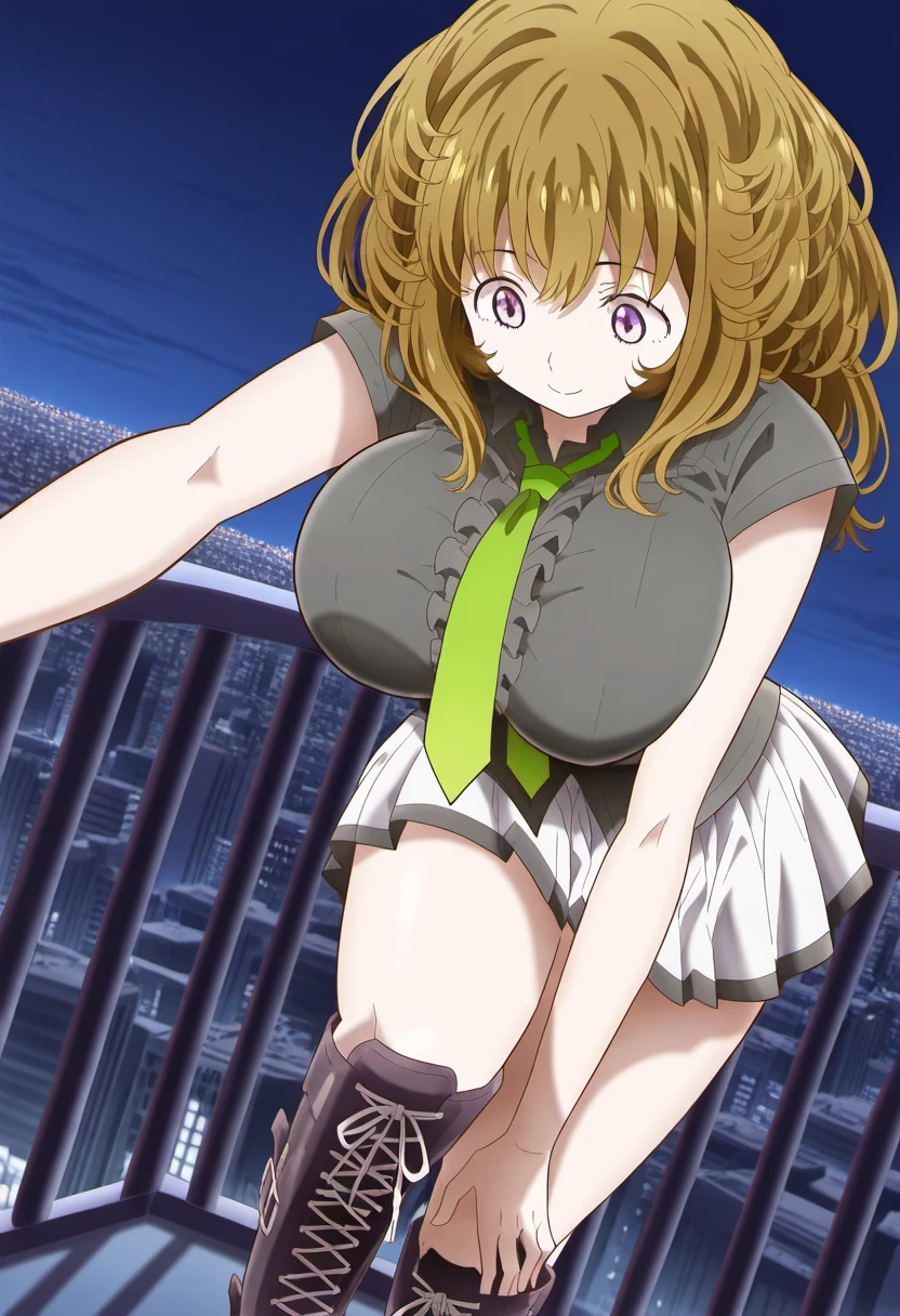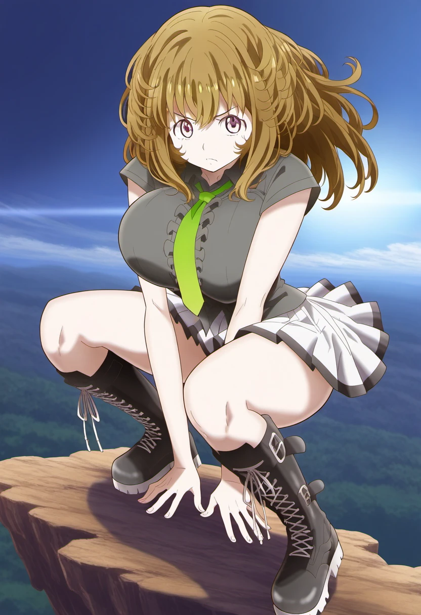 green necktie, grey shirt, short sleeves, white skirt, black trim, lace-up boots, boots