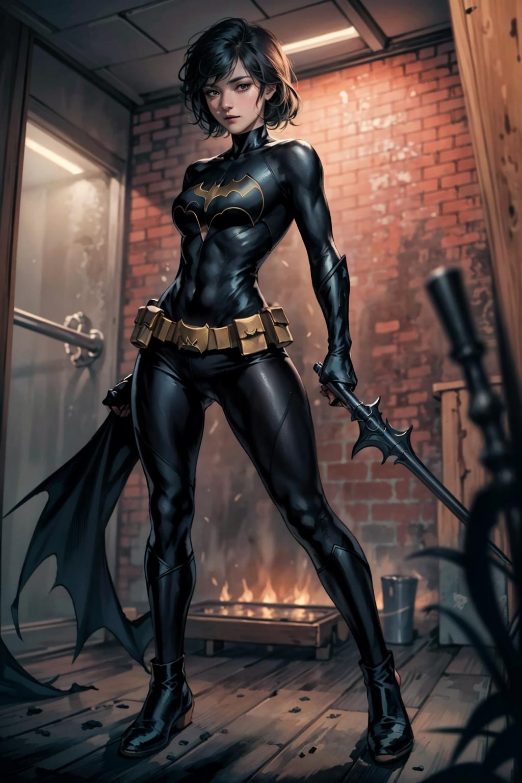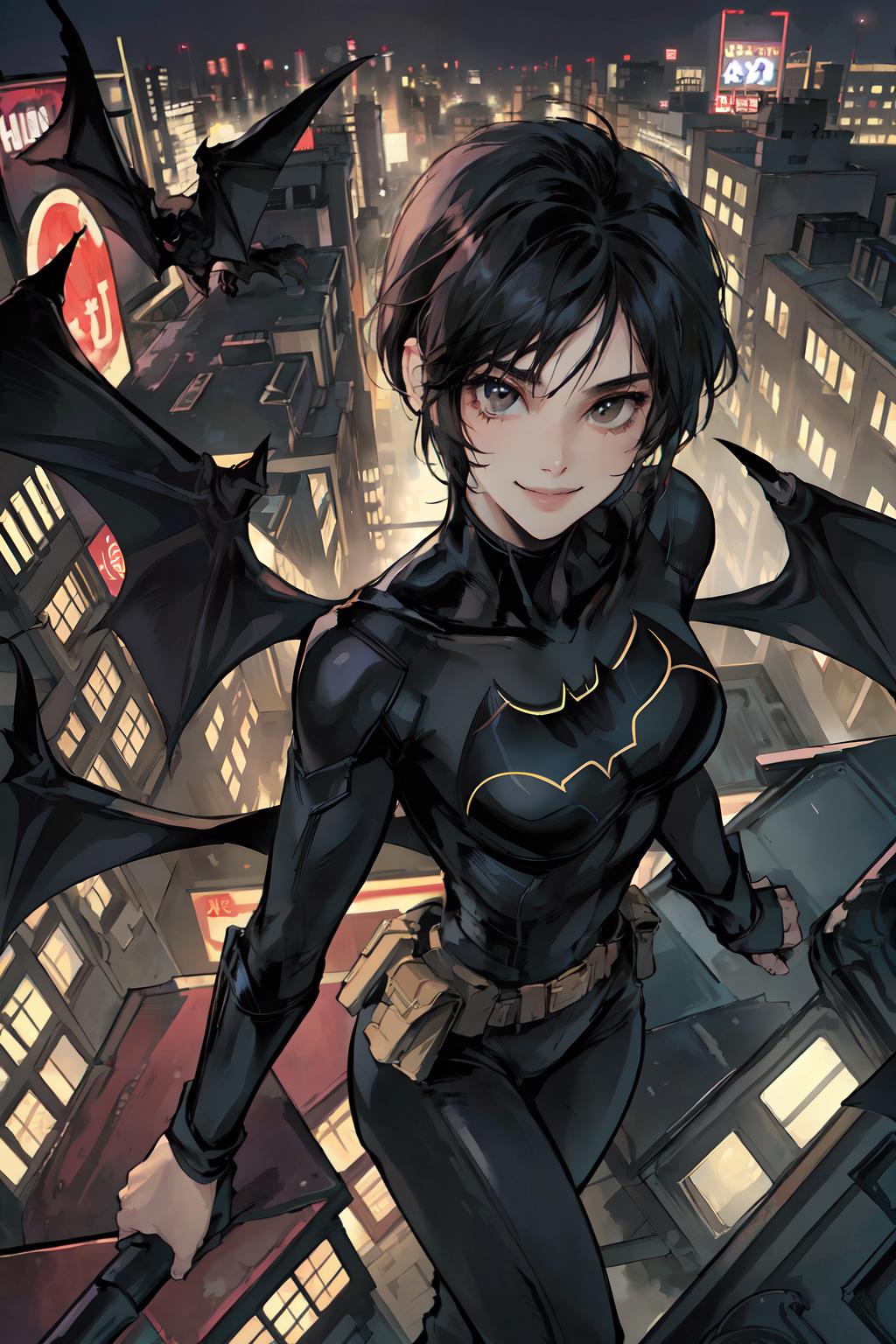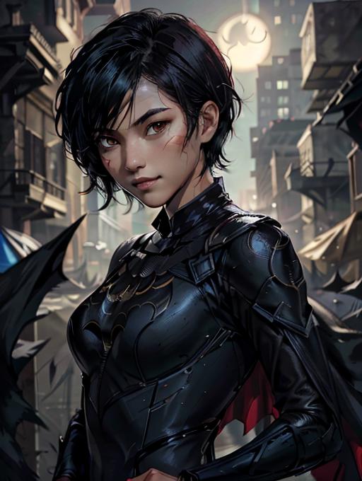 Prompt example: CassCain, cassandra cain, batgirl suit, 1girl, black hair, brown eyes, looking at viewer, mask, short hair, face scar <lora:CassandraCain-01:0.7>