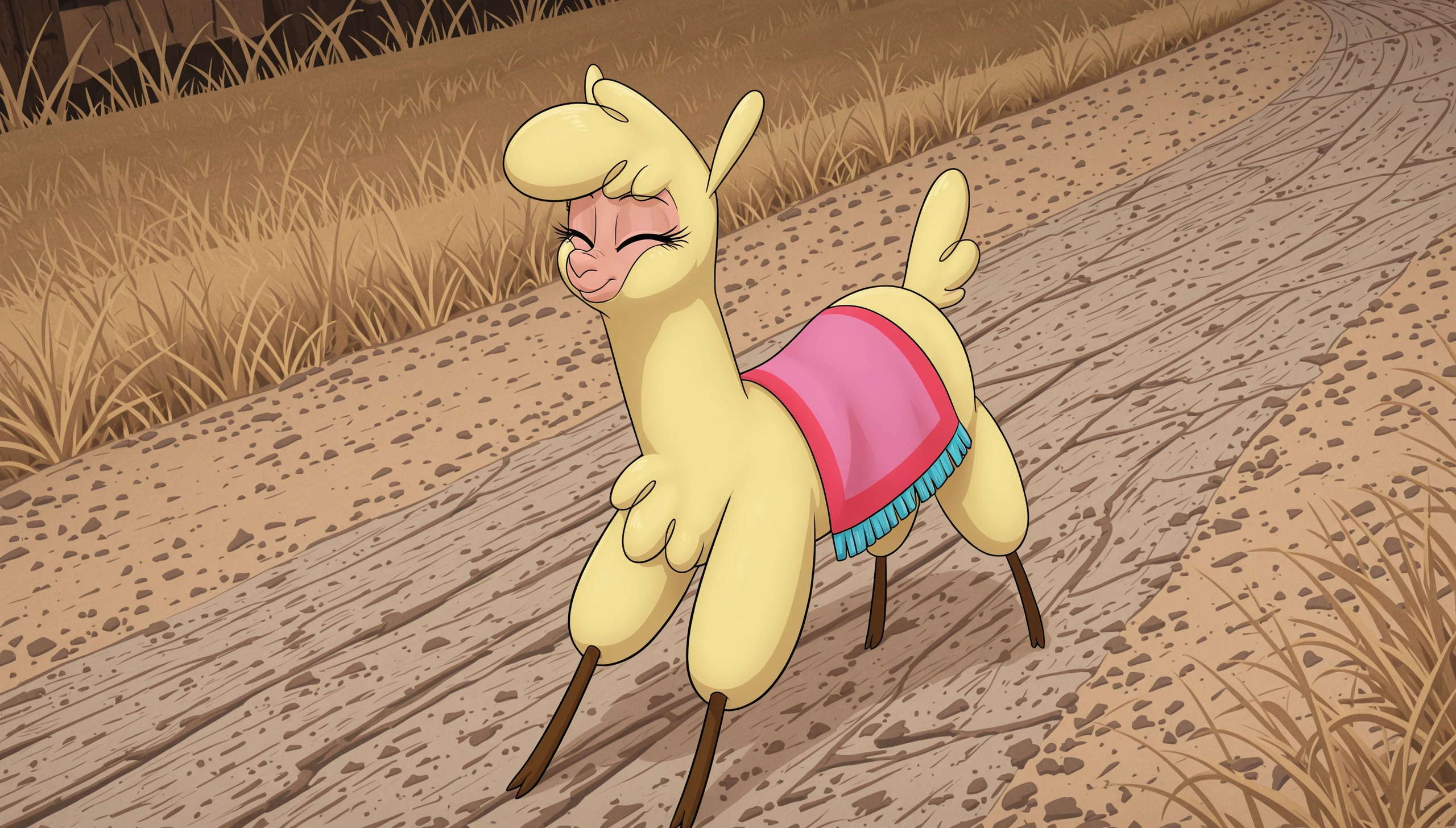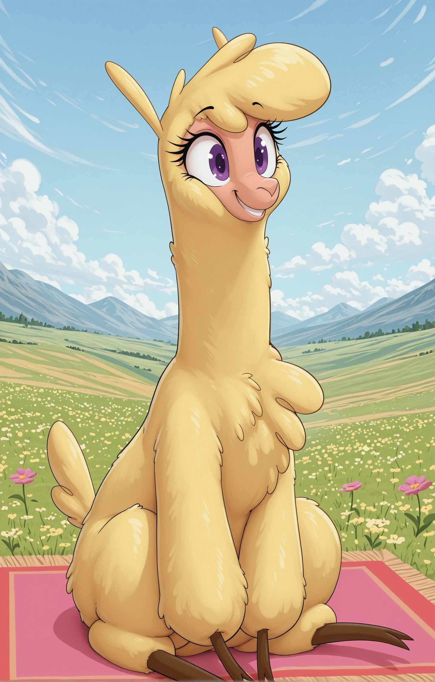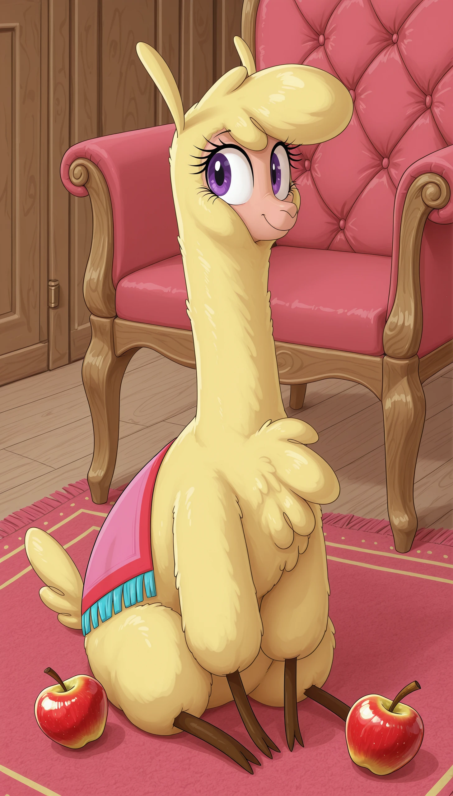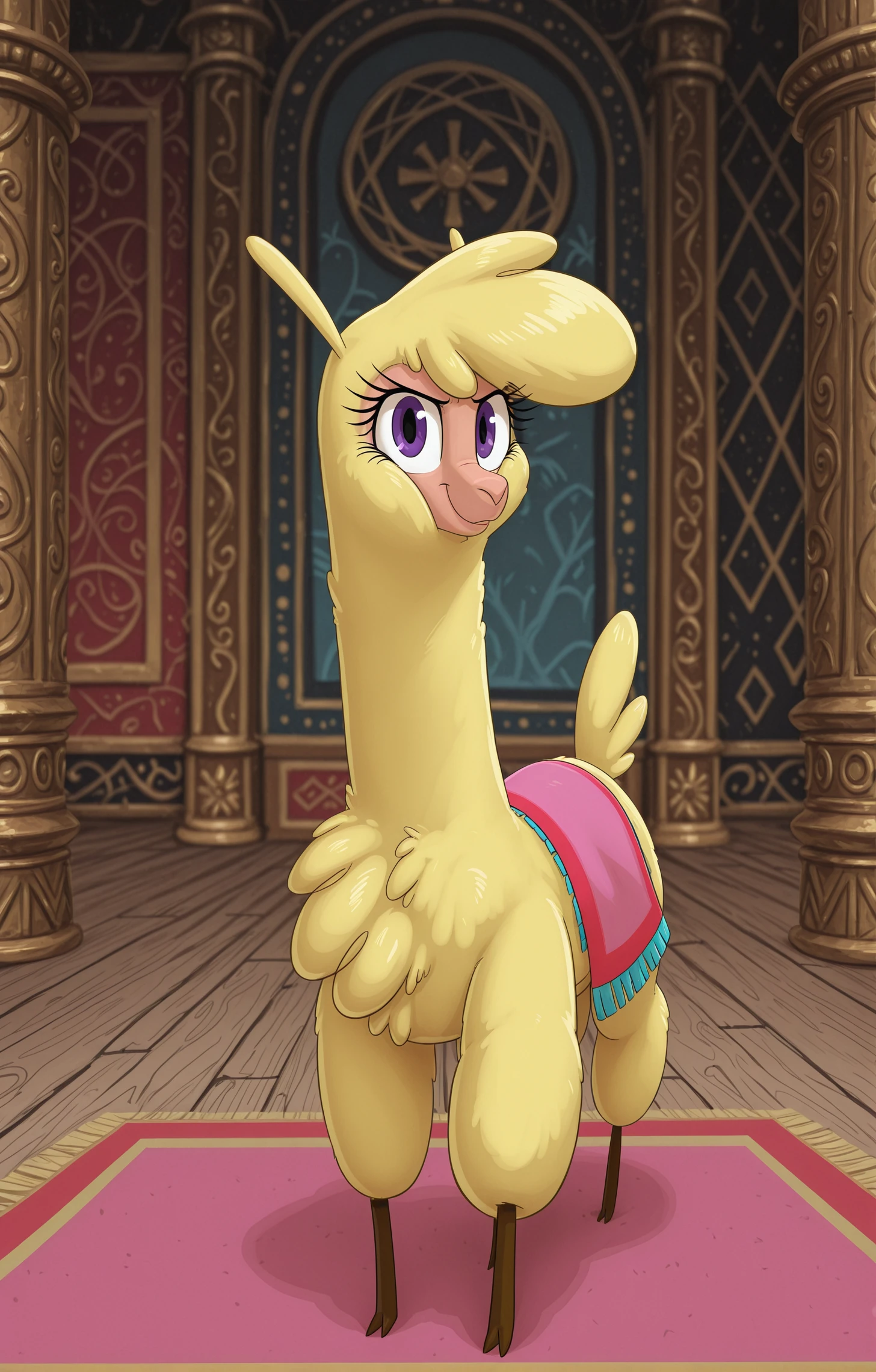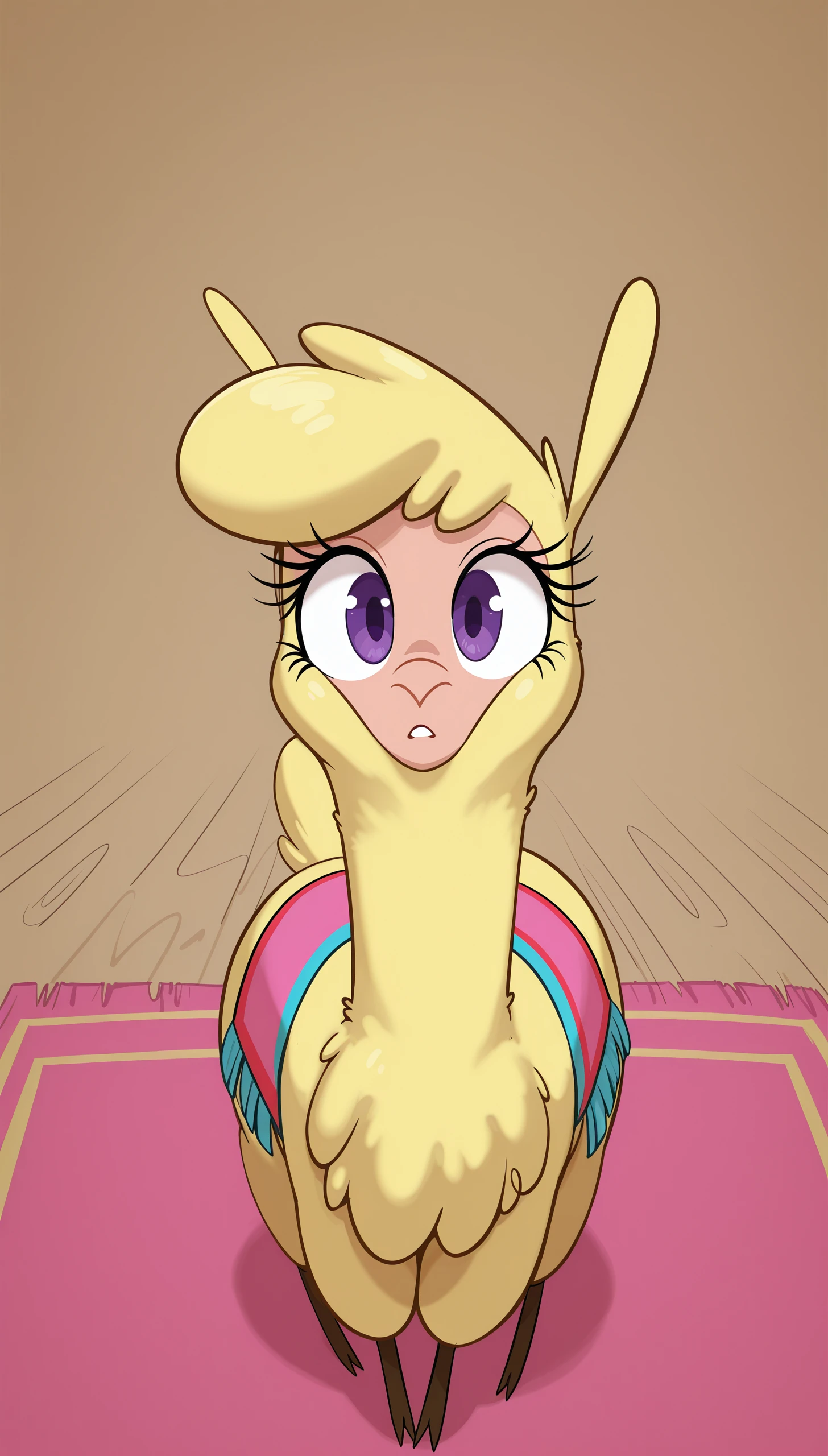 alpaca 12k23l paprika tfh, fluffy, yellow fur, brown legs, eyelashes, purple eyes,