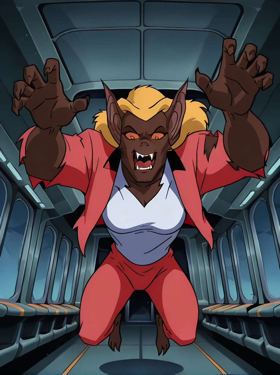 Half Transformed and/or She-Bat: bat ears, fangs, torn clothes, torn shirt, orange sclera