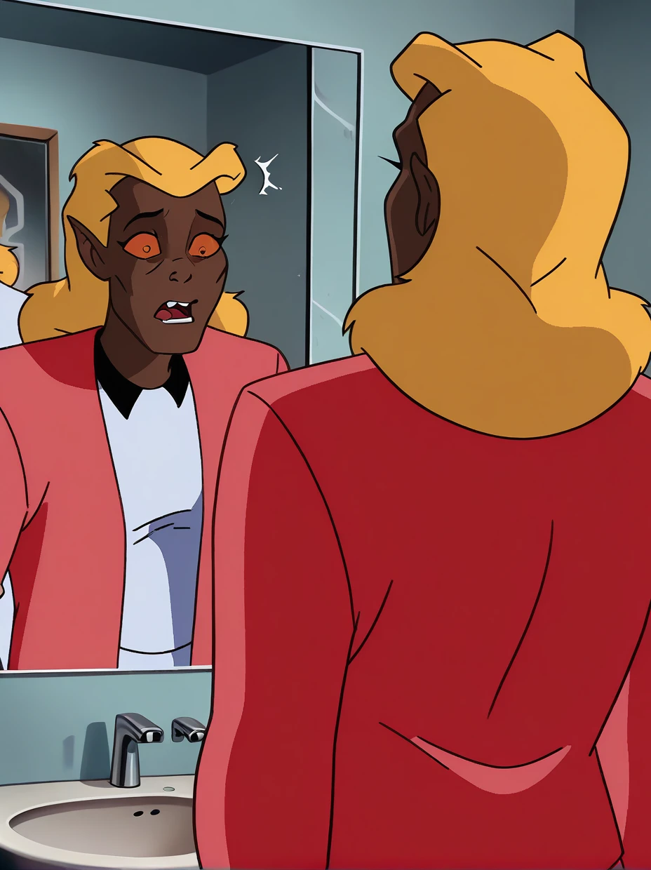 htbtas - this is the "half transformed" appearance from the airplane bathroom scene at the ?????? of the episode. Still has blonde hair and human arms, but with brown skin, orange eyes, fangs, and claw-like hands.