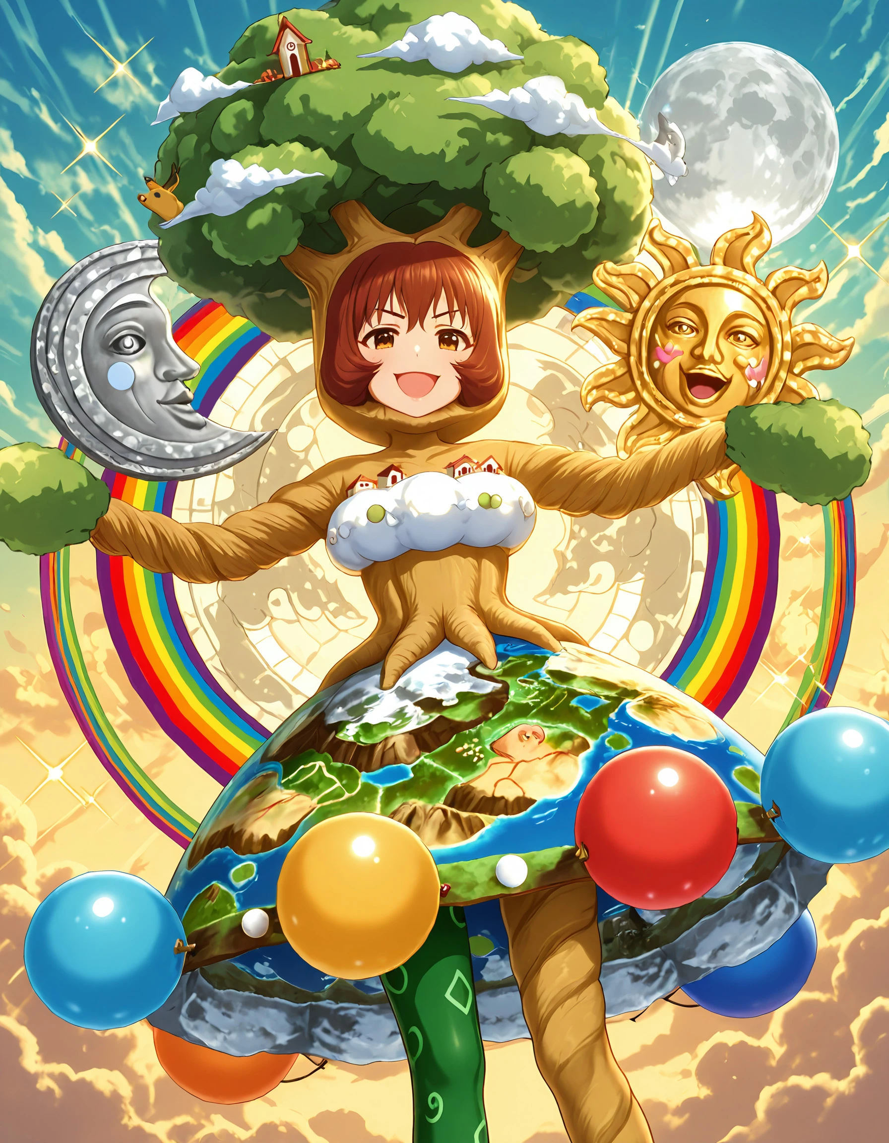 ssr1costume, tree costume, (moon with face:1.4), sun with face, rainbow circle, map print skirt, balloon, multicolored balloons, leggings, asymmetrical legwear, multicolored leggings, Note that "moon with face" is weighted up -- this is intentional as the lora likes to do two suns instead (presumably because it has more booru presence).