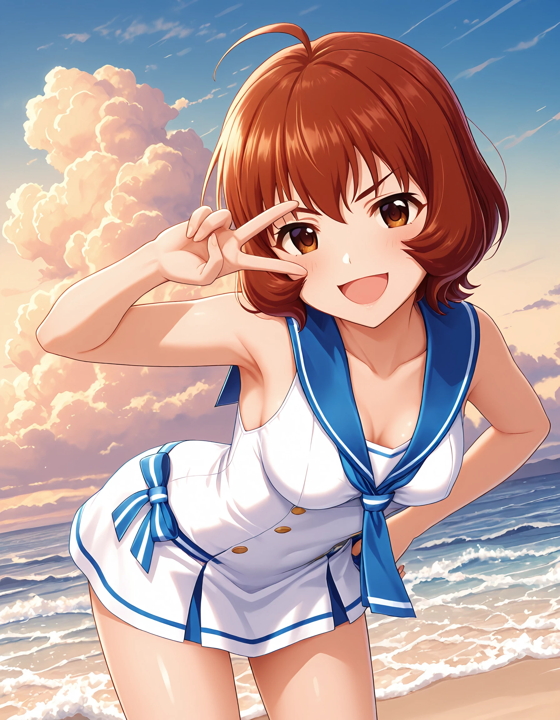 cgsuzuho, brown eyes, brown hair, red hair, short hair, ahoge,Her fabulous "World Tree" SSR also has its own tag: ssr1costume. The full ensemble: