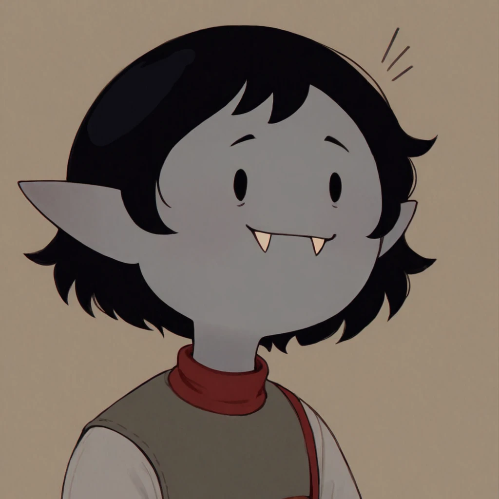 grey skin, black hair, short hair, dot eyes, fangs, pointy ears