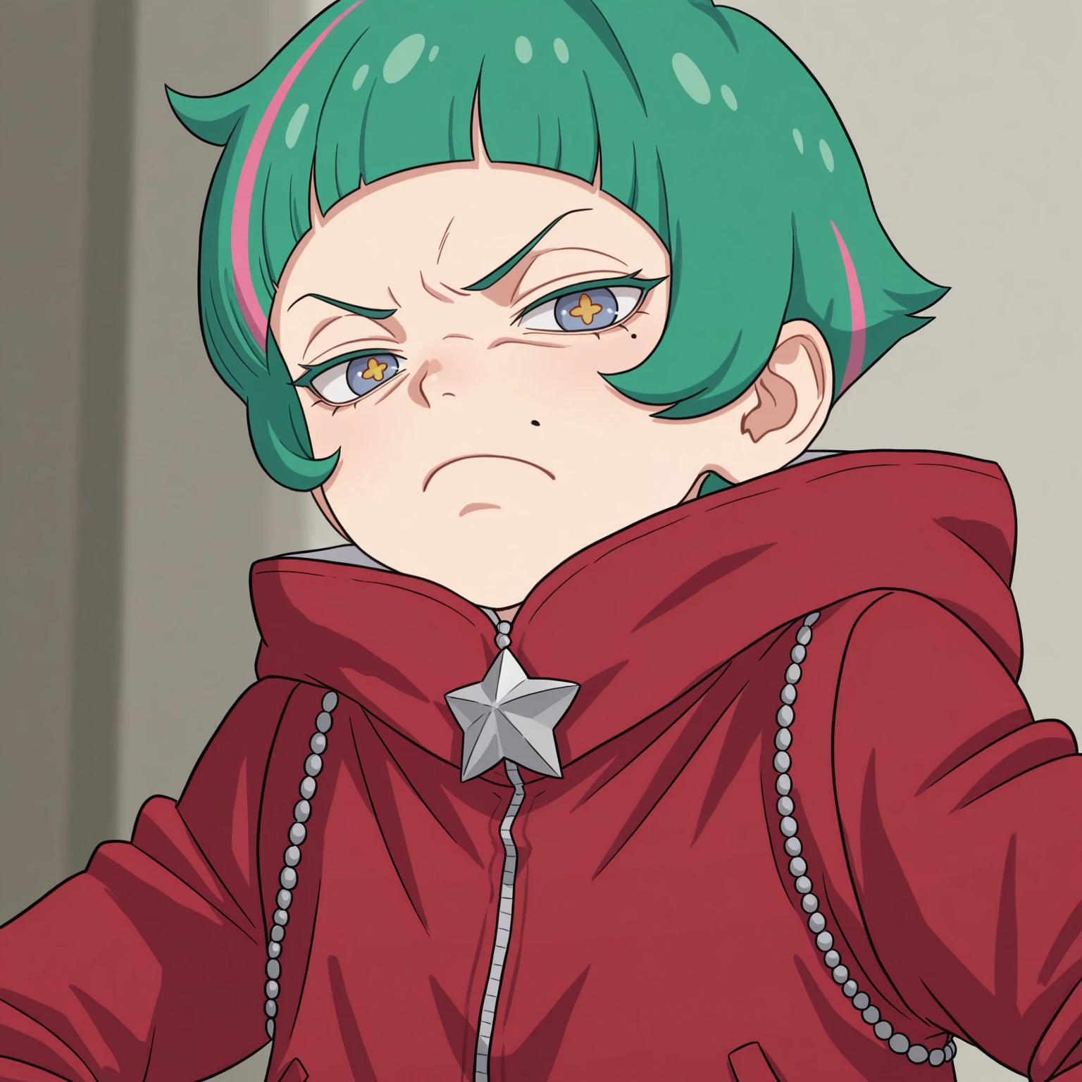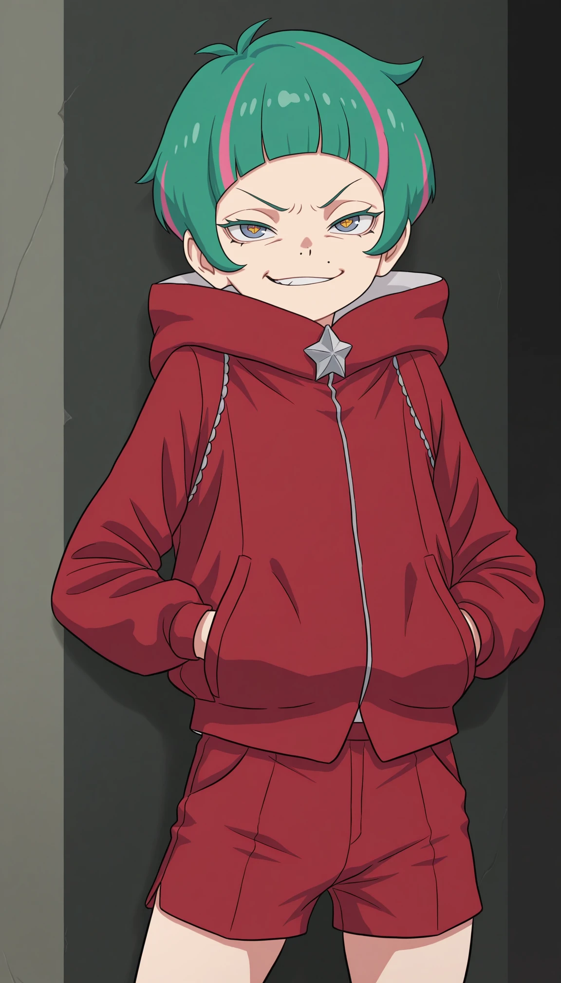 da3mon, 1boy, green hair, short hair with long locks, streaked hair, blunt bangs, symbol-shaped pupils, mole above mouth, red jacket, hooded jacket, red shorts