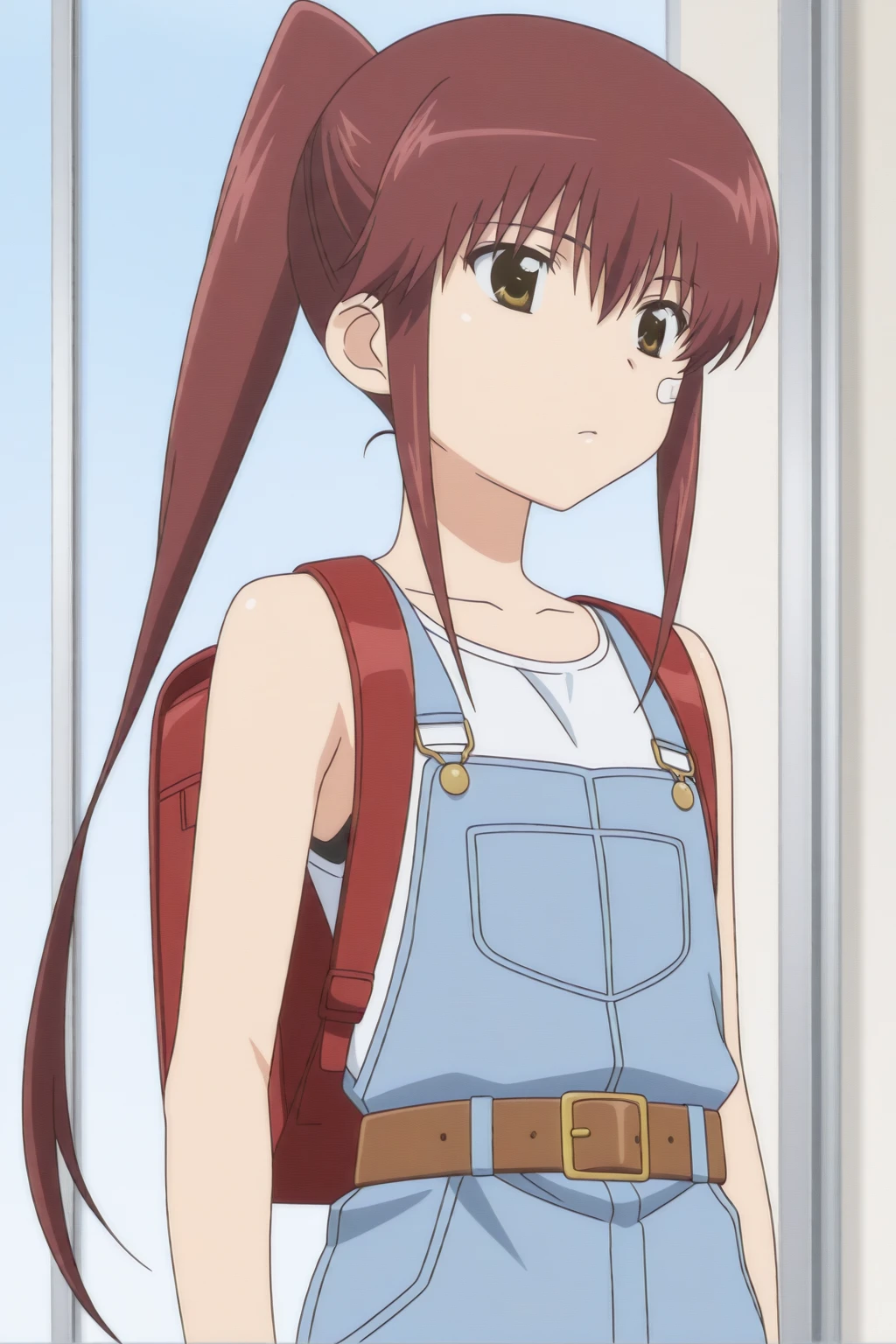 backpack, bag, bandaid on face, belt, long hair, overalls, ponytail, tank top