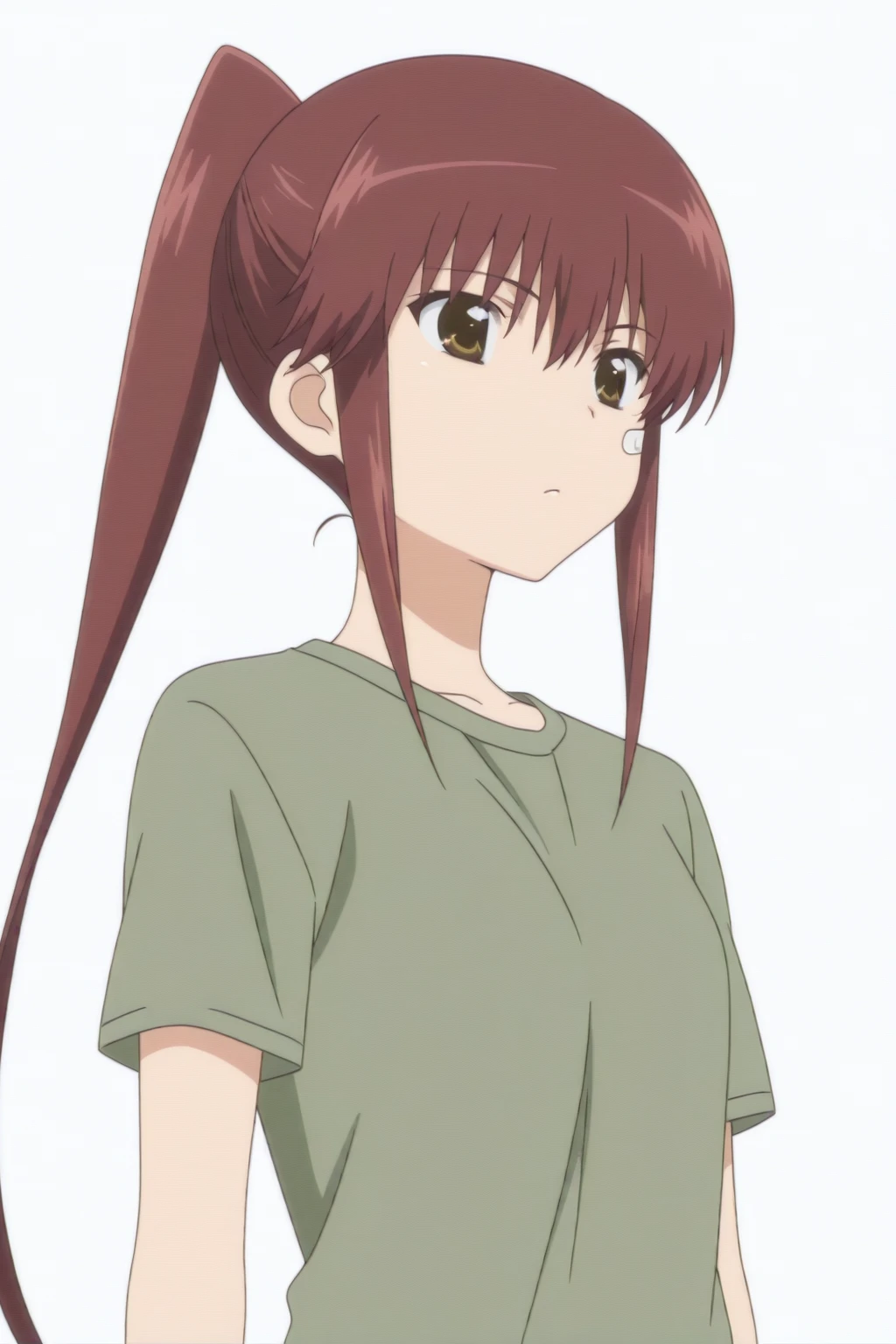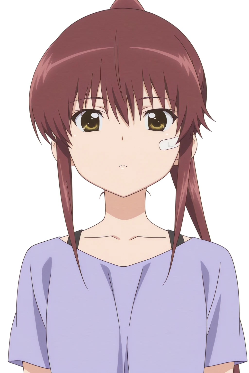 bandaid on face, green shirt, long hair, ponytail, short sleeves, sidelocks, t-shirt