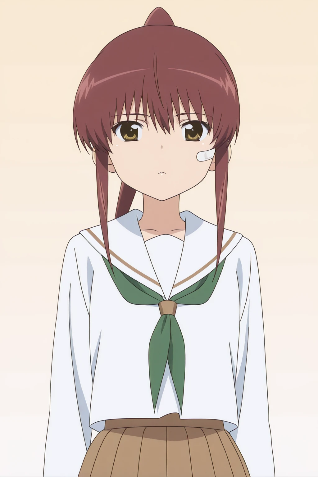 bandaid on face, green neckerchief, long hair, long sleeves, ponytail, school uniform, serafuku, skirt, white shirt