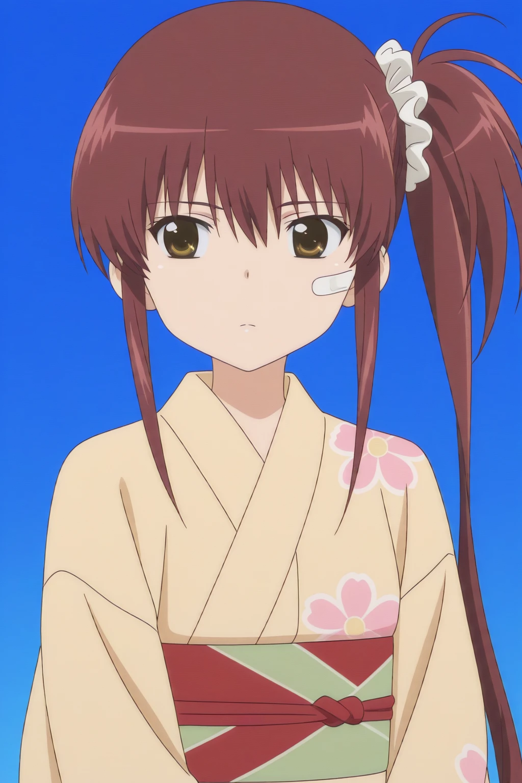 bandaid on face, floral print, long hair, long sleeves, scrunchie, side ponytail, yukata