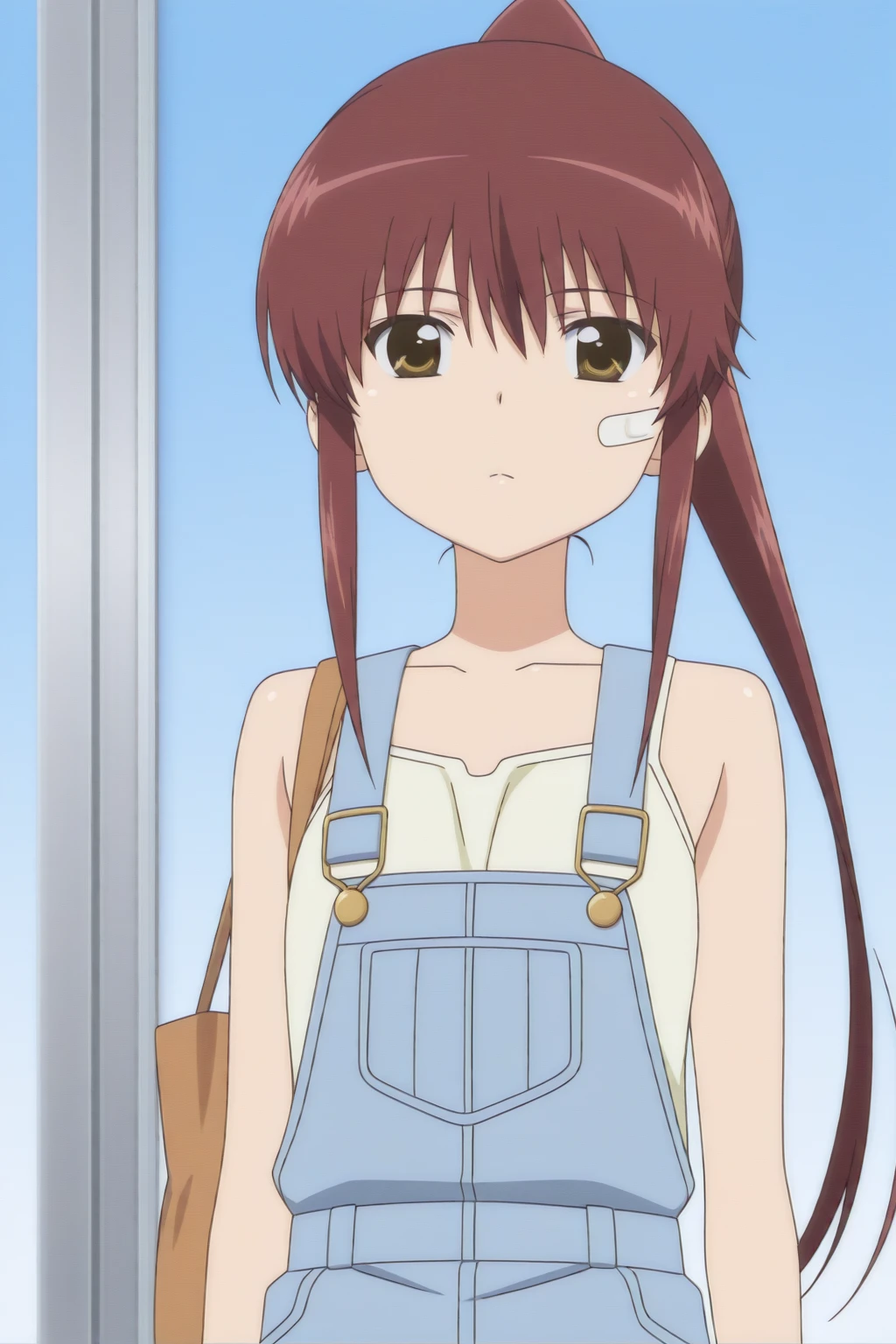 bag, bandaid on face, bare shoulders, long hair, overalls, ponytail