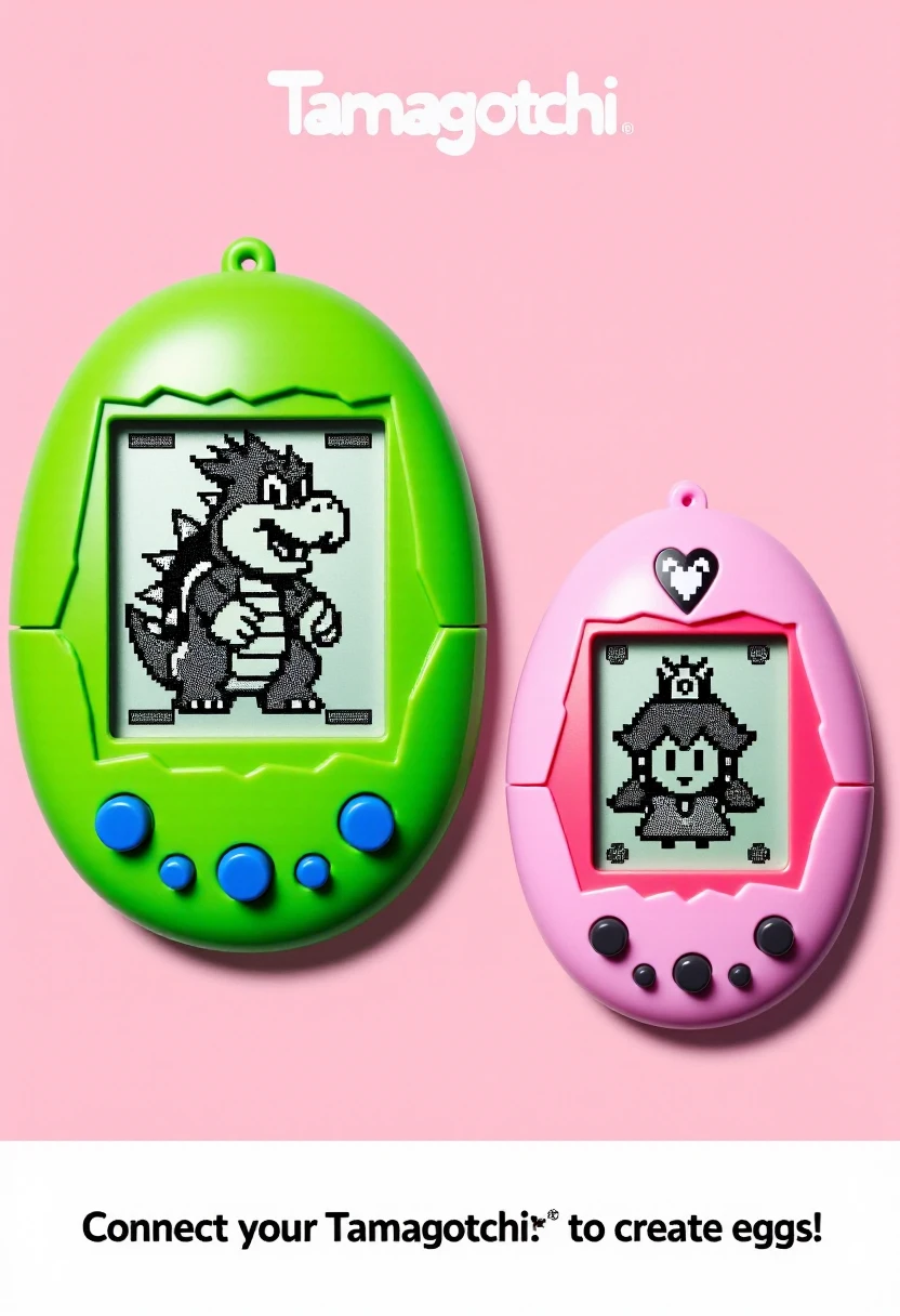Next to the Tamagotchi is a (COLOUR) Tamagotchi, displaying a black and white pixelated image of (SUBJECT).[custom screen frame / button colours]