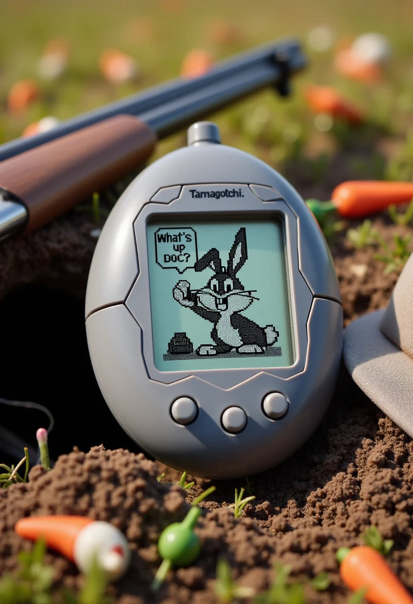The image is a high-quality photograph of a (COLOUR) Tamagotchi, displaying a black and white pixelated image of (SUBJECT). The device is located in (LOCATION).