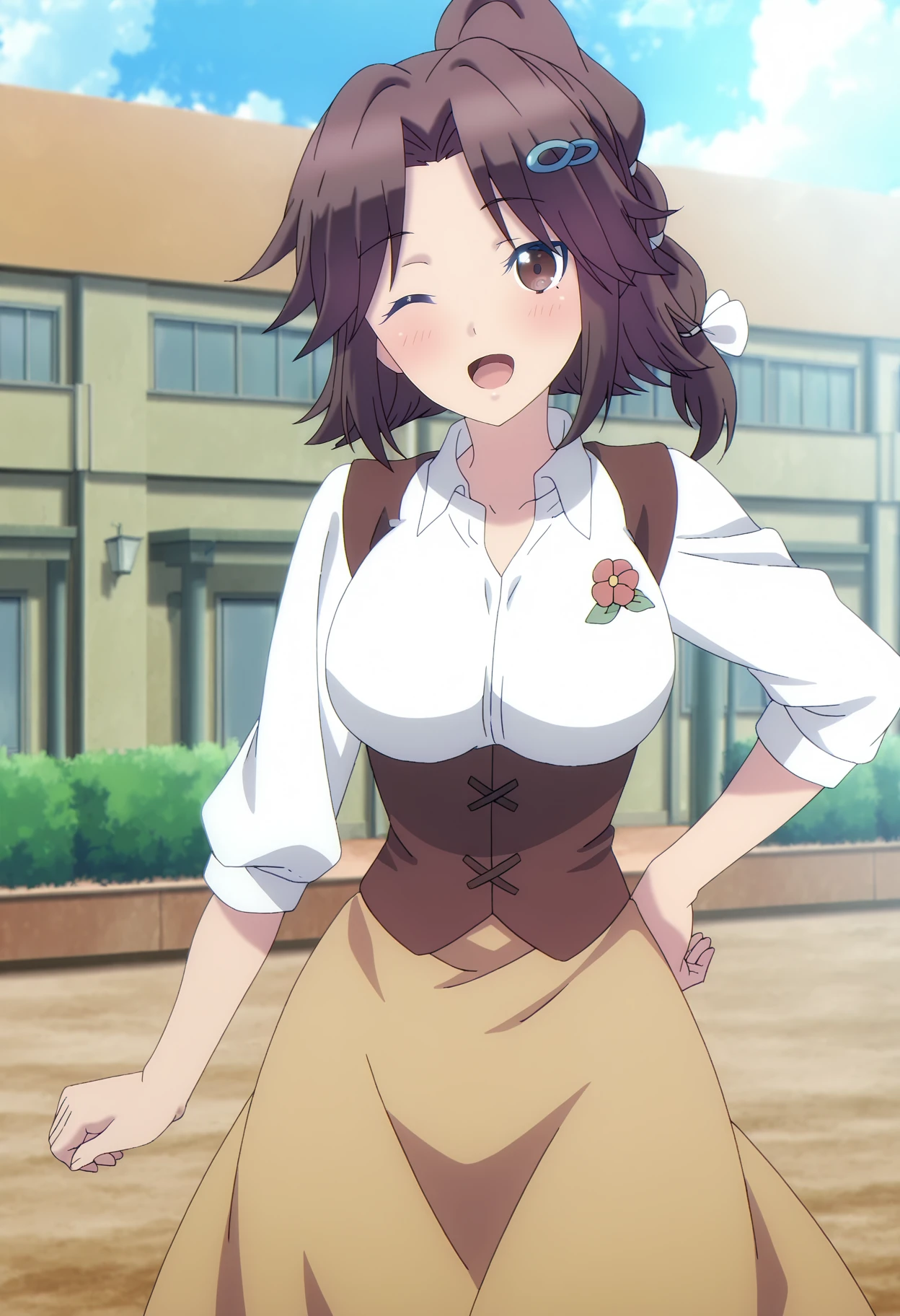 Outfit: martha (character), casual (outfit), 1girl, brown eyes, brown hair, medium hair, blue hairclip, ponytail, white hair bow, dirndl, white shirt, collared shirt, red flower, brown bodice, brown skirt, shoes