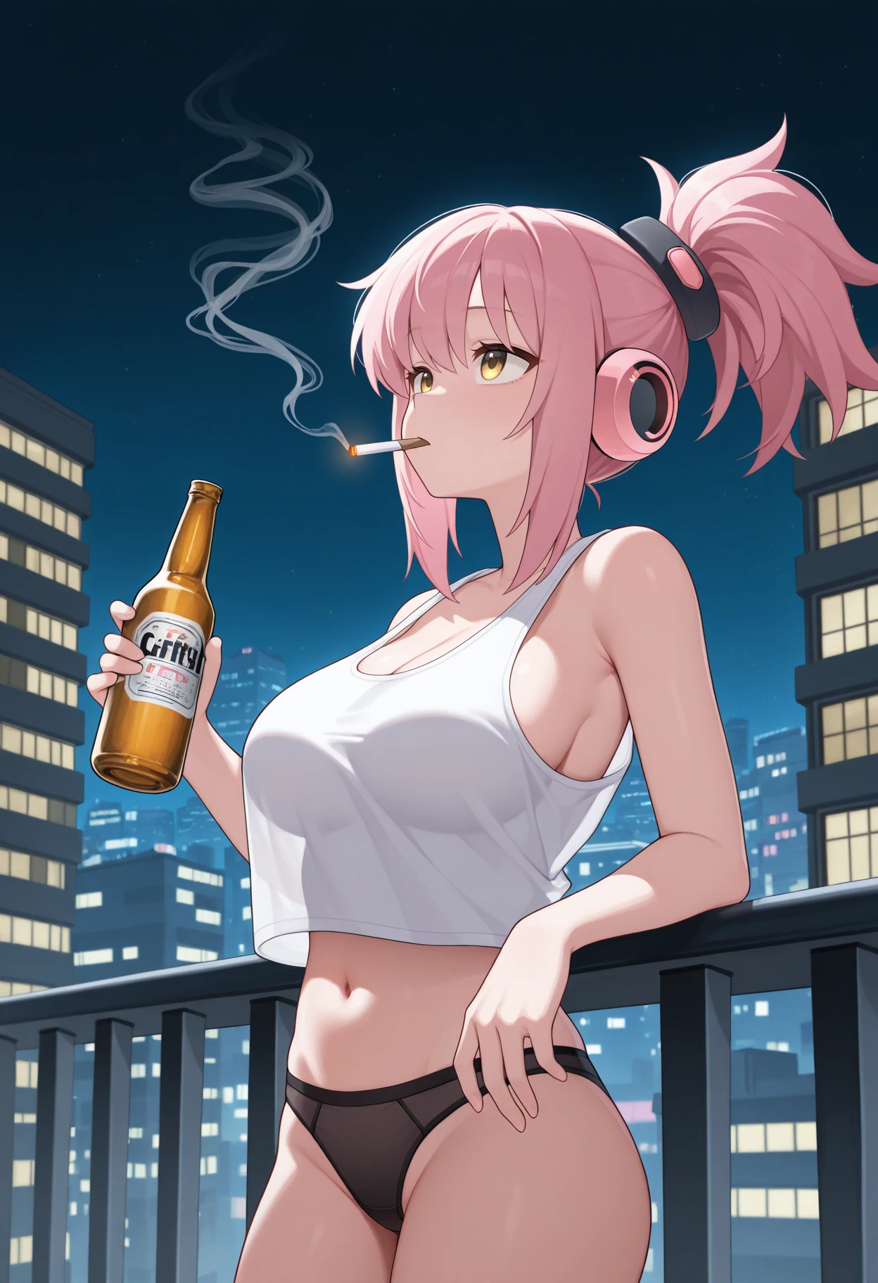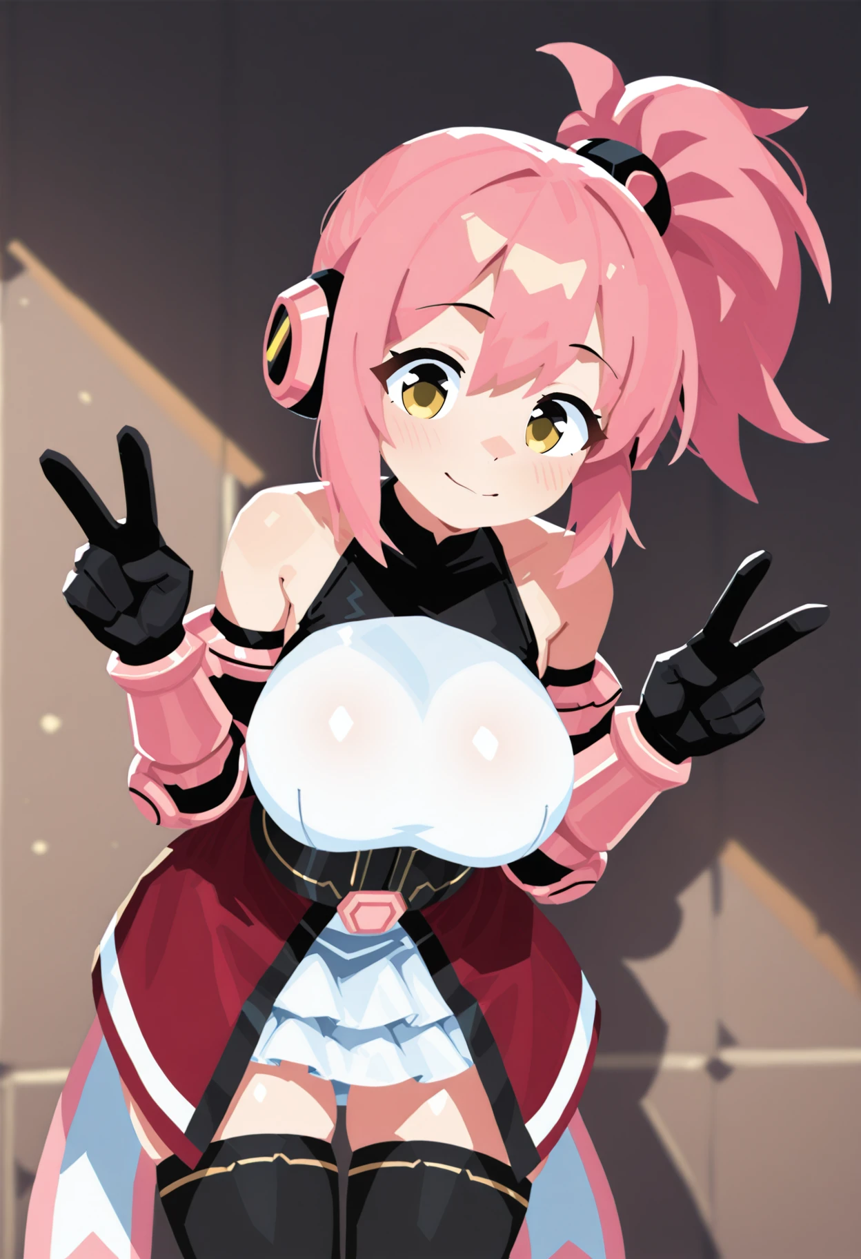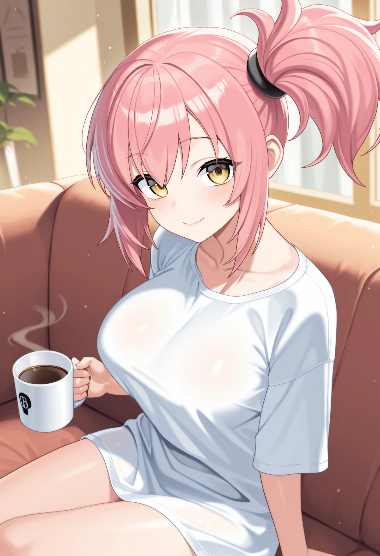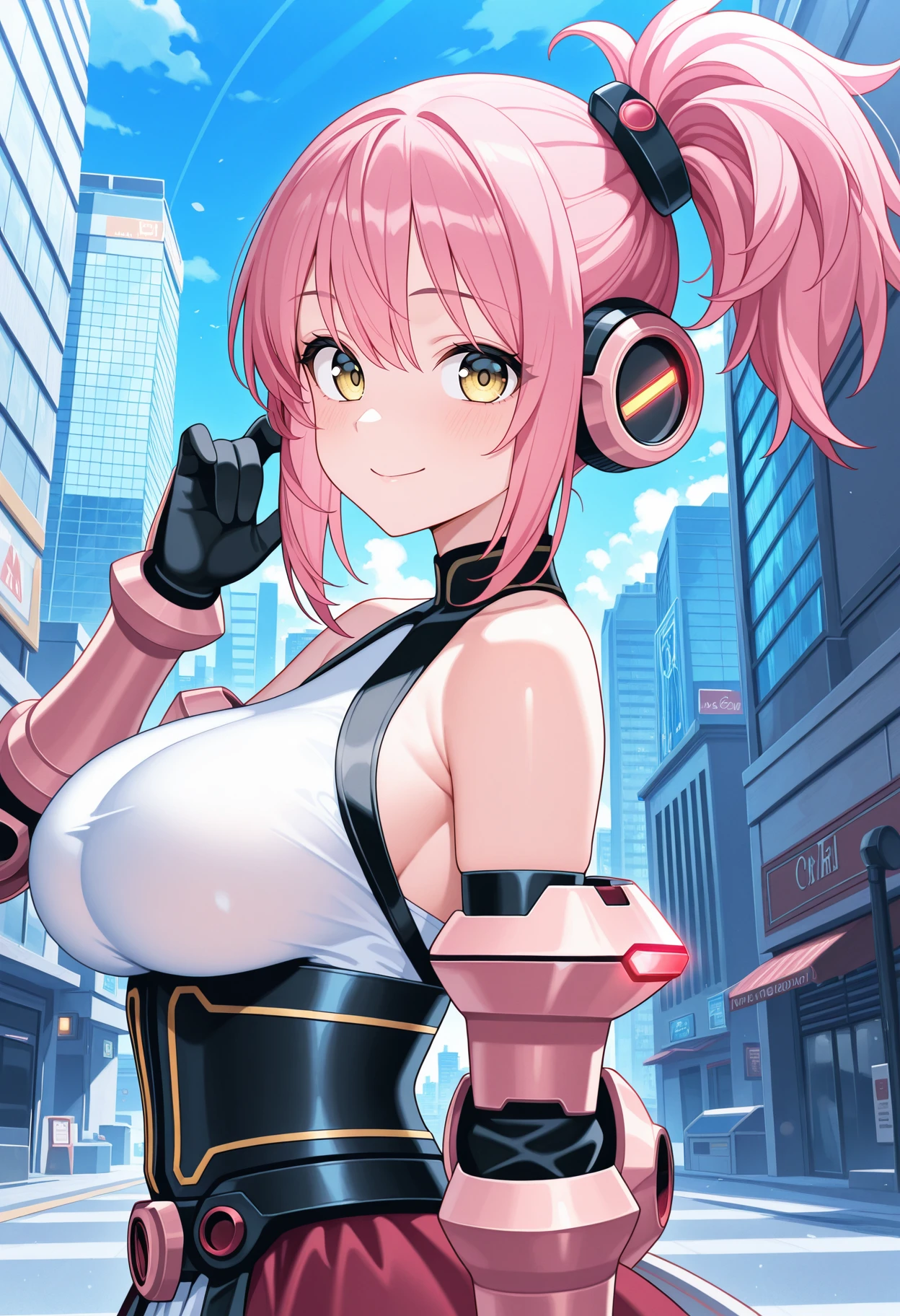- cb-melfi, pink hair, side ponytail, hair tie, yellow eyes, large breasts,