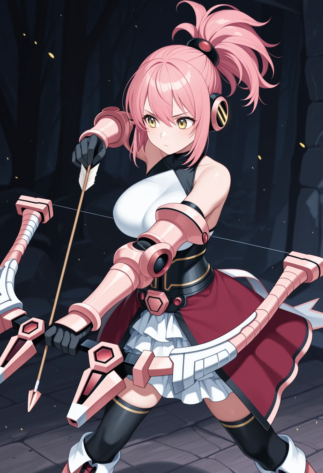 - cb-melfibased, pink ear protection, dress, bare shoulders, armor, pink arm guards, black thighhighs, black gloves, layered skirt, pink boots, knee boots, criss-cross straps,