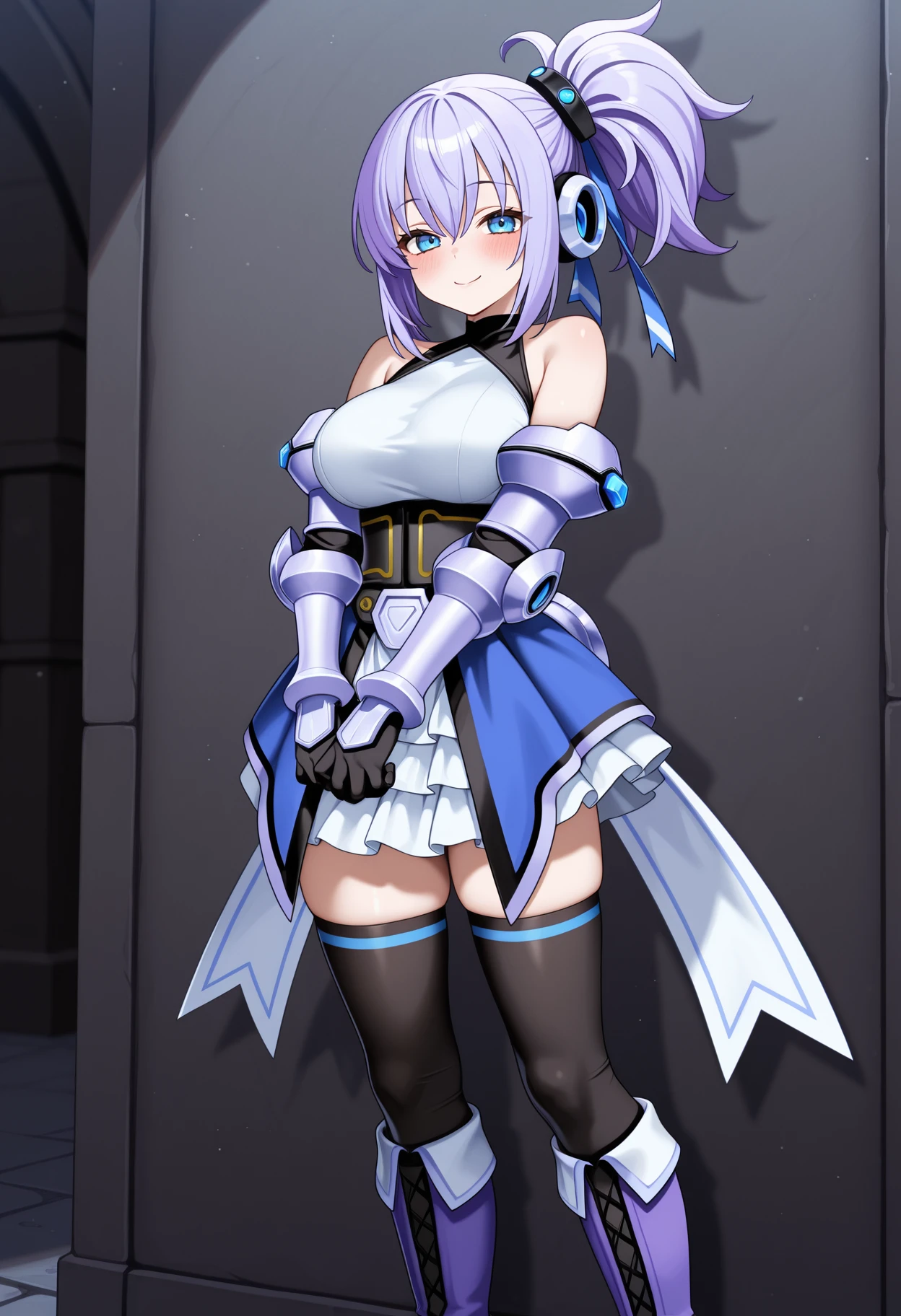 - cb-melfiheart, white ear protection, hair ornament, hair ribbon, dress, bare shoulders, armor, purple arm guards, black thighhighs, black gloves, purple boots, knee boots, criss-cross straps,