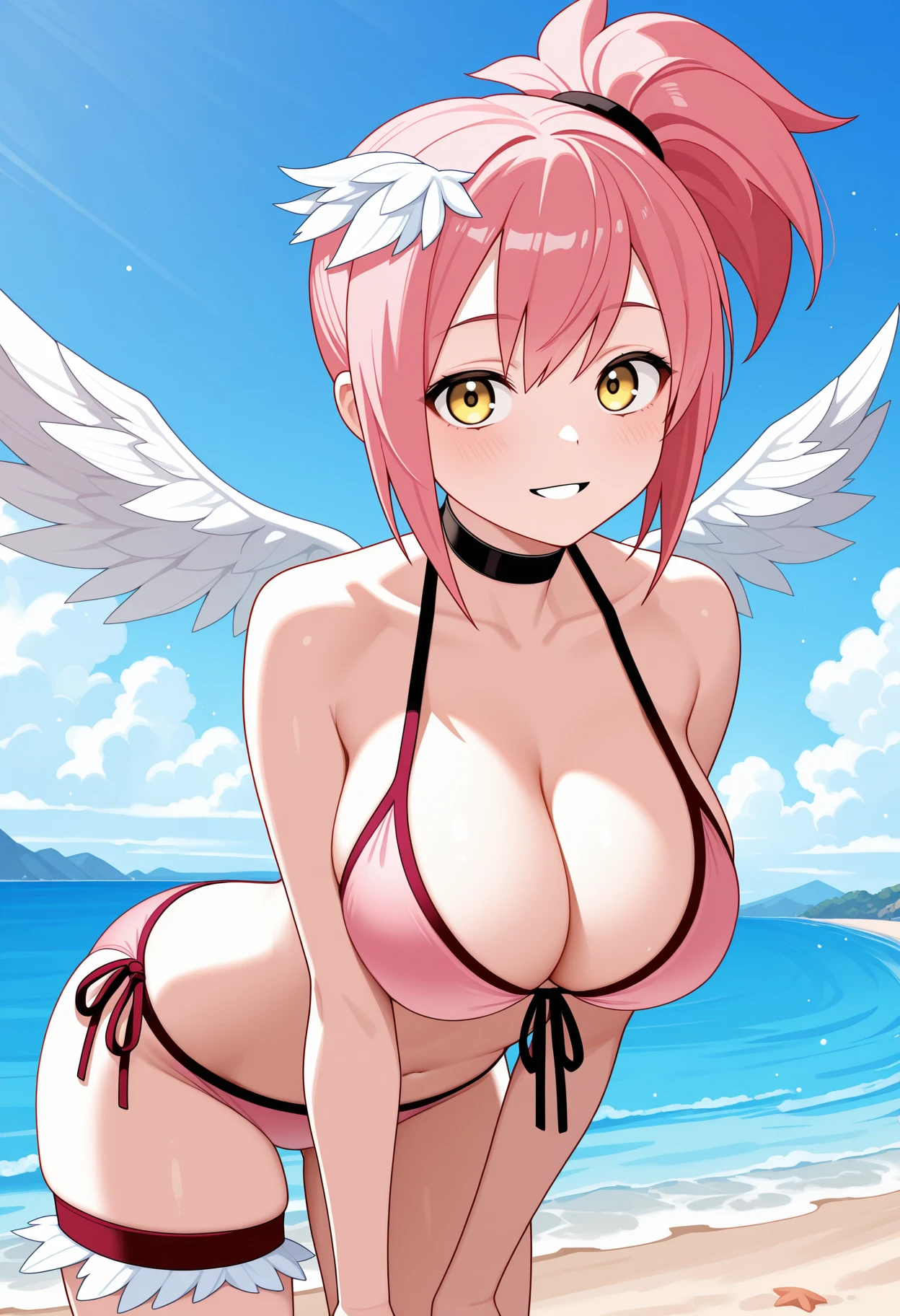- cb-melfiprincipal, feather hair ornament, choker, pink bikini, front-tie top, side-tie bikini bottom, navel, wings, cleavage, red bridal garter, sandals, ankle lace-up, asymmetrical anklet, gold anklet,