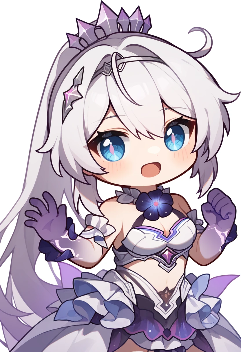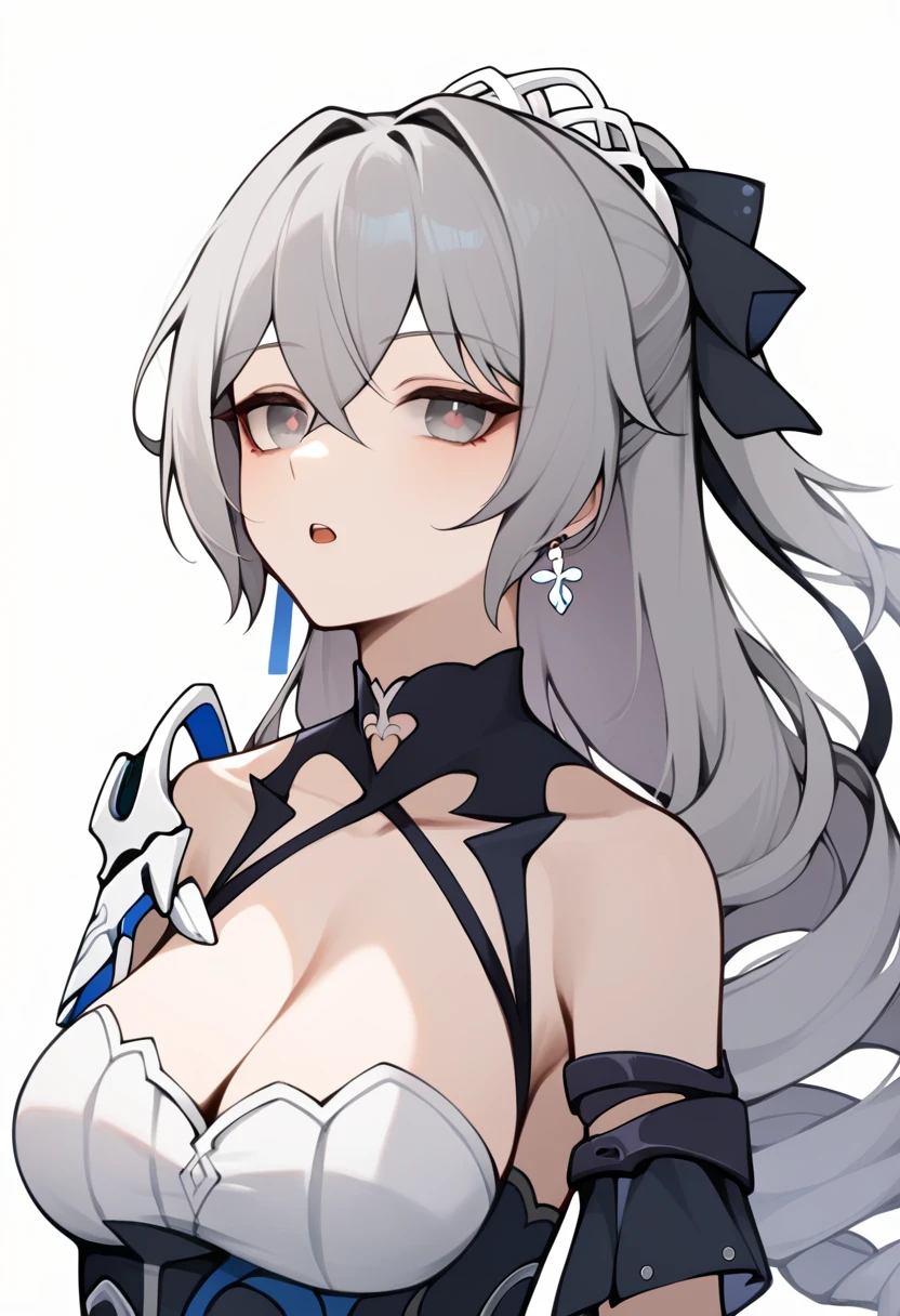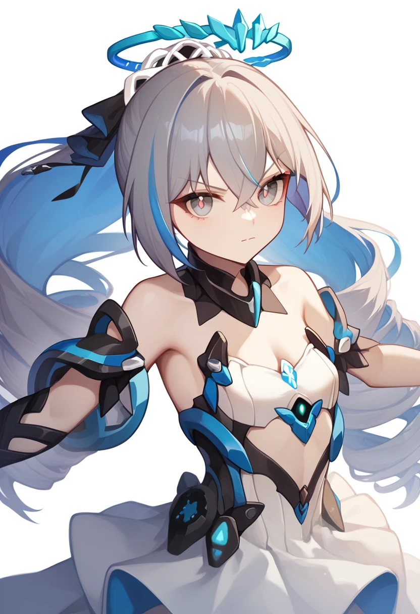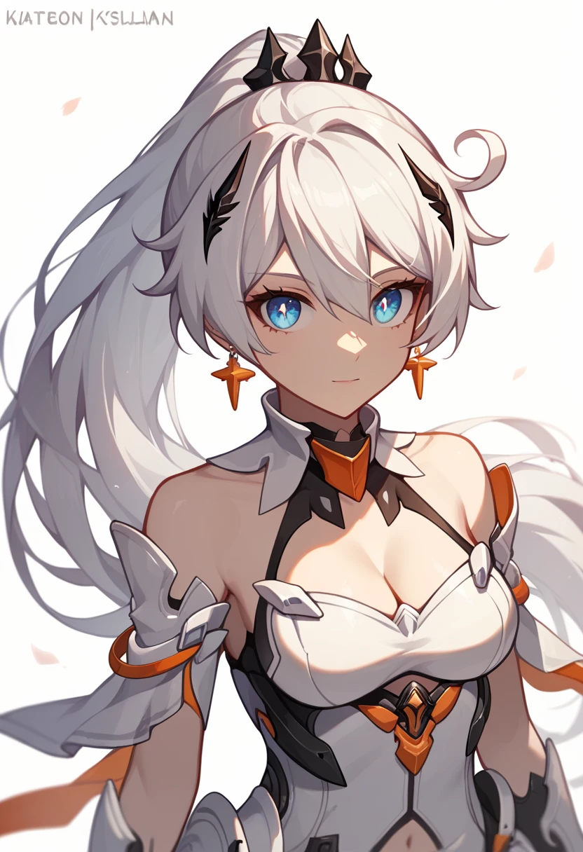 kiana_kaslana_(white_comet),silver hair,very long hair,twin braids,ahoge,bangs,blue eyes,medium breasts,bodysuit,hairband,cleavage cutout,hair ornament,Introduced in Part 2