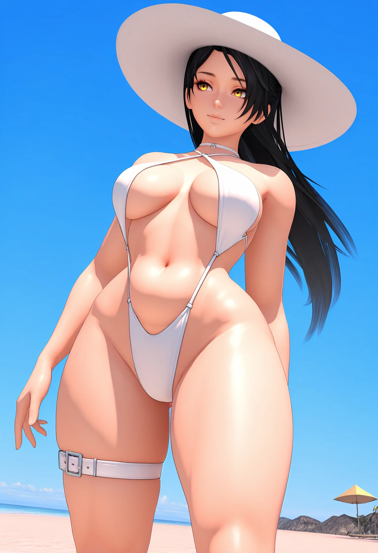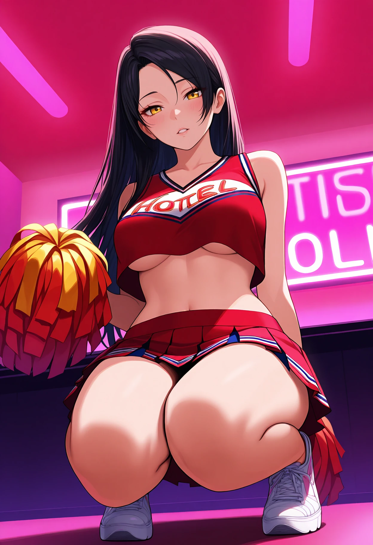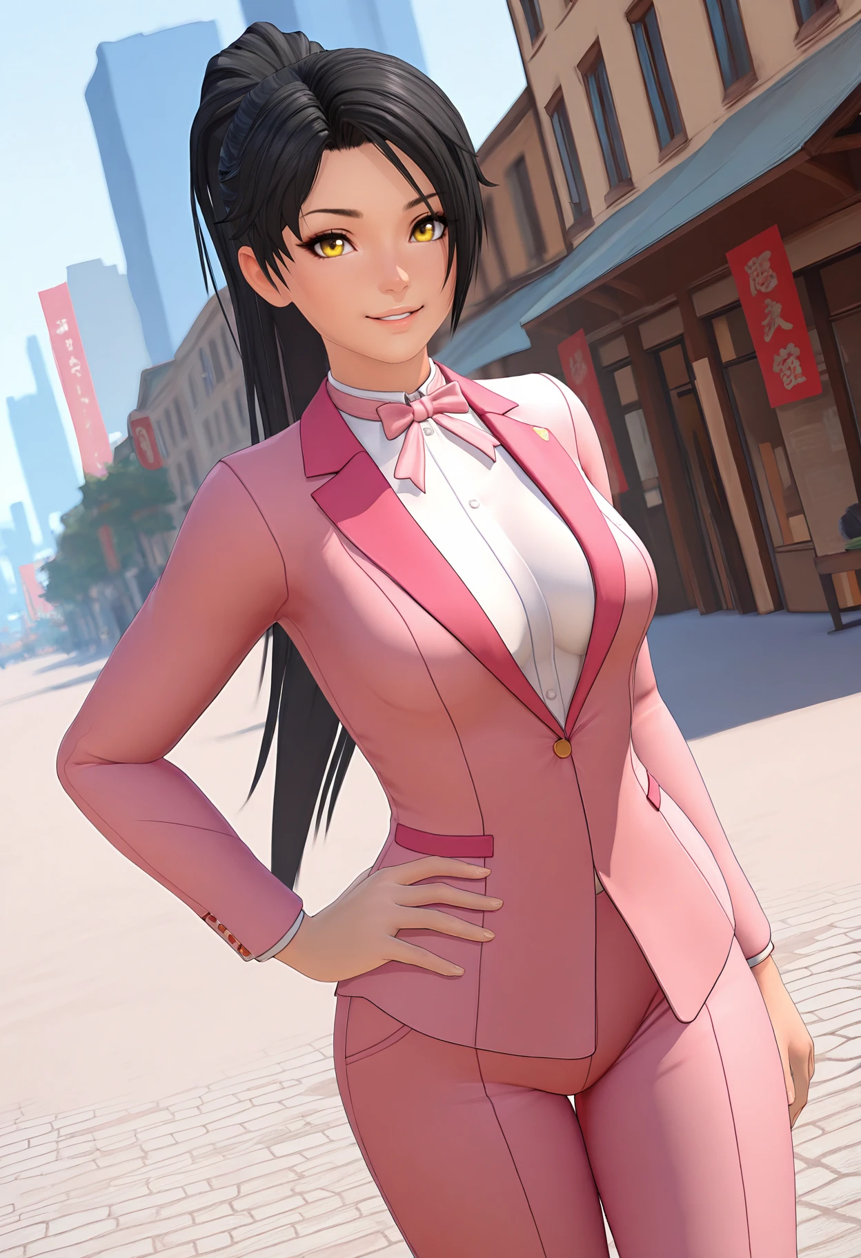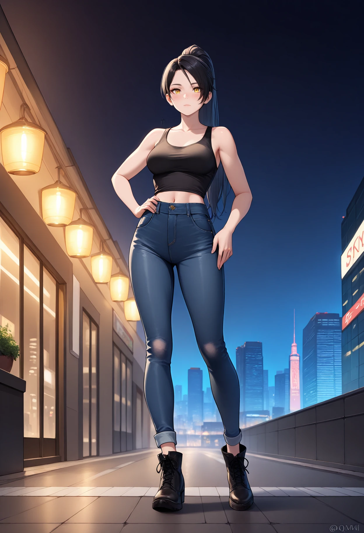 KJOmomiji, black hair, long hair, bangs, yellow eyes, ponytail,