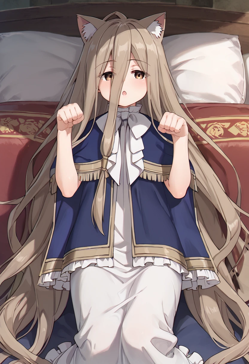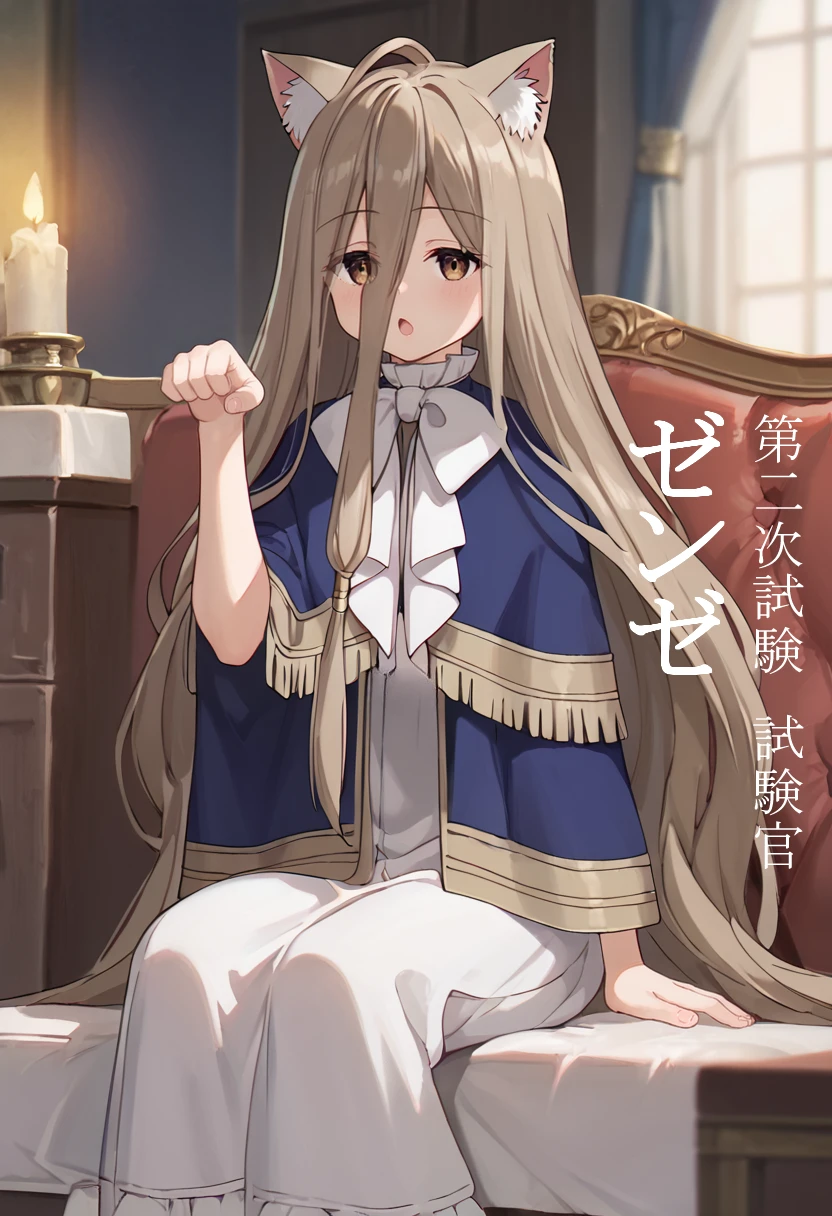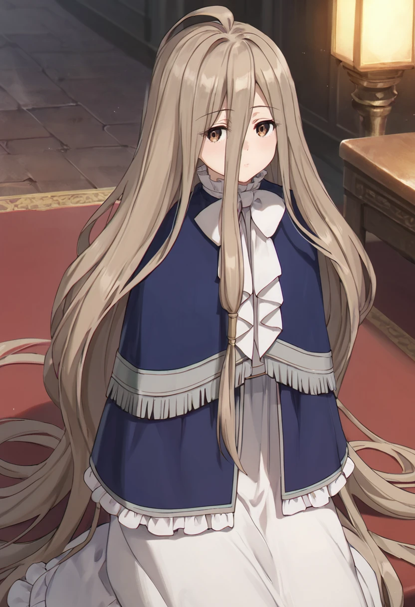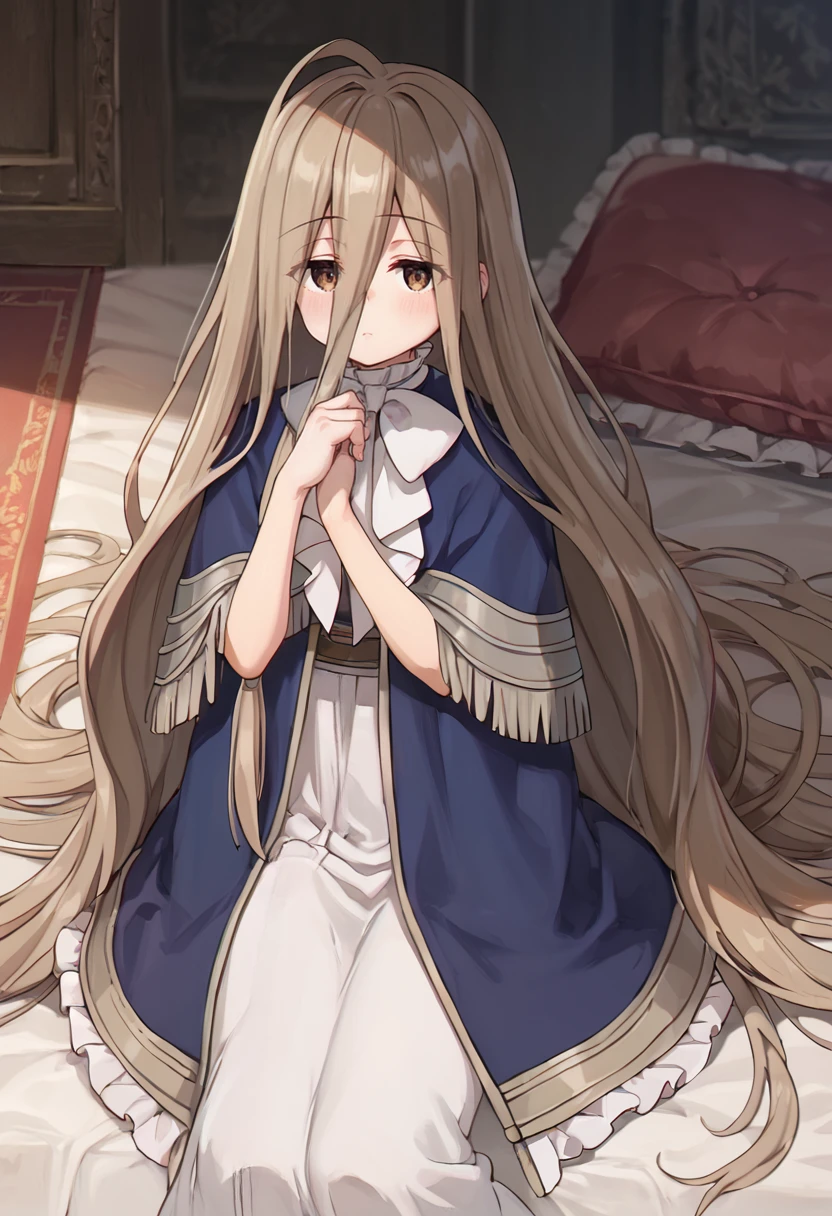 sense \(sousou no frieren\),brown eyes,very long hair,absurdly long hair,hair between eyes,eyes visible through hair, blue capelet,frilled dress,white long dress