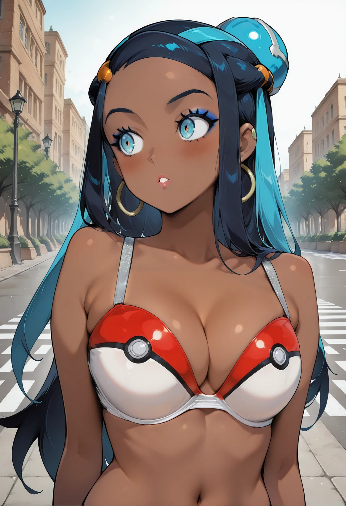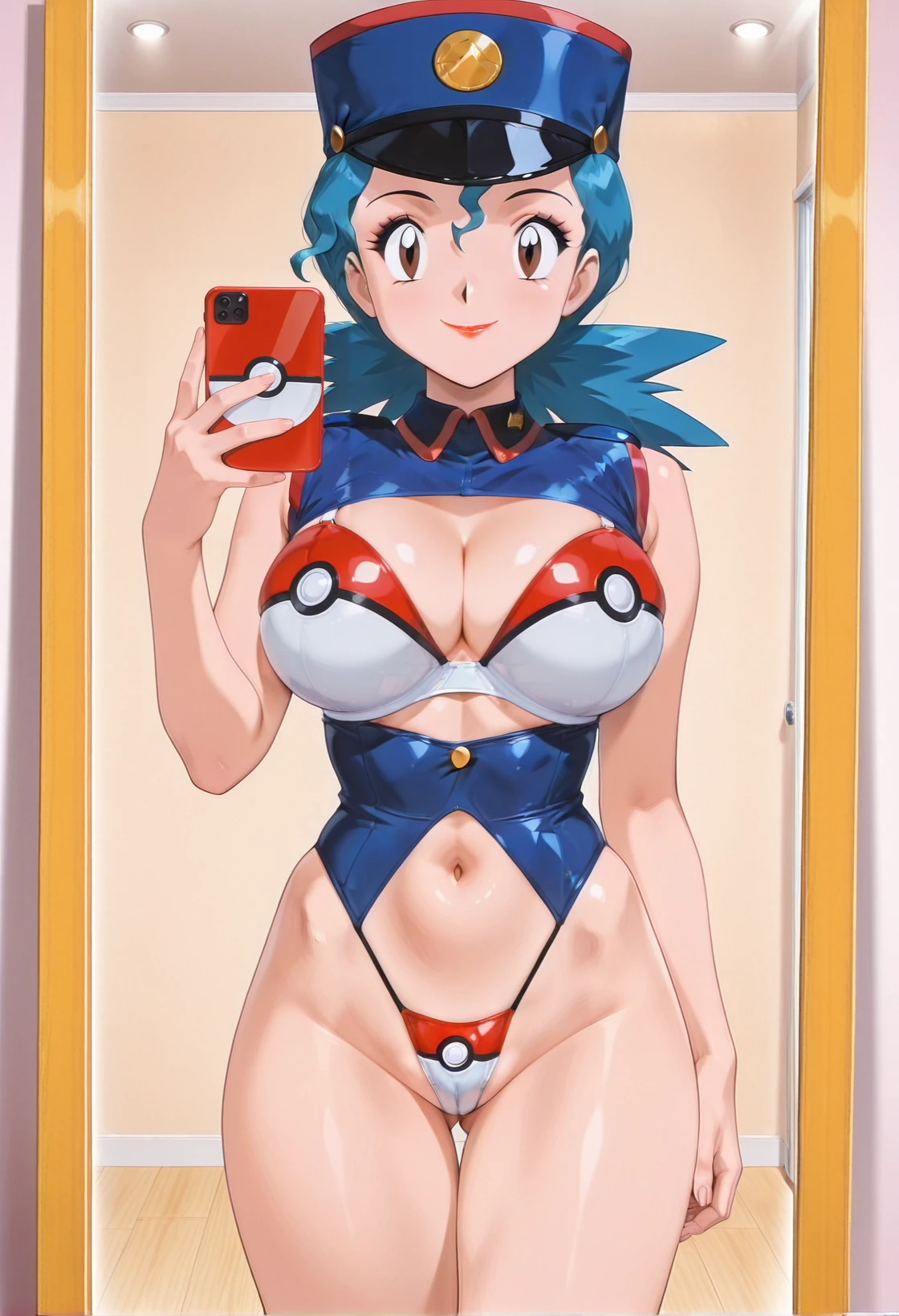Suggested tags: wearing a pokeball bra or wearing a Pokeball-themed one-piece swimsuit, cleavage, <size breasts>